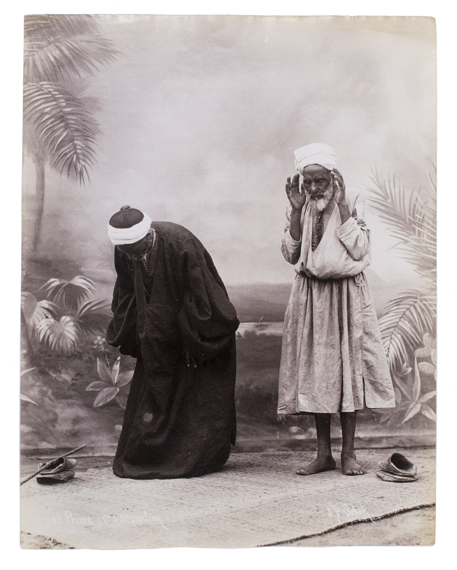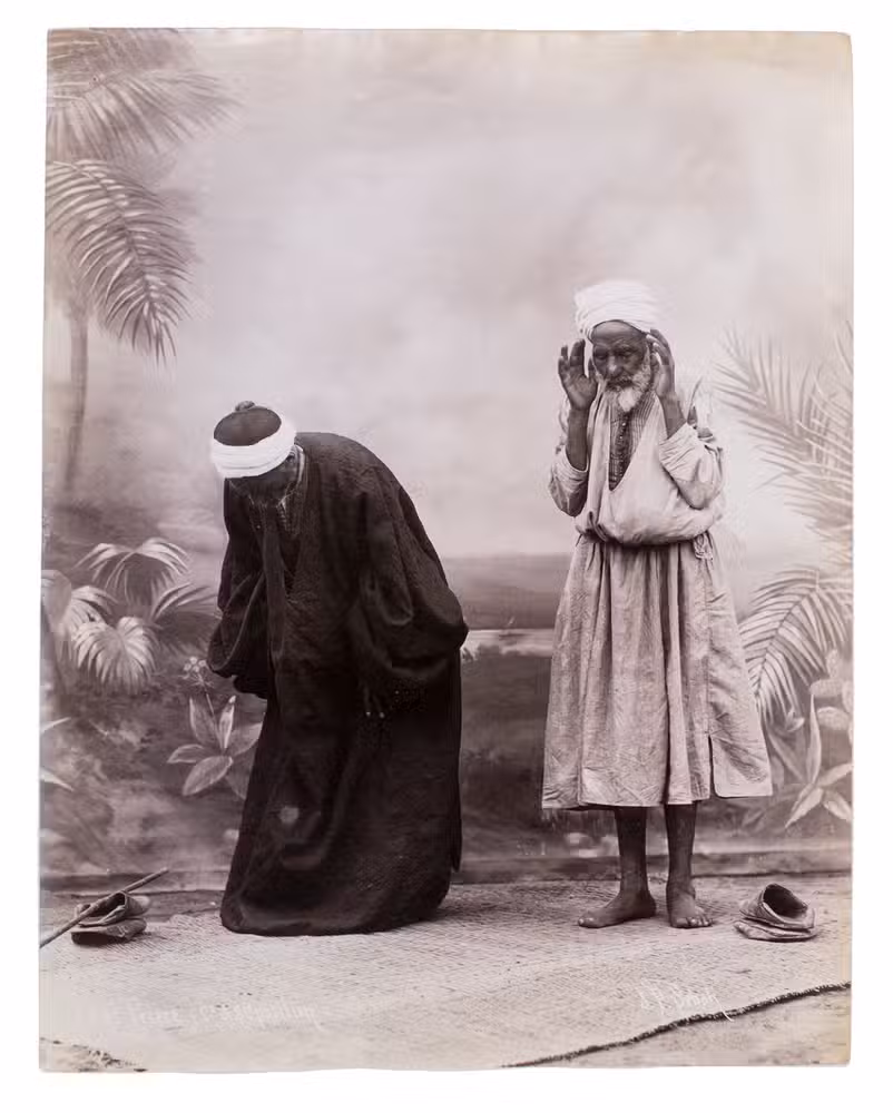 Two beautiful photographs by Jean Pascal Sébah (1872-1947), one of the most famous photographers of his time, who specialised in Orientalist photography. He continued the business of his father Pascal Sébah (1823-1886), one of the first photographers working in Egypt. Apart from their photographs of important locations in the Middle East, the Sébahs were known to stage genre scenes, which were used as illustrations in scientific Orientalist publications. The present photographs were likely one of those scenes. They show four Arabic men demonstrating the positions of the raka'ah. The first photographs shows the first and second position, standing and bowing, or qiyam and ruku. The second photographs shows kneeling and the beginning of prostration, or jalsa and sujud.