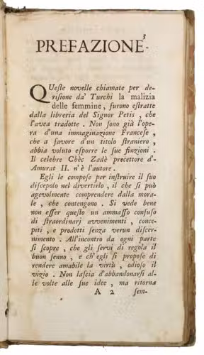 Second Italian edition of this important collection of oriental tales now known as the "Forty Viziers", first published in Italy in 1728. The first western edition, in French, appeared three years after Gallands first edition of the Arabian Nights, following its characteristic frame-narrative structure. It echoes the Biblical story of Potiphars wife, concerning a young prince who refuses the advances of his stepmother, who then denounces him to the sultan. The prince is put on trial, by means of alternate tales told by the sultana and the forty viziers. Petis de la Croix (1653-1713), dragoman to Louis XIV, attributes the Turkish original to one Chéc Zadé (Shaikhzade Ahmed Misri), tutor to the Ottoman ruler Murad II (r. 1421-51), but it is now thought that that the tales date back to an Arabic original which is no longer extant, possibly written in Egypt for the Turkic ruler al-Ikhshid (r. 935-946), and that two writers were involved in its production: "an Ahmed-i Misri [Ahmed the Egyptian] who translated the work from Arabic and presented it to Murad II, and a Sheykh Zade who took up the text later, presenting it to both Murad II and Mehmed II" (Burrill, "Sheykh-Zade", in Encyclopaedia of Islam, 2nd).