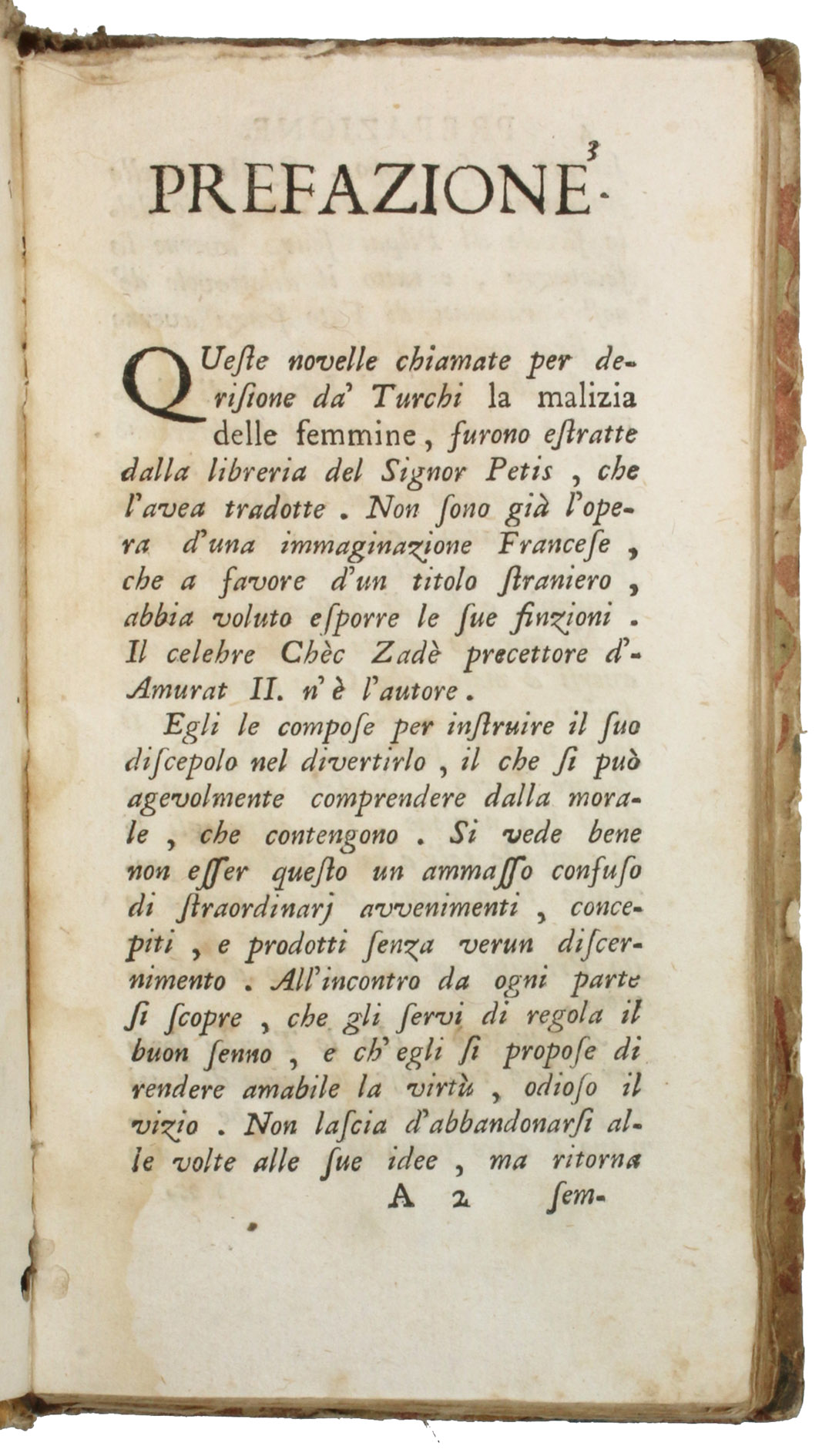The binding is slightly worn, slight worming to the first and last pages, not affecting text. Overall in good condition. OPAC SBN IT\ICCU\LO1E\019274 (3 copies); WorldCat 43201361, 603237871 (3 copies); cf. for the French edition Chauvin VIII, p. 19; Macdonald, "A Bibliographical and Literary Study of the First Appearance of the Arabian Nights in Europe", in The Library Quarterly, vol. 2, no. 4 (October 1932).