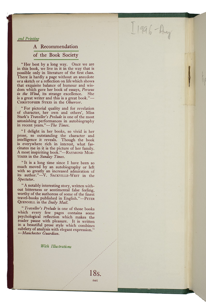 Dust jacket is somewhat damaged and partially repaired with tape, edges are untrimmed, small repair to the inner front hinge with tape. Overall in very good condition. Howgego IV, S61; cf. "Freya Stark". Encyclopaedia Britannica; (other ed.) Shapero, The Islamic World (2003), 470.
