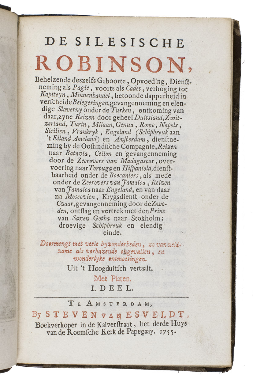 The Silesische Robinson is a very rare Dutch translation of Christian Stieffs Schlesischer Robinson Oder Frantz Anton Wentzels v. C. eines schlesischen Edelmanns Denkwürdiges Leben, first published in Breslau and Leipzig in 1723/24, one of the first pseudo Robinson works in the German language. In his preface, the author Christian Stieff (1675-1751) sets about to provide the story of an exemplary life worth emulating to the noble youth that he imagined would read his work. It tells the story of Frantzs journey from his Silesian home through Germany, Italy, the Netherlands, the Cape of Good Hope, East India, his capture and subsequent transport to Haiti as prisoner. Luckily he manages to regain his freedom and subsequently serves as seaman on board a pirate ship and journeys to England and Russia. As fantastic as the storyline sounds, Stieff managed to add plenty of details of contemporary social life and even political policy in Europe, such as the measures taken against the spread of of the plague in Vienna. Stieff was a respected school rector and poet from Breslau.