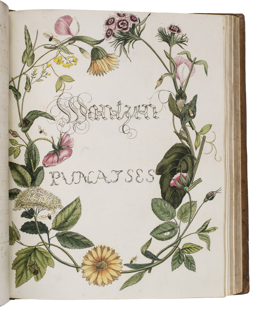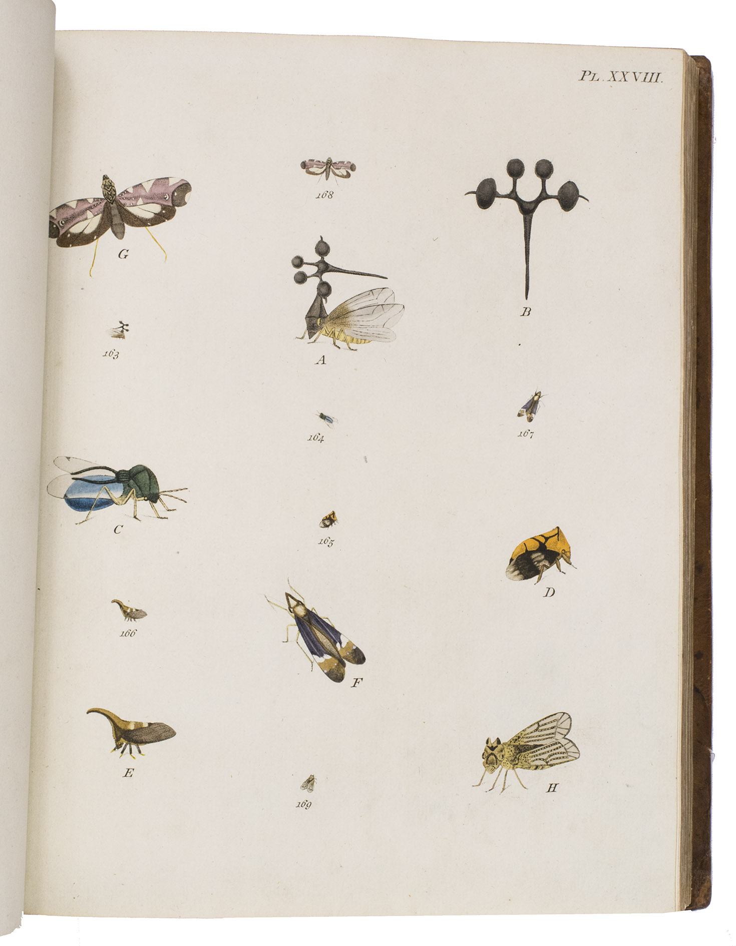 Amsterdam, J. C. Sepp, 1788. 2 parts in 1 volume. 4to (ca. 28.5 x 23 cm). With 70 hand-coloured plates of insects, and a hand-coloured floral frontispiece at the start of each part. Contemporary gold-tooled brown calf.  124; 172 pp.