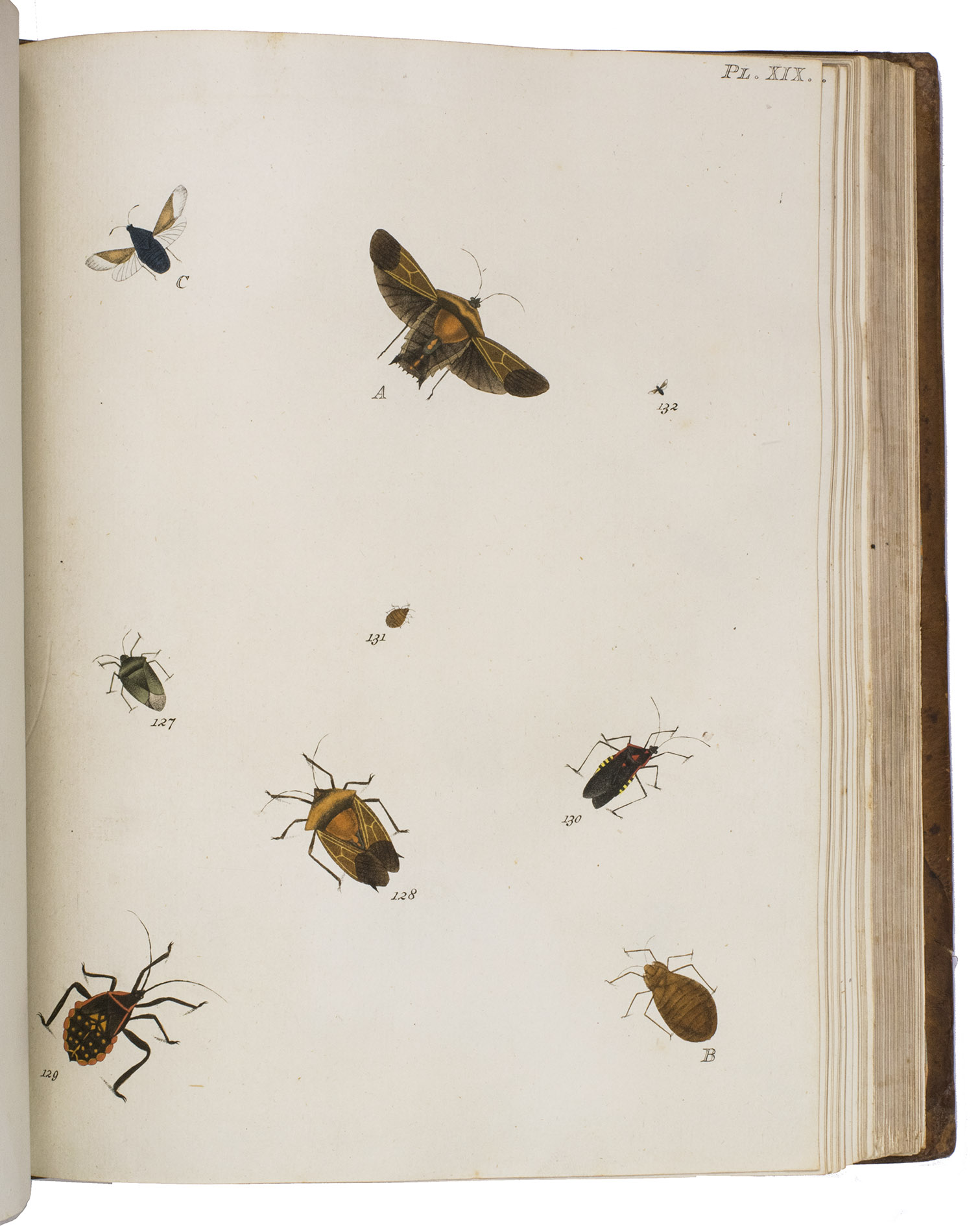 First edition of a beautiful, complete set of an important scientific work on insects, with 70 contemporary hand-coloured plates. It describes the Cicadidea and Heteroptera found in all parts of the world, especially in Suriname, Indonesia, South Africa and the Coromandel coast. It is the first serious scientific work ever published on insects of the order of Hemiptera. The illustrations, which show more than 450 insects in great detail, form the main part of the work and are accompanied by descriptions in Dutch and French.