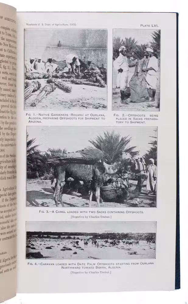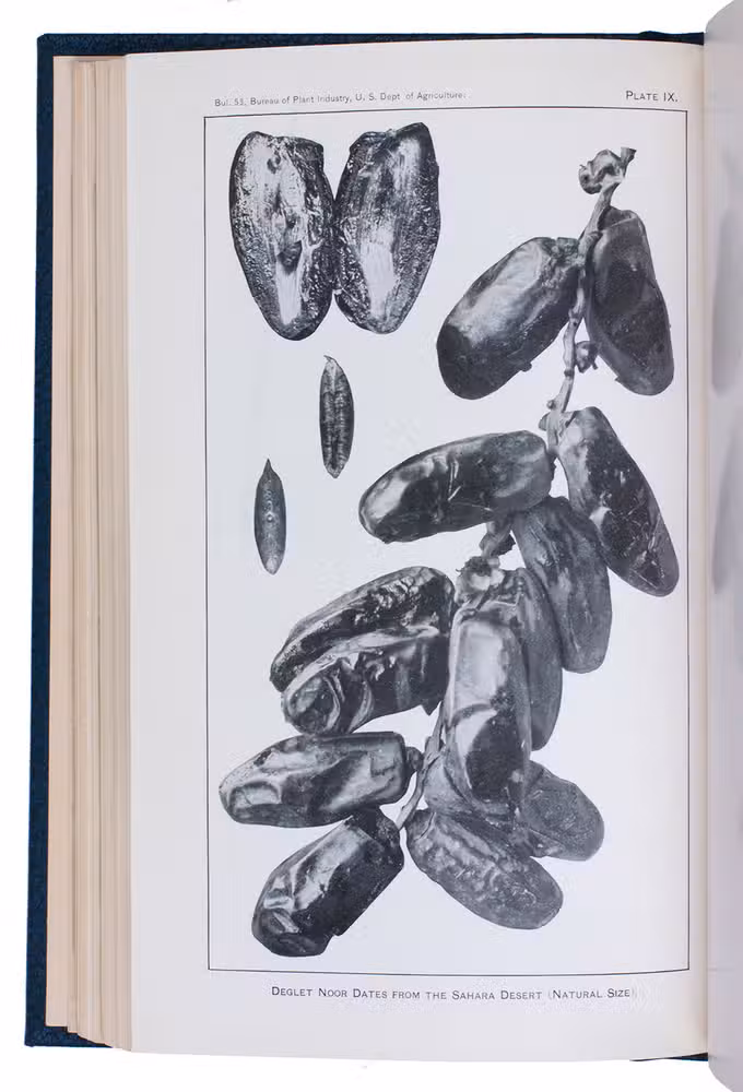 Ad 1: Offprint of an article on the date palm in America by the American botanist Walter Tennyson Swingle (1871-1952). He describes the characteristics of the date palm, its history in America, its cultivation, commenting on the proper climate, irrigation, fertilizing, soil, etc., and the uses of its fruits.Ad 2: First edition of Bulletin no. 53 of the USDA Bureau of plant industry, devoted to the date palm growing in the south of America, also by Swingle. It deals again with the cultivation of the tree, but in much more detail than in ad 1. A large part is devoted to the trees resistance to alkali, comparing alkali conditions in Algeria and America. Besides many photographs, it includes two chromolithographed maps of California showing where the date can grow and showing the variation in soil.Ad 3: First edition of Bulletin no. 54 of the USDA Bureau of plant industry, being a brief article on the introduction of date trees from the Arabian Gulf to America, written by the American botanist David Fairchild (1869-1954). He distinguishes many varieties of the palm growing in the Middle East (Bagdad, Basra, Al-Hasa, Masqat and more).Ad 4: First edition of Bulletin no. 92 of the USDA Bureau of plant industry, on different date palm varieties growing in Tunisia by Thomas Henry Kearney (1874-1956). He gives a description of geography, climate, the cultivation of the tree in Tunisia, the different types of dates and fruits and their characteristics.