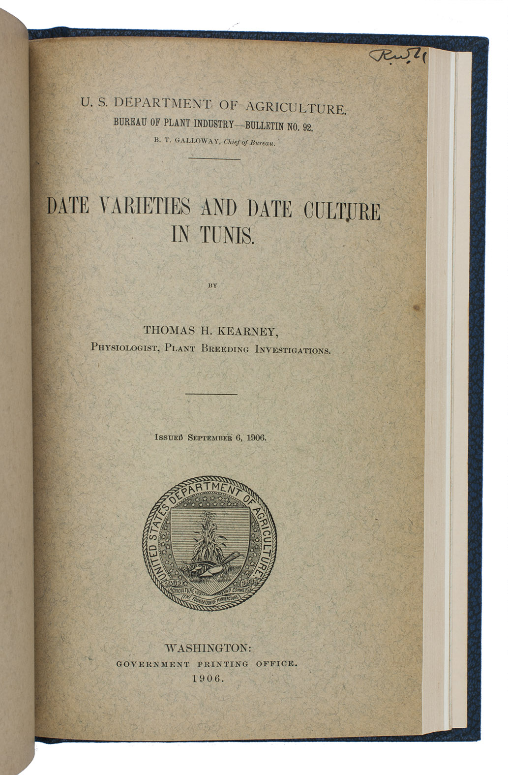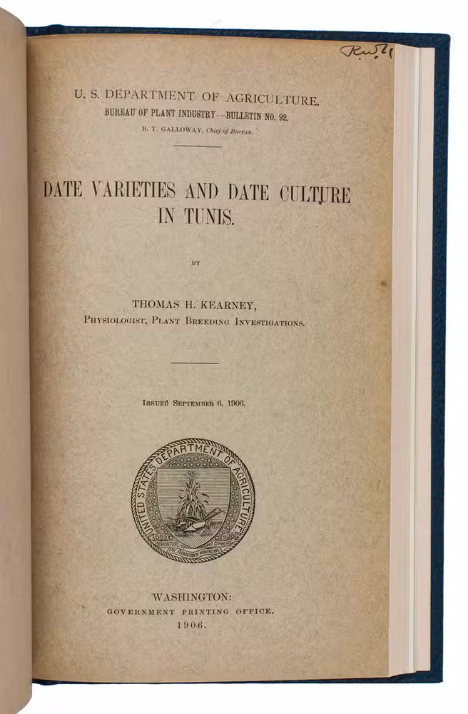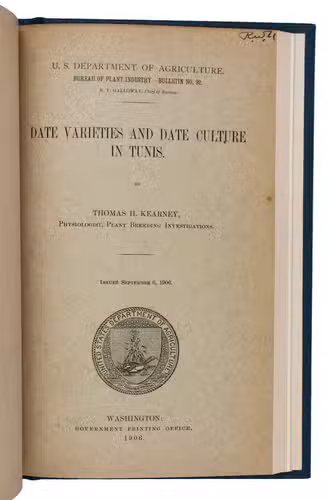 (4) KEARNEY, Thomas Henry. Date varieties and date culture in Tunis.Washington, Government printing office, 1903. With the same wood engraved device on title-page and 10 plates with reproductions of photographs.