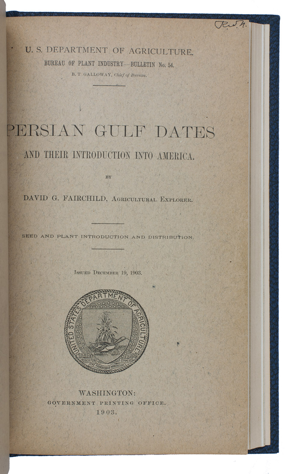(3) FAIRCHILD, David Grandison. Persian Gulf dates and their introduction into America.Washington, Government printing office, 1903. With the same wood engraved device on title-page and 4 plates with reproductions of photographs.