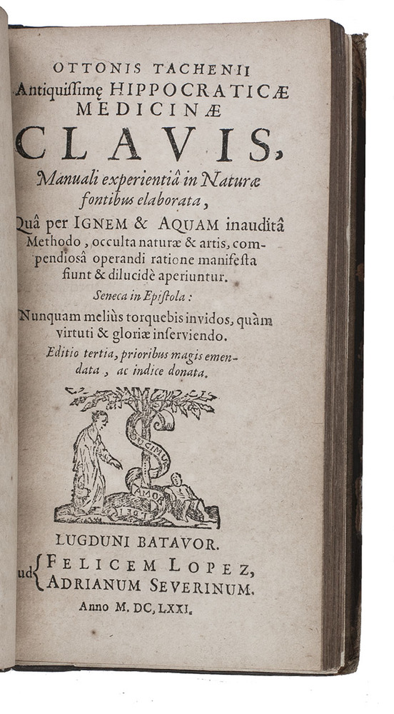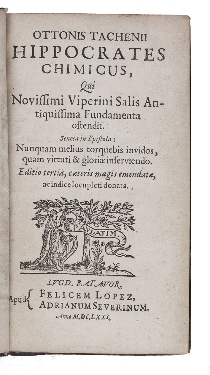 Rare third edition, with a newly engraved title-page, of Tacheniuss widely used work on chemistry and medicine. Together the Hippocrates chimicus and the Antiquissime Hippocraticae medicinae clavis form the complete works on chemistry and medicine of Otto Tachenius (1610-1680), based on the classic Hippocrates. He was schooled by Franciscus Sylvius, but surpassed his vision of acids, claiming that this is the basis of all physiology. According to Tachenius acid and alkali are the two elements of all things, corresponding to the fire and water that according to Hippocrates are in all things. He was in a debate of chemistry and medicine with Helwich Dietrich and Johann Zwelfer, the latter published his response to Tachenius work under the title Discursus apologeticus adversus Hippocratem chymicum in 1672.