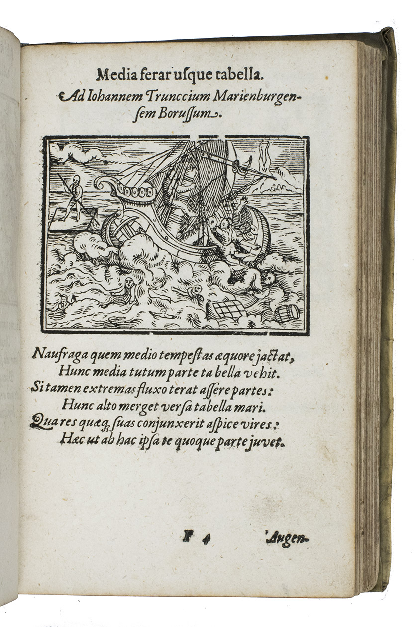 With: (2) IDEM. Carmina funebria, quae magnorum aliquot, clarorum que virorum felici memoriae dicavit. Nürnberg, Christophor Lochner the elder, 1602. With the title in a frame built up from arabesque typographic ornaments. 2 works in 1 volume. 8vo. Contemporary vellum. [23], [120] ll; 38, [2 blank] pp.