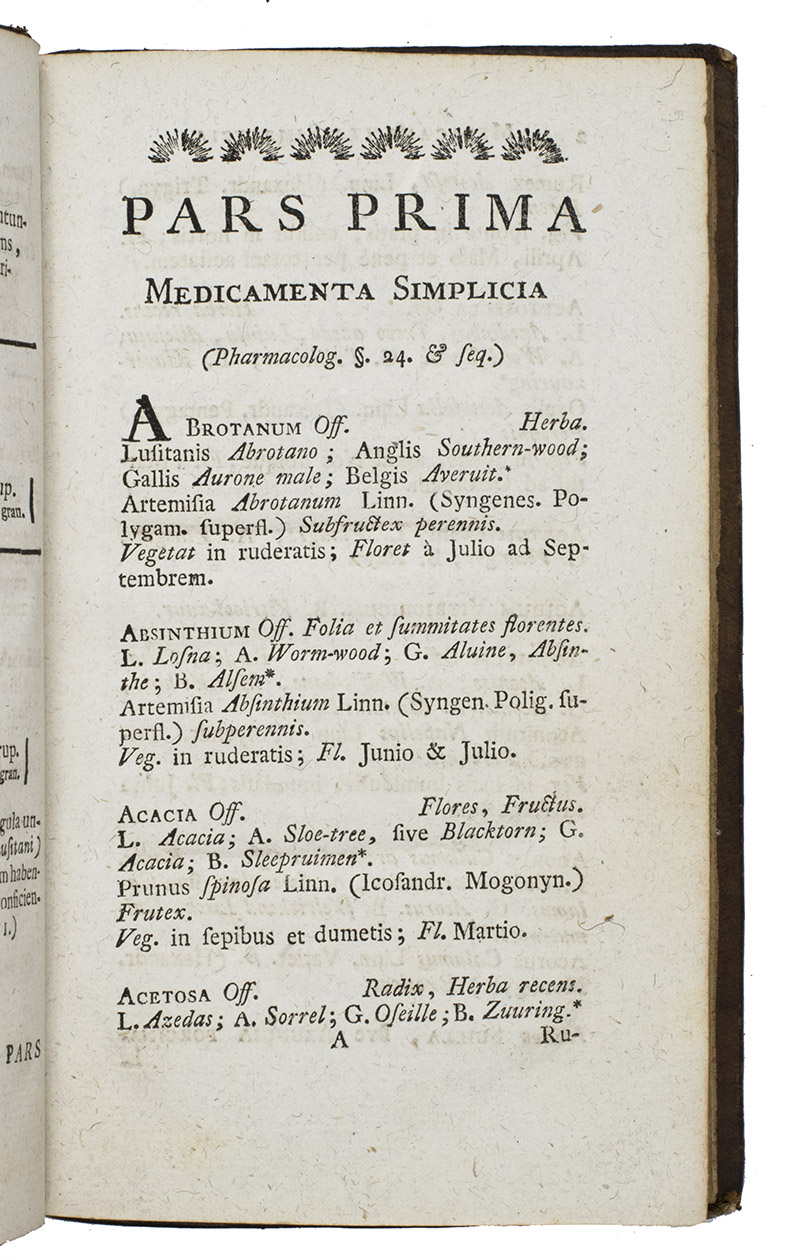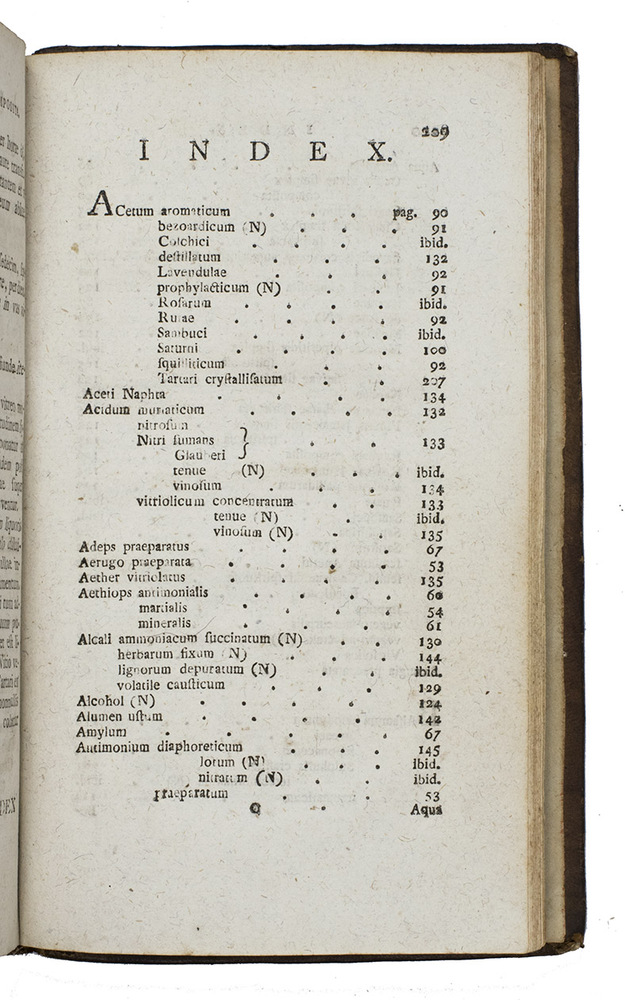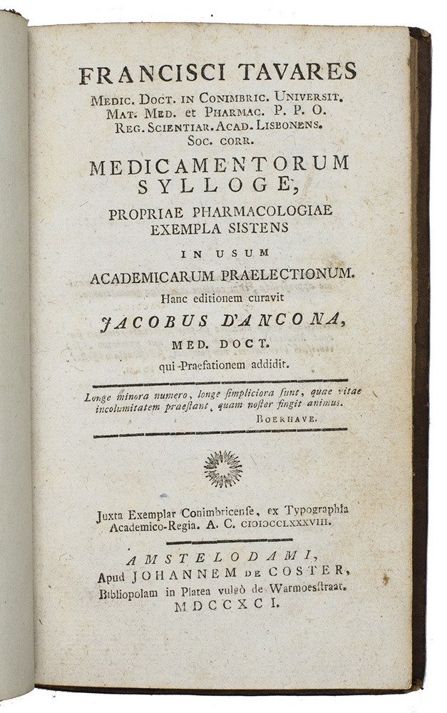 First and only Amsterdam edition, with additions, of an pharmacological and medical work by the famous Coimbra professor of medicine and pharmacology Franciscus Tavares (1750-1812), now edited by the Amsterdam Jewish physician Jacob dAncona (1739-1798) who added a list, partly in Dutch, of explanations of the Latin plant names. The first edition appeared in Coimbra in 1787, with three further editions in 1788, 1790 and 1791, the present edition based on that of 1788. Together with another book by Tavares, De pharmacologia libellus, published in Coimbra in 1786 (2nd ed. 1787), the Medicamentorum sylloge, formed the basis for the first official Portuguese pharmacopoeia: the Pharmacopeia geral, published in 1794, which is in fact also written by Tavares, propagating new insights, namely that the recent scientific results of natural history and chemistry are essential and fundamental for the further development of the science of pharmacology.