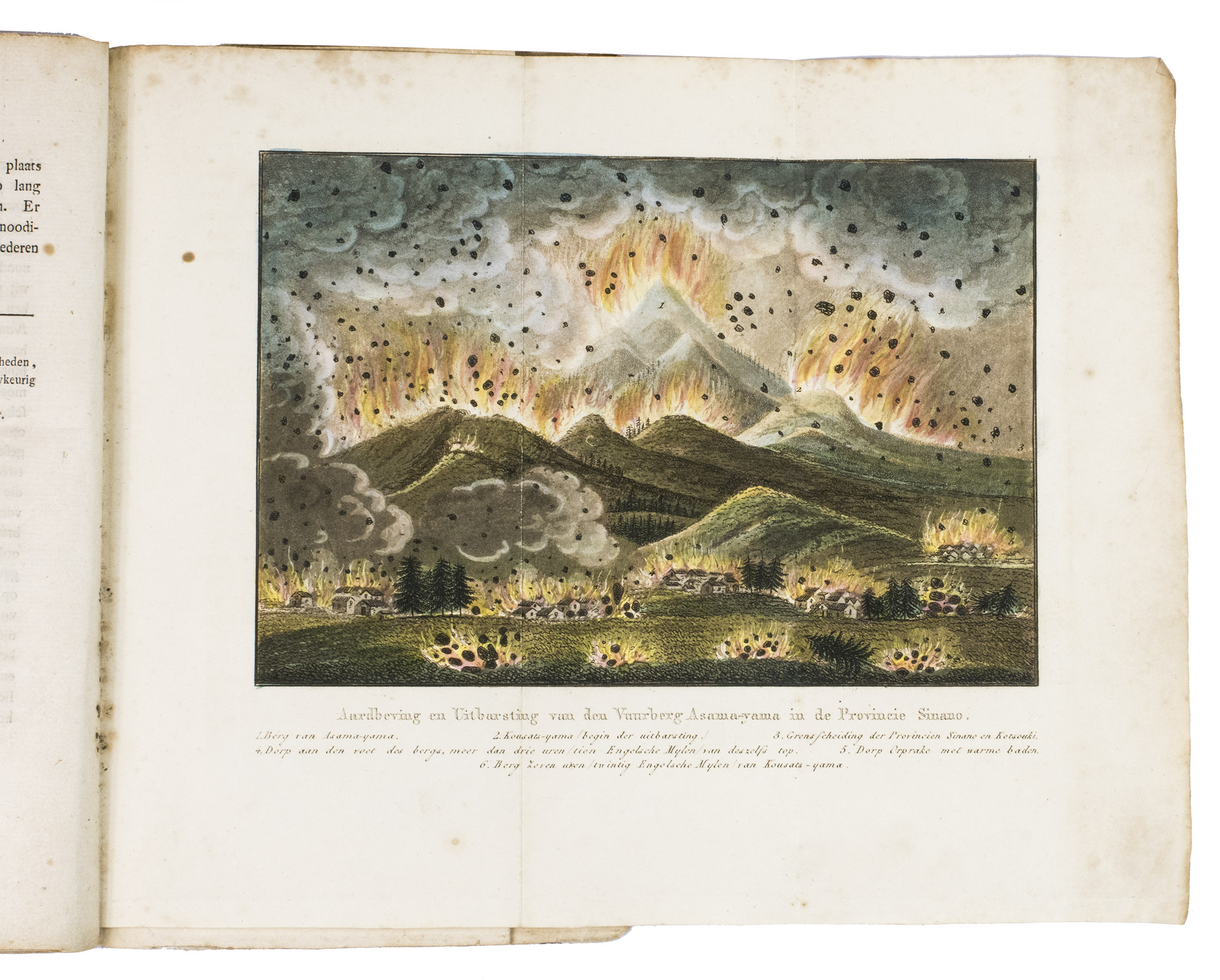 The first volume consists of essays on Japanese marriage and funeral ceremonies, an account of "dosia" powder, and some notes on the works of Confucius. It is concluded by a catalogue of books, manuscript, plans, and artefacts collected by Titsingh. The second volume includes a series of anecdotes about the shoguns, followed by several short essay, amongst others on seppuku (ritual suicide) and Japanese poetry, ending with explanations of the plans of the Dutch and Chinese factories at Nagasaki. The plates show a wedding ceremony, a volcanic eruption of Mount Asama, and the Dutch Factory at Decima.