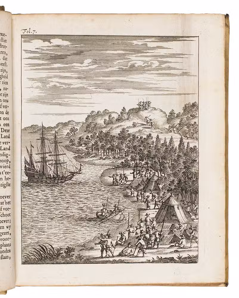 Very rare, the first fully illustrated edition of this seventeenth-century imaginary voyage to western Australia, based on the story of the wreck of the VOC ship Vergulde Draeck in 1656. The plates are thus early - if imaginary - depictions of the Australian coast, and include two coastal scenes depicting the first meeting with the local population, the Australian court, and the fabulous fauna.