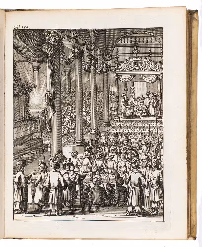 Amsterdam, Timotheus ten Hoorn, 1682. 4 parts in 1 volume. 4to. With an engraved title-page by Jan Luiken (dated 1683), 16 engraved plates (including 4 signed by J. vanden Aveele), some decorated woodcut initials, ornamental woodcut tailpieces and three divisional title-pages for parts 2-4. Contemporary vellum. [1], [1 blank], [1], [1 blank], [12], 253, [1 blank]; 96 pp.