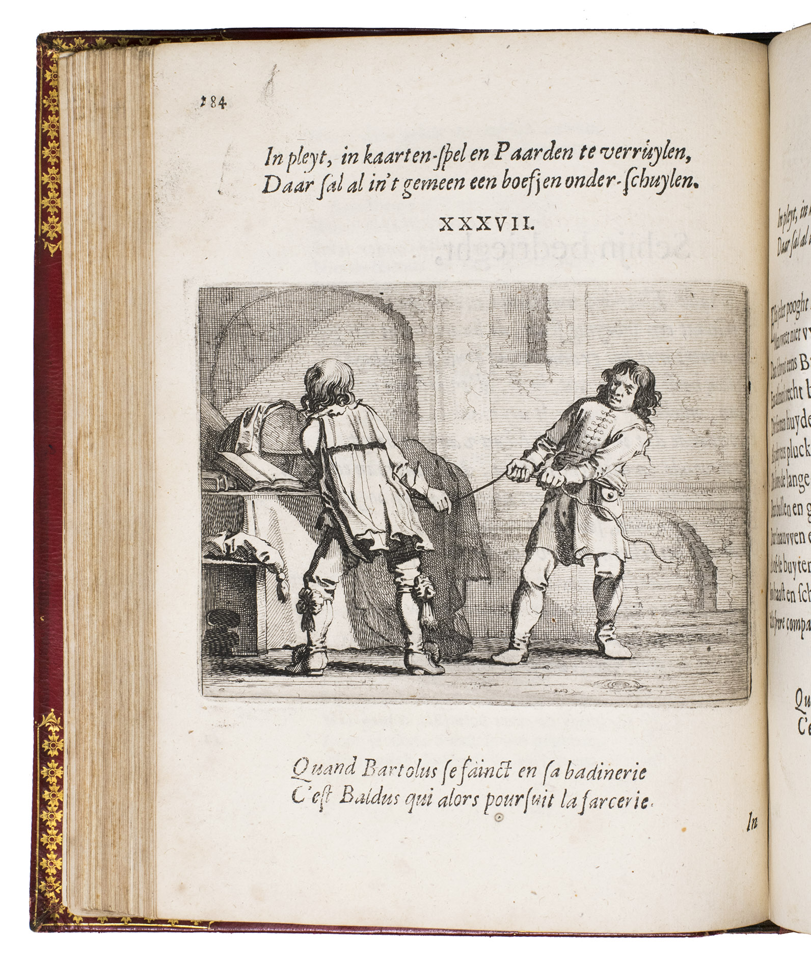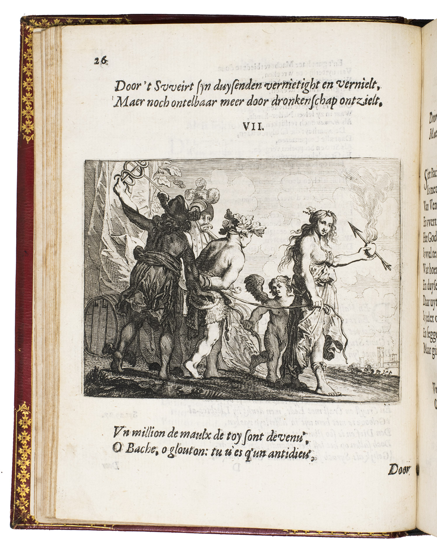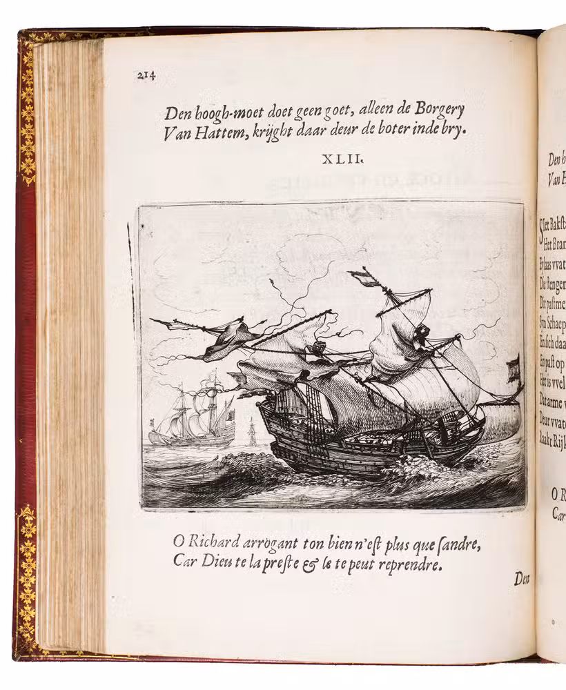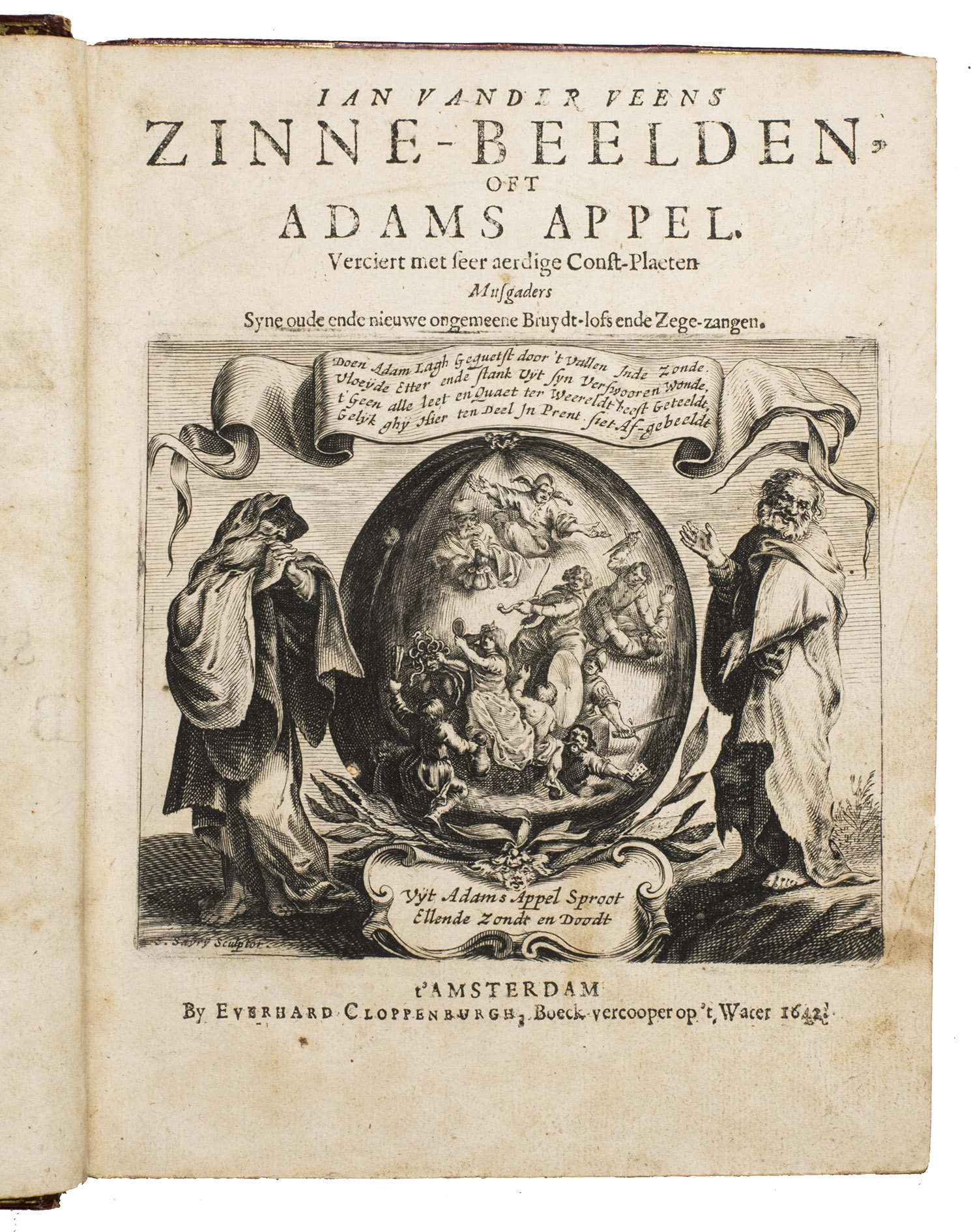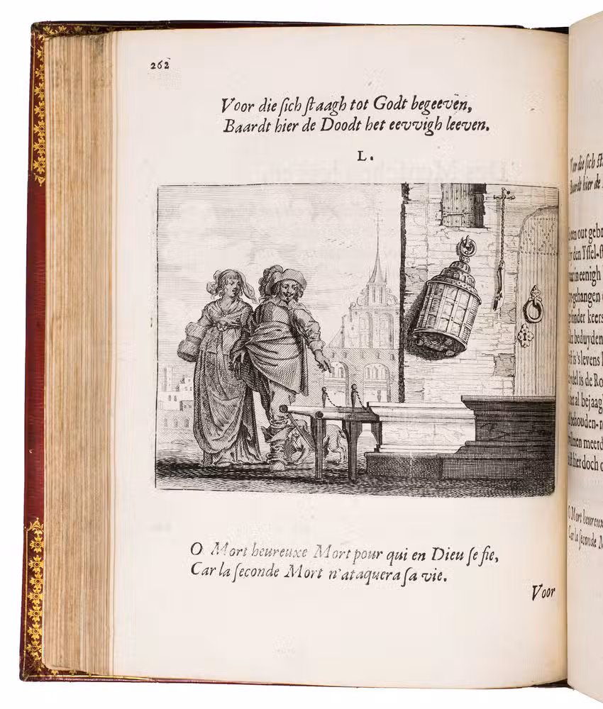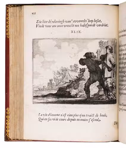 Amsterdam, Everhard Cloppenburgh, 1642. 4to. With large emblematic engraving on the title page and 50 engraved emblems in text (10 x 13.5 cm), all by Salomon Savry, woodcut head- and tailpieces, numerous woodcut decorated initials (several series) and decorations built up from typographic ornaments. Set in roman and italic types. Gold- and blind-tooled red, grained sheepskin (1817/18) for George Spencer-Churchill, 5th Duke of Marlborough, gold-tooled turn-ins and board edges, gilt and gauffered edges, grey-brown endpapers, red satin ribbon marker. [23], [1 blank], 523, [1 blank] pp.