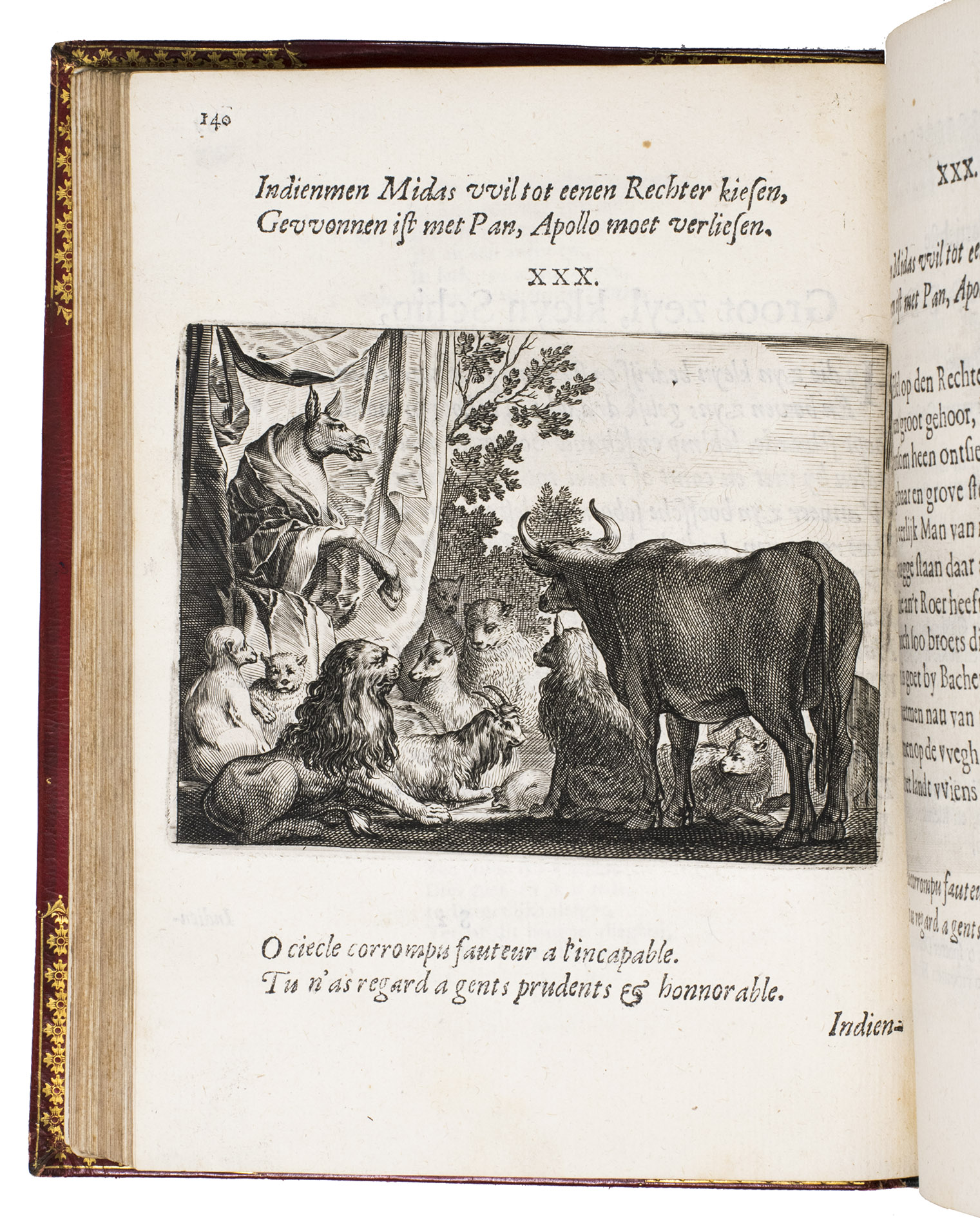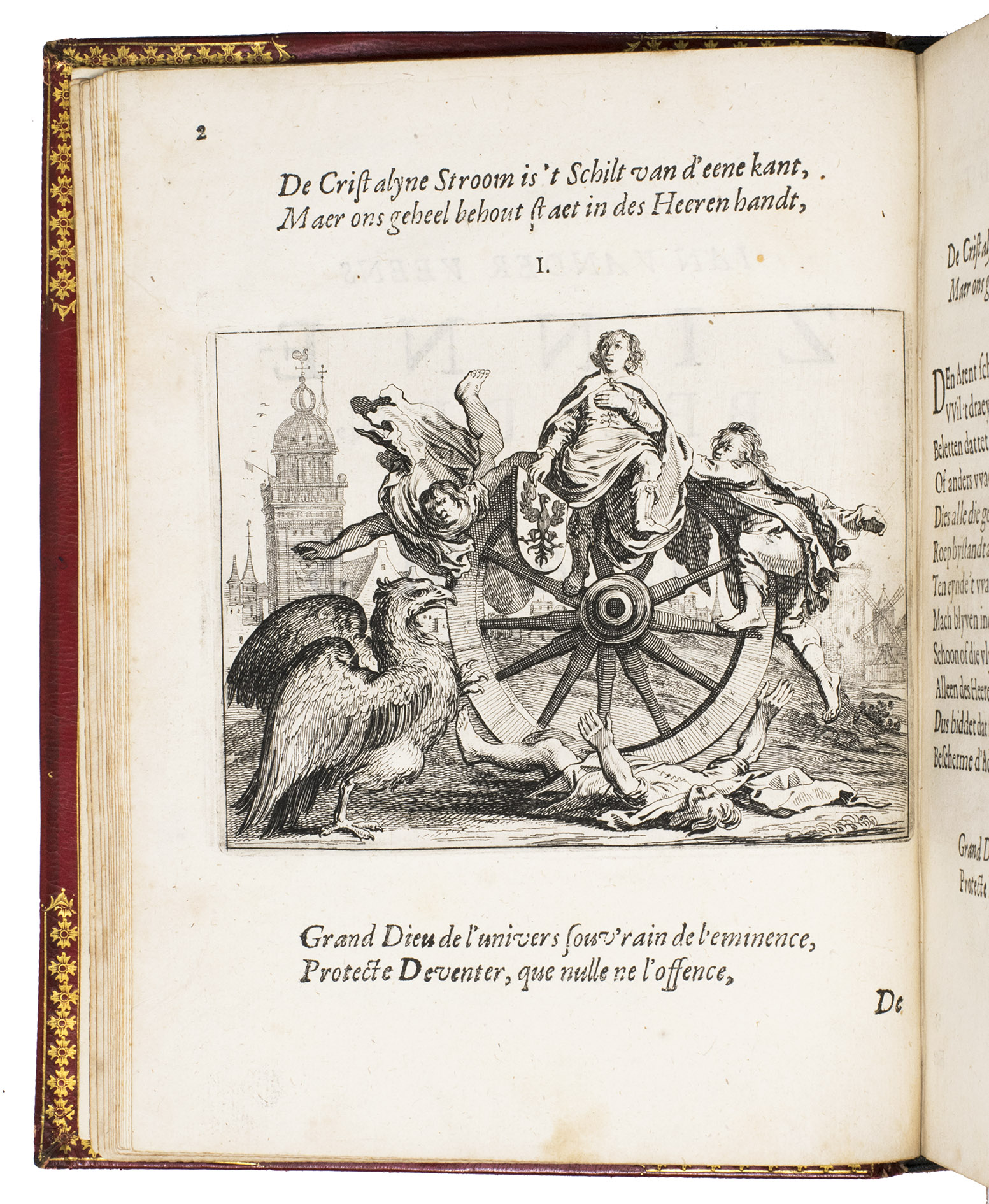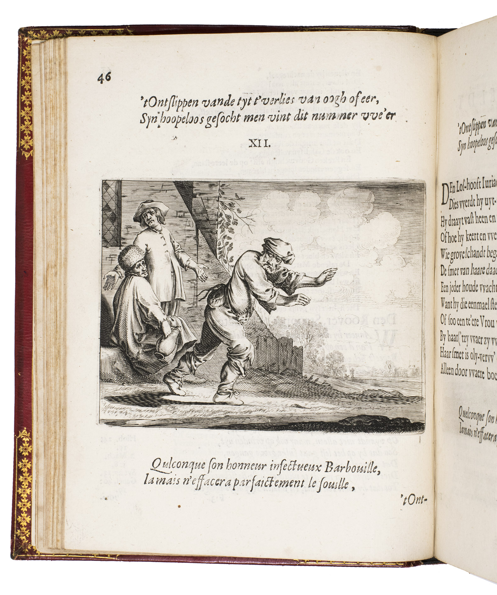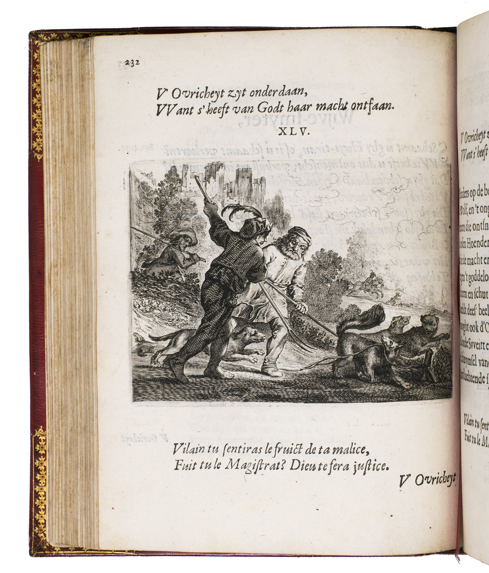 Amsterdam, Everhard Cloppenburgh, 1642. 4to. With large emblematic engraving on the title page and 50 engraved emblems in text (10 x 13.5 cm), all by Salomon Savry, woodcut head- and tailpieces, numerous woodcut decorated initials (several series) and decorations built up from typographic ornaments. Set in roman and italic types. Gold- and blind-tooled red, grained sheepskin (1817/18) for George Spencer-Churchill, 5th Duke of Marlborough, gold-tooled turn-ins and board edges, gilt and gauffered edges, grey-brown endpapers, red satin ribbon marker. [23], [1 blank], 523, [1 blank] pp.