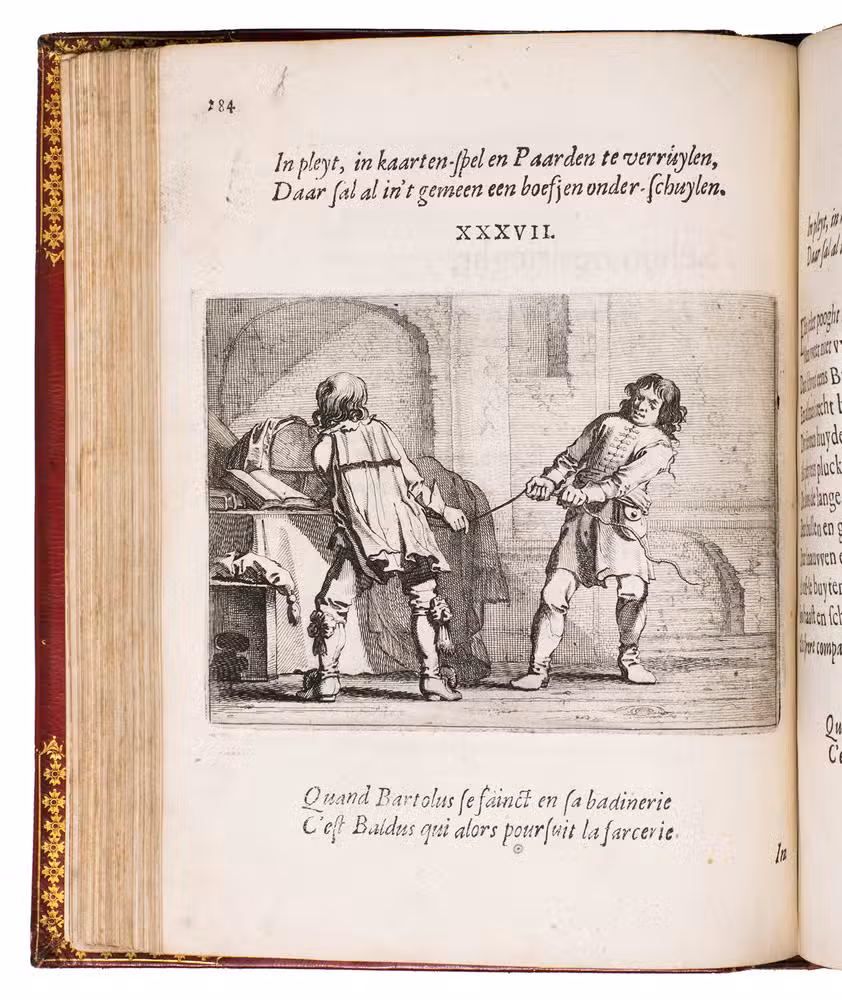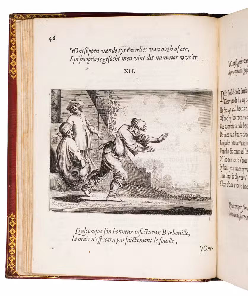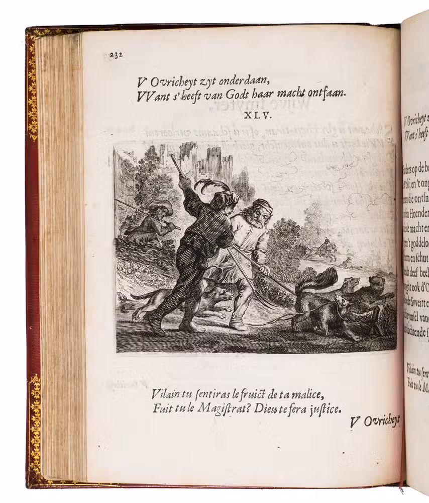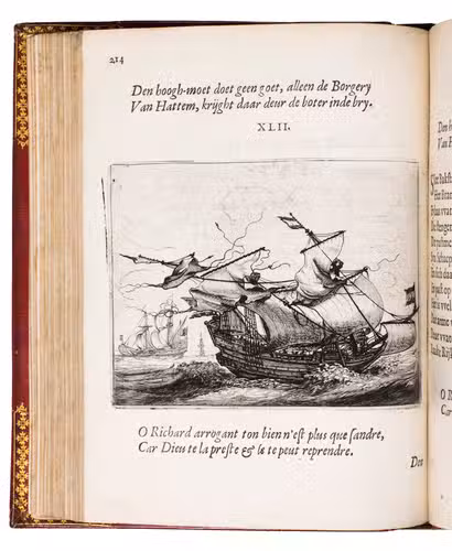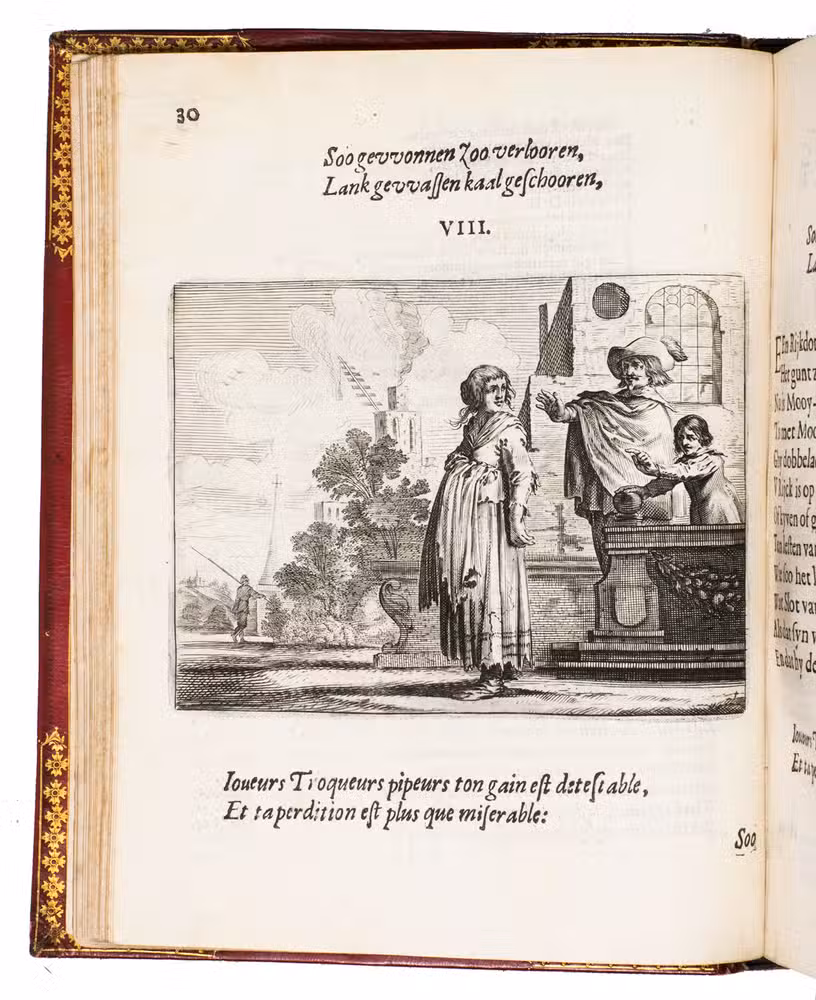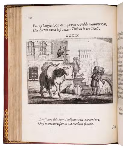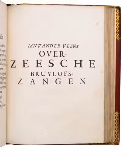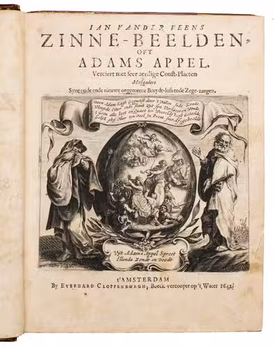 First edition of a popular emblem and song book written by the Dutch pharmacist and poet Jan van Veen. It includes 50 engraved emblems by the skilled artist Salomon Savry (or Saverij, 1594-1678), each with a two-line motto in Dutch above and in French below. Each is followed by three Dutch verses, the last often of devout character with marginal references to Bible verses. The emblems, beautifully etched and engraved, show common people engaged in a wide variety of professions and activities, many real and mythical animals, allegorical figures, etc. The last 250 pages present songs Van Veen wrote to be sung at weddings. The present first edition, besides showing the engravings at their freshest, is the only one with French motto, and the only one in quarto. Although the crest on the binding, of George Spencer-Churchill (1766-1840), is very similar to that on the bookplate of the Althorp Library on the paste-down, they represent different libraries. Spencer-Churchill had to sell much of his library in 1818, including this volume with his ducal crest, which was apparently purchased by his father's second cousin, John George, who owned the Althorp Library.