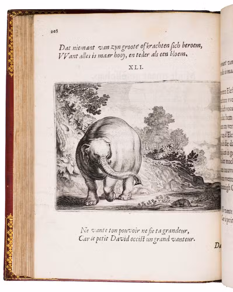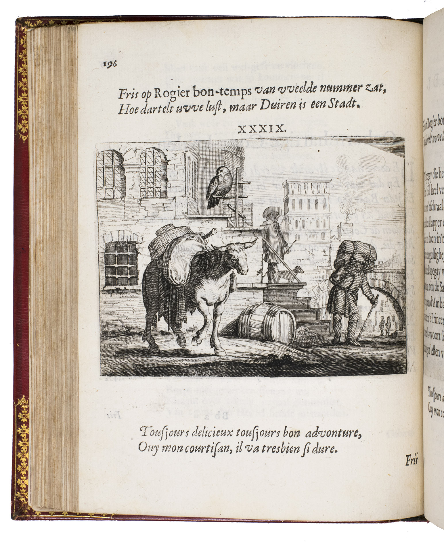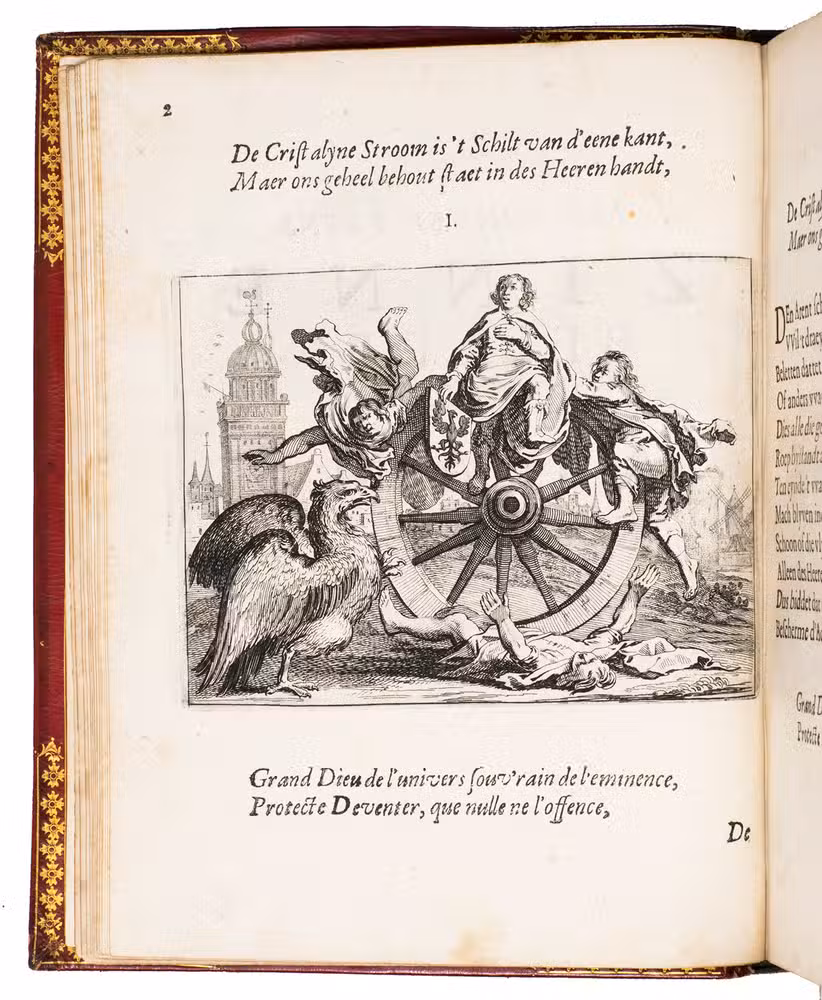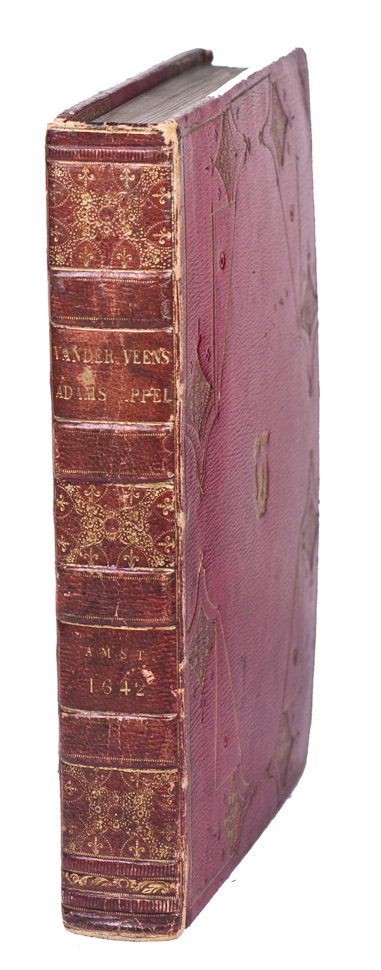 First edition of a popular emblem and song book written by the Dutch pharmacist and poet Jan van Veen. It includes 50 engraved emblems by the skilled artist Salomon Savry (or Saverij, 1594-1678), each with a two-line motto in Dutch above and in French below. Each is followed by three Dutch verses, the last often of devout character with marginal references to Bible verses. The emblems, beautifully etched and engraved, show common people engaged in a wide variety of professions and activities, many real and mythical animals, allegorical figures, etc. The last 250 pages present songs Van Veen wrote to be sung at weddings. The present first edition, besides showing the engravings at their freshest, is the only one with French motto, and the only one in quarto. Although the crest on the binding, of George Spencer-Churchill (1766-1840), is very similar to that on the bookplate of the Althorp Library on the paste-down, they represent different libraries. Spencer-Churchill had to sell much of his library in 1818, including this volume with his ducal crest, which was apparently purchased by his father's second cousin, John George, who owned the Althorp Library.