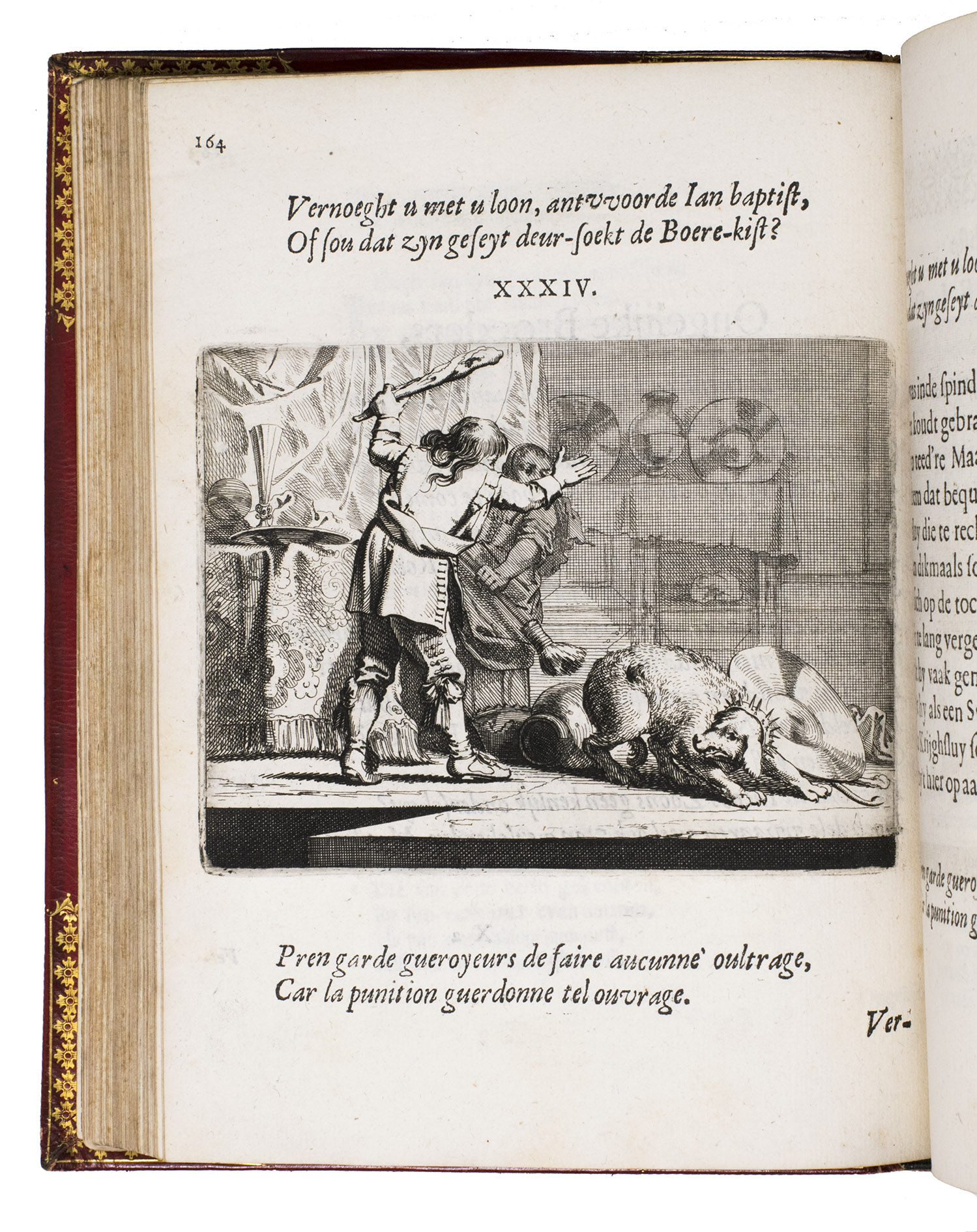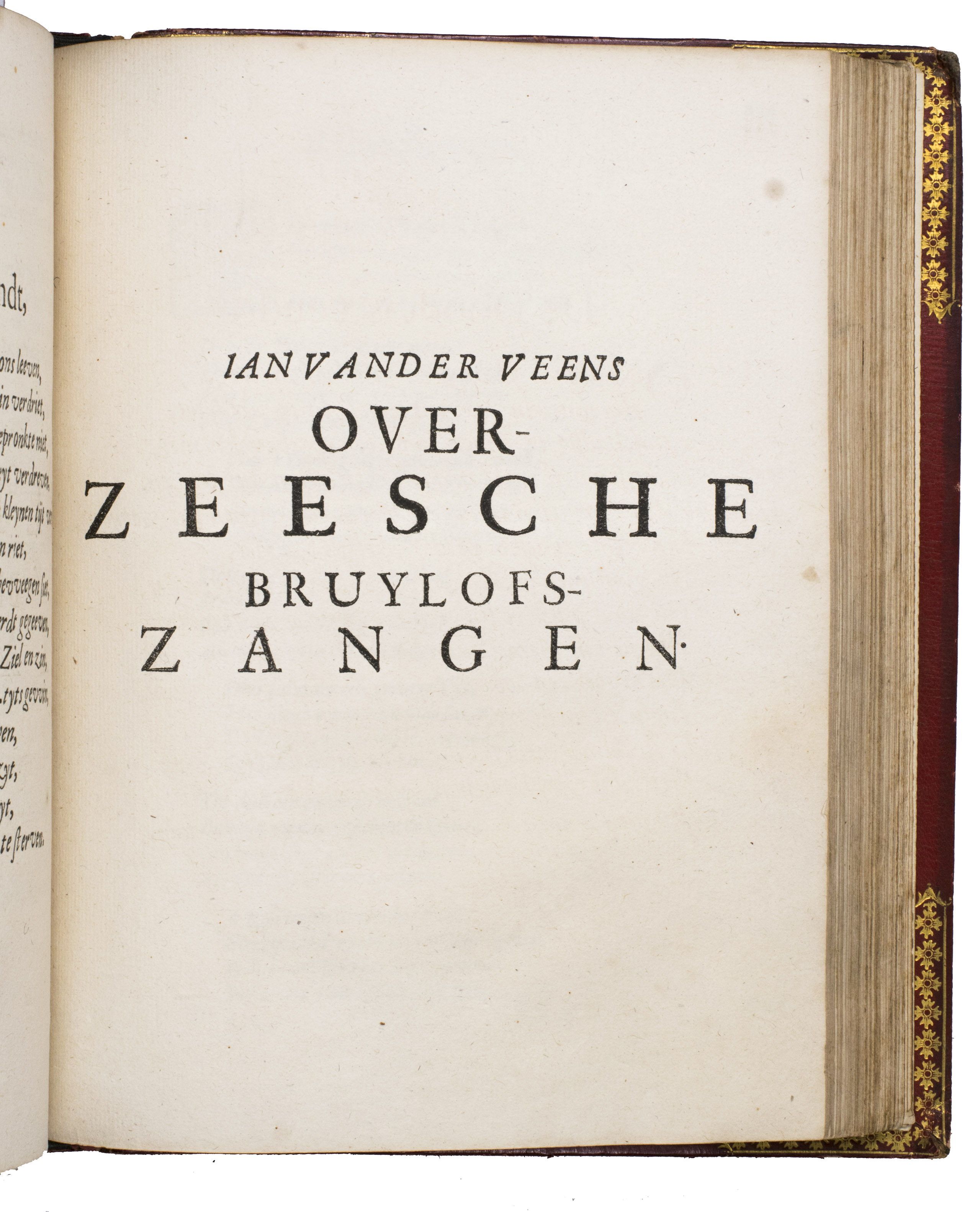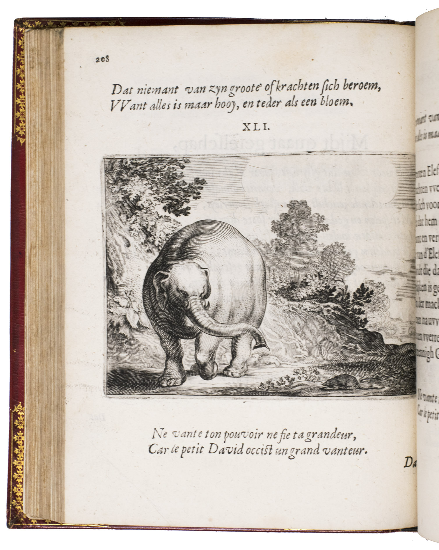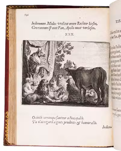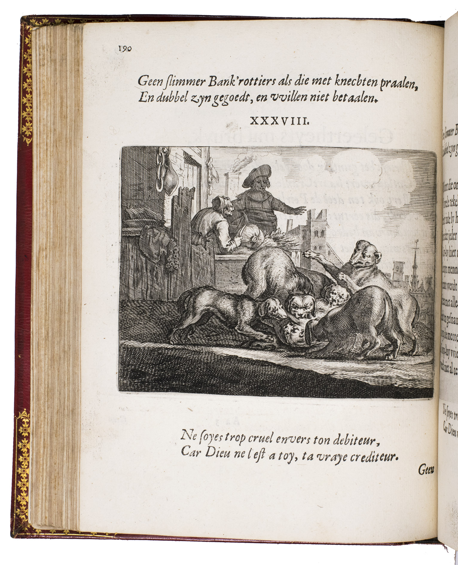 First edition of a popular emblem and song book written by the Dutch pharmacist and poet Jan van Veen. It includes 50 engraved emblems by the skilled artist Salomon Savry (or Saverij, 1594-1678), each with a two-line motto in Dutch above and in French below. Each is followed by three Dutch verses, the last often of devout character with marginal references to Bible verses. The emblems, beautifully etched and engraved, show common people engaged in a wide variety of professions and activities, many real and mythical animals, allegorical figures, etc. The last 250 pages present songs Van Veen wrote to be sung at weddings. The present first edition, besides showing the engravings at their freshest, is the only one with French motto, and the only one in quarto. Although the crest on the binding, of George Spencer-Churchill (1766-1840), is very similar to that on the bookplate of the Althorp Library on the paste-down, they represent different libraries. Spencer-Churchill had to sell much of his library in 1818, including this volume with his ducal crest, which was apparently purchased by his father's second cousin, John George, who owned the Althorp Library.