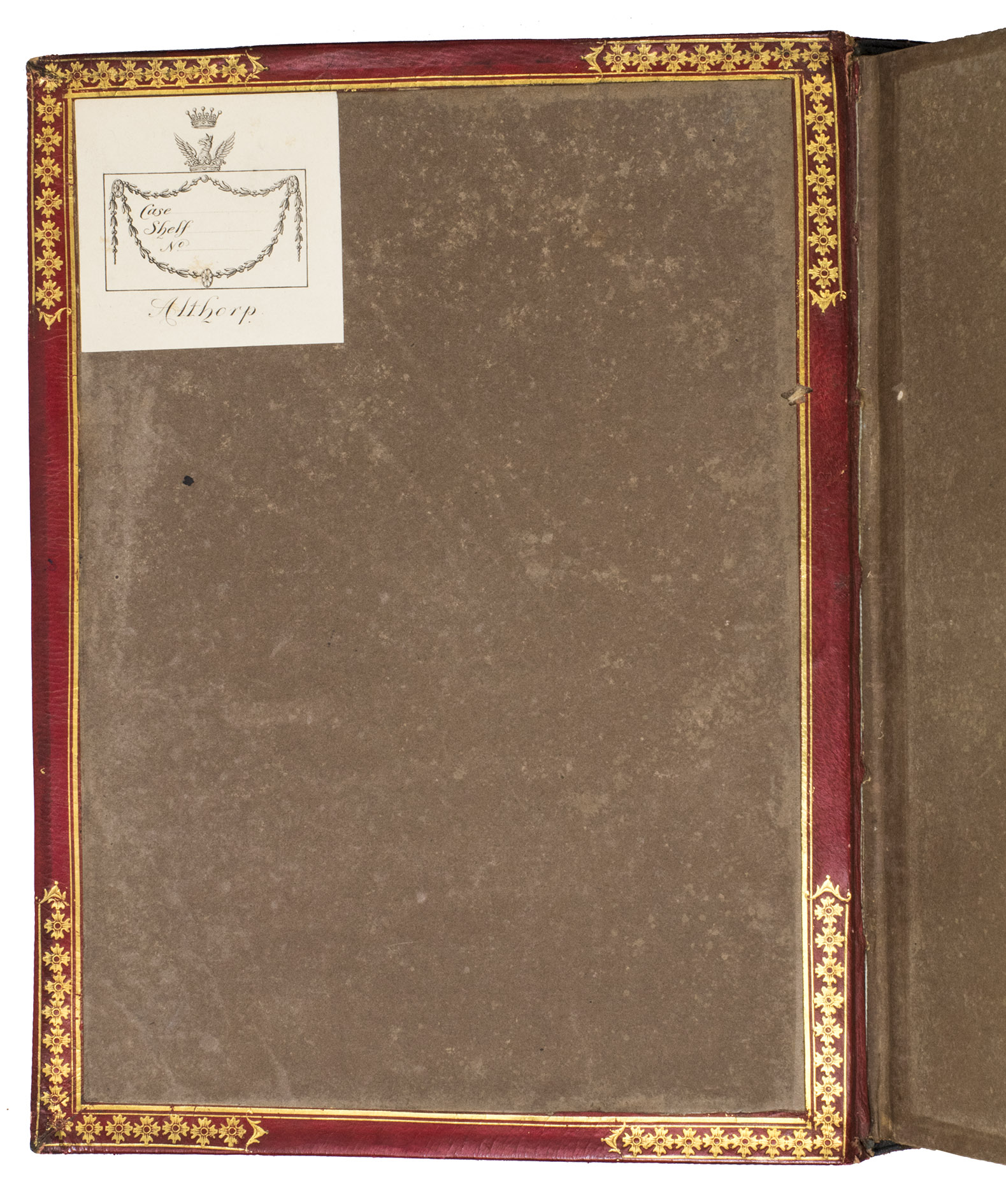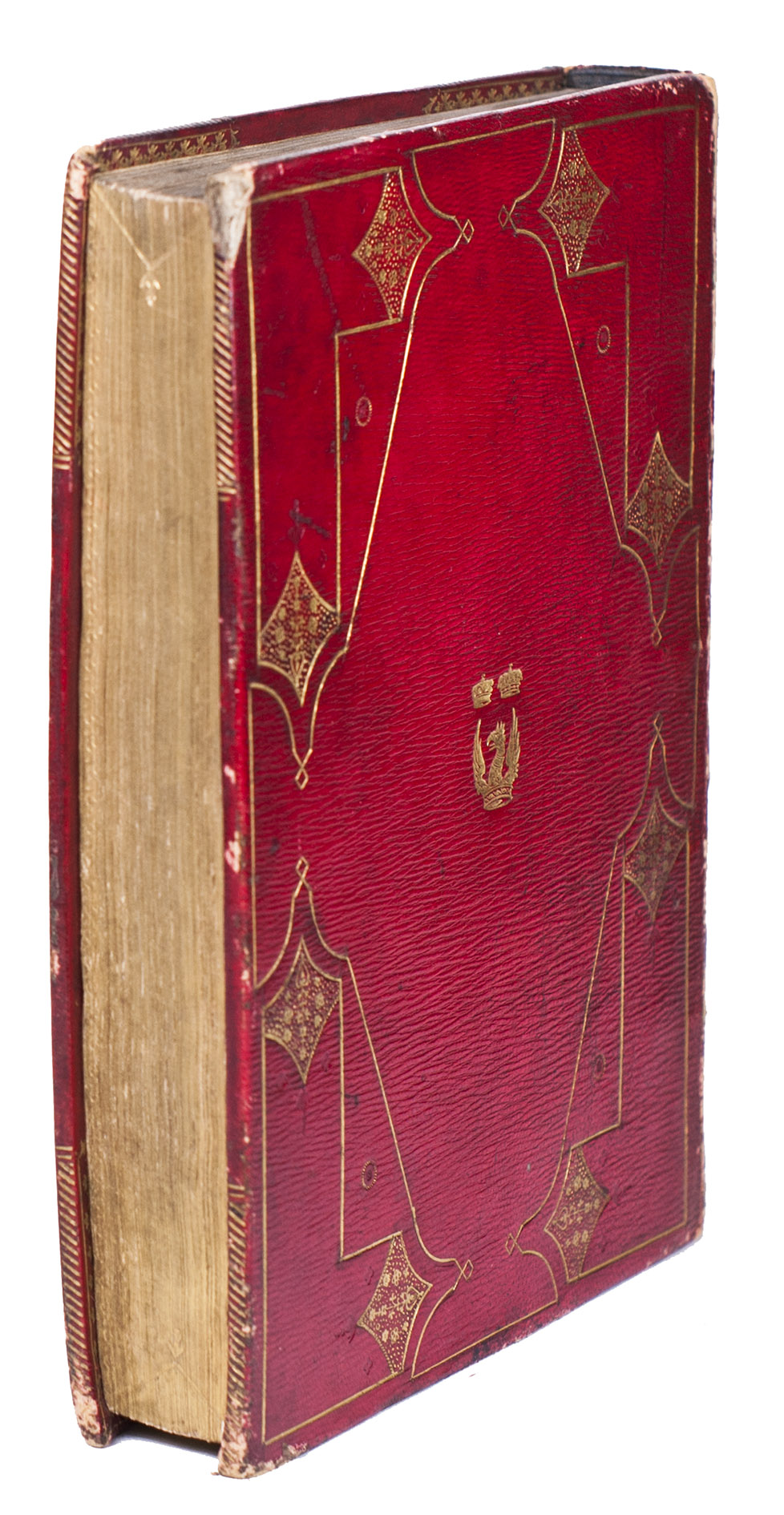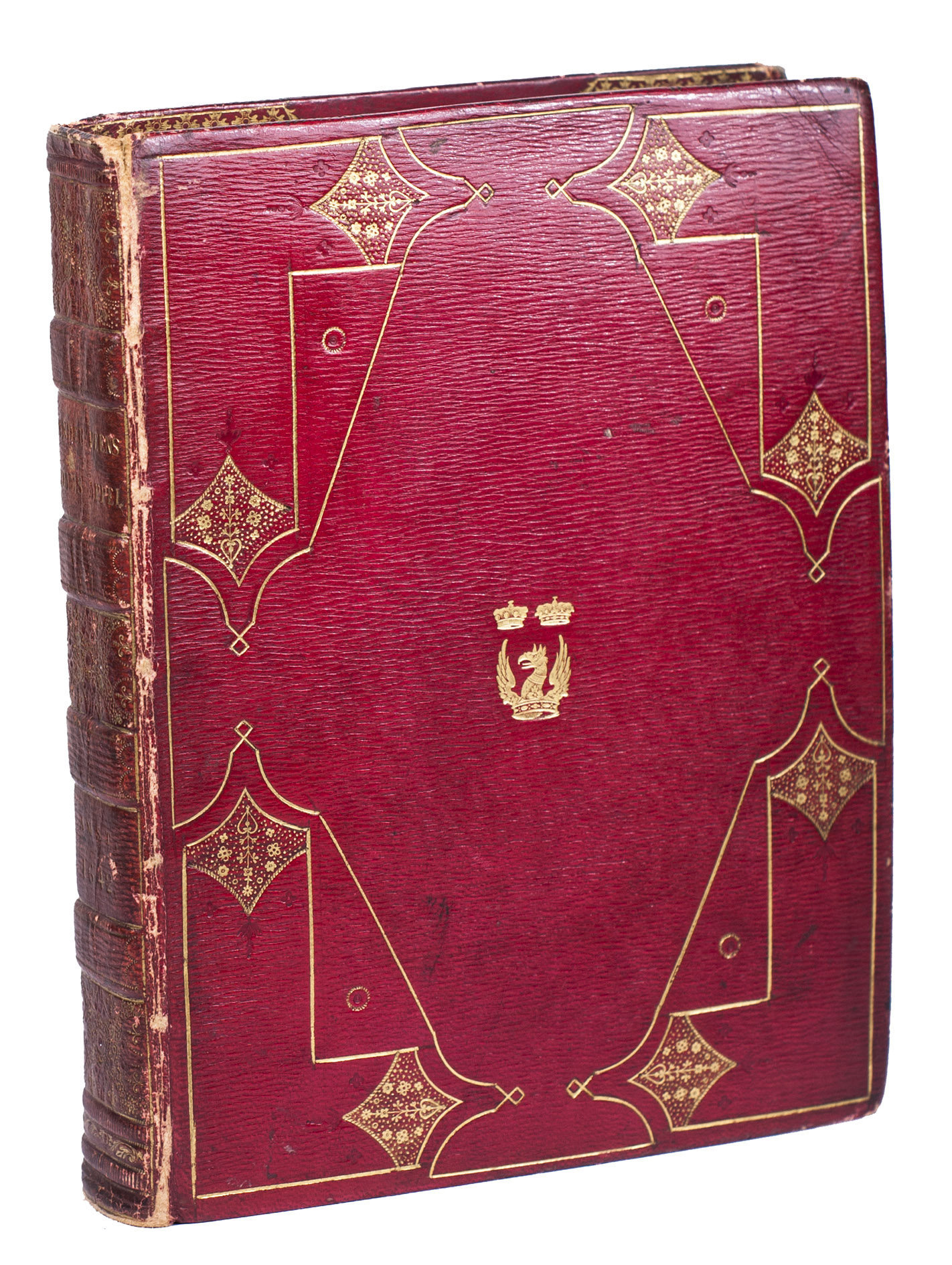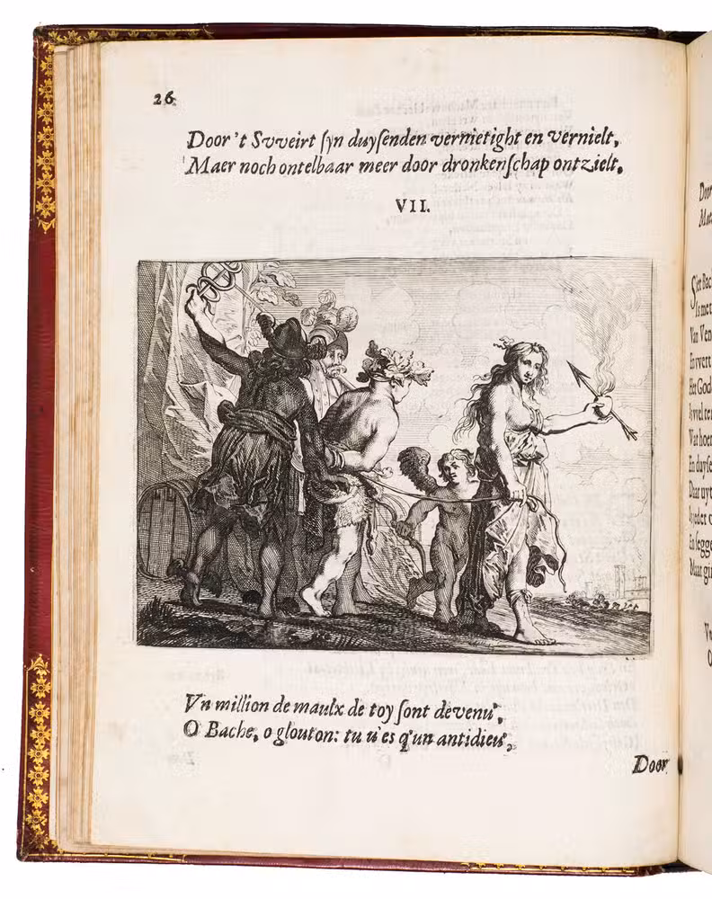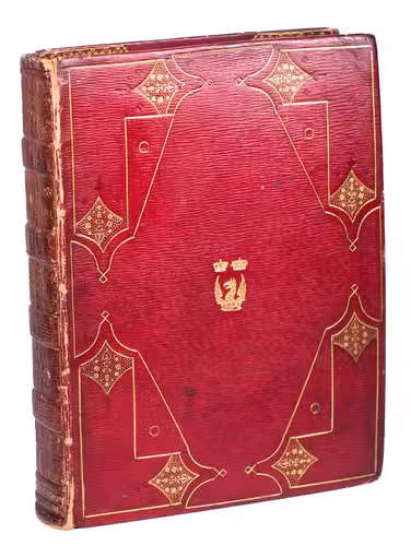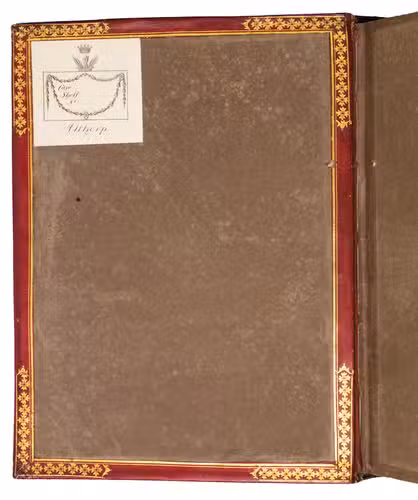Emblem IX was first accidentally repeated in the place of emblem XIV, but a cancel slip with the correct emblem has been pasted over it (as usual). With a small hole slightly affecting emblem VI, occasional minor and mostly marginal spots, smudges and faint stains, but otherwise in very good condition and with generous margins. Slightly worn at the hinges and extremities, spine slightly faded, but binding otherwise very good. First edition of a Dutch emblem book with 51 excellent plates, charmingly bound for the new Duke of Marlborough in 1817/18. Hollstein XXIV, 181; Landwehr, Emblem and fable books 842; Praz, pp. 522-523; Scheurleer, Liedboeken, p. 156; STCN 853409463; Triphook, Catalogue of old books, London, June 1818, item 3307 (this copy in this binding); De Vries, Emblemata 167; for the binding stamp: https://armorial.library.utoronto.ca/stamps/ISPE006_s4 (and for Spencer-Churchill .../content/spencer-churchill-george); for the Althorp Library: https://www.escholar.manchester.ac.uk/api/datastream?publicationPid=uk-ac-man-scw:1m2217&datastreamId.