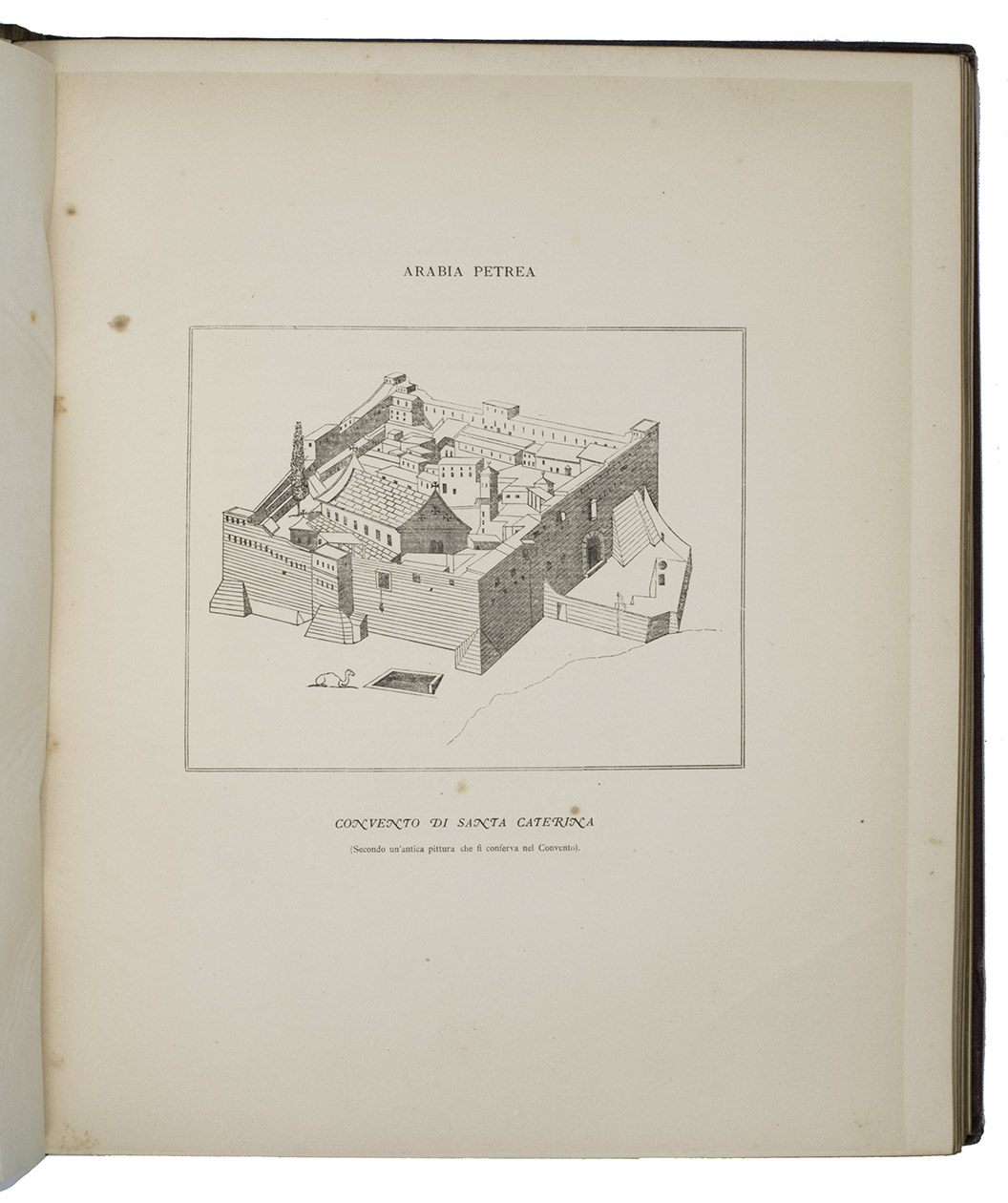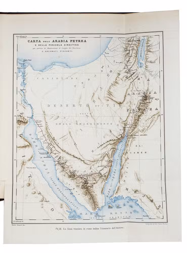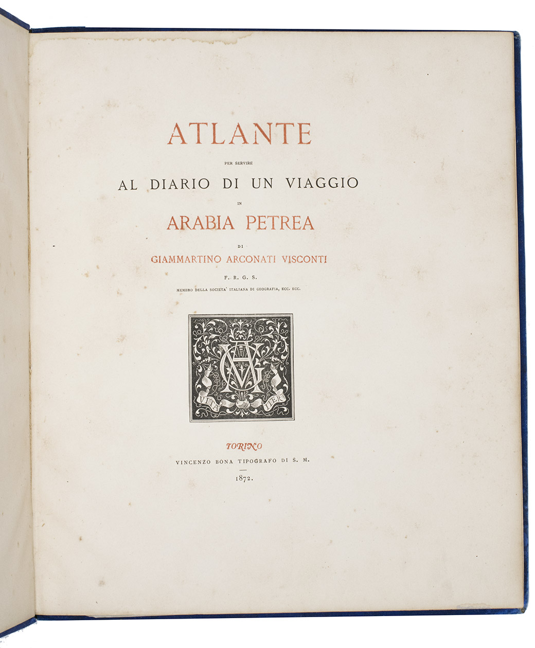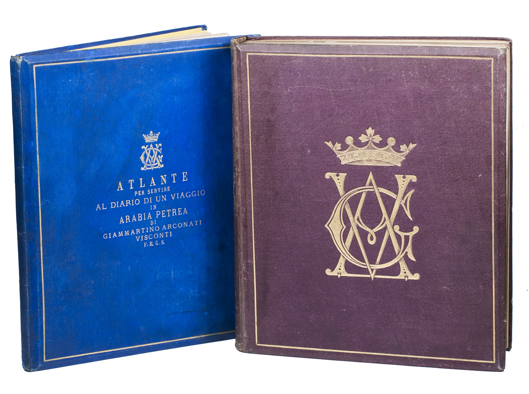 Torino, Vincenzo Bona, 1872. 2 volumes. Royal 4to (31 x 27 cm). With 2 title-pages printed in red and black, each with the author's wood-engraved decorated GAV-monogram and motto; vol. 1 with 2 folding lithographed maps (1 printed in black, brown and blue, with the route coloured by hand in red, of the Sinai Peninsula; the other in black and white, of the city of Petra); 40 mounted albumen prints after paintings by Emile Pierre Metzmacher (mainly 11.5 x 16 cm), individually mounted with letterpress captions on the mount; and 2 engraved plates; vol. 2 with 6 numbered engraved plates of molluscs and insects. The Diario in the original publisher's maroon cloth with the author's crowned monogram gold--blocked on the front board and spine. The Atlante in the original publisher's blue cloth, with the author's crowned monogram and the title gold-blocked on the front board. Both volumes with gilt edges, orange endpapers and with tissue guard leaves tipped in, protecting the albumen prints and engraved plates. 439; 46, [2 blank] pp. (vol. II, pp. 1-2 blank).