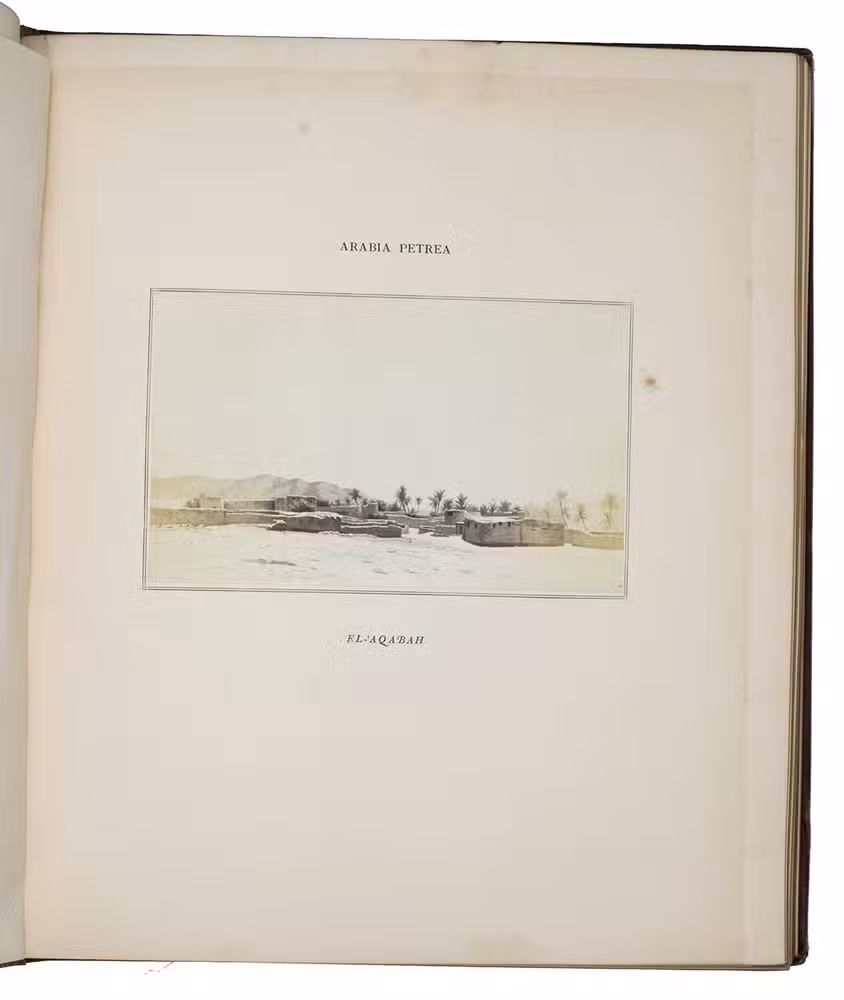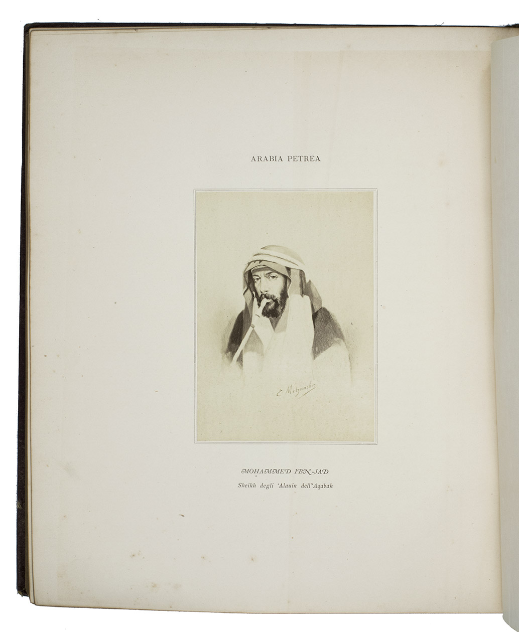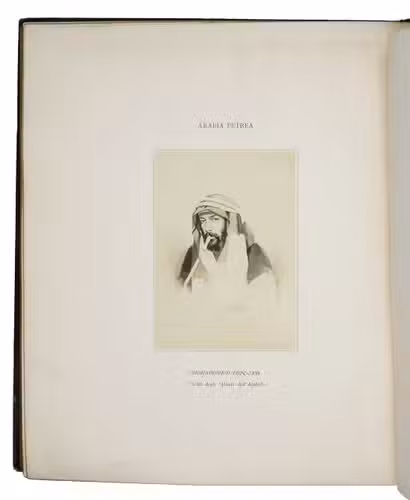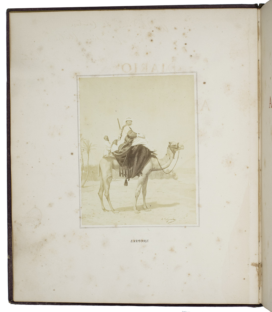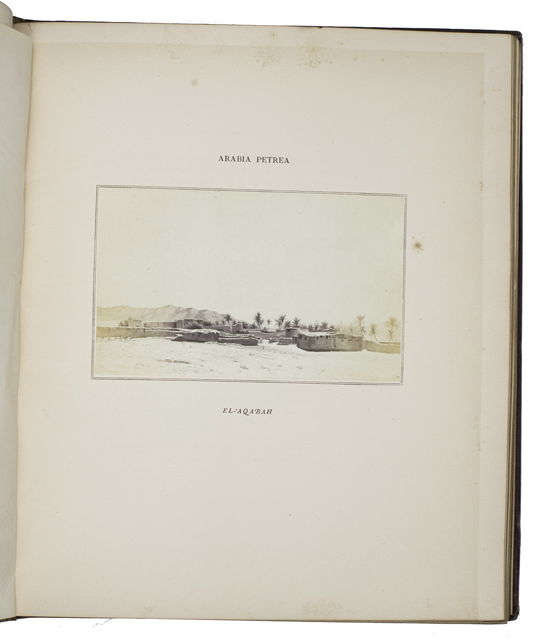The volume with the Diario is a presentation copy with the authors presentation inscription to a woman named Josephine. Bindings slightly worn, the blue cloth a little stained. First and last leaves of both volumes browned, some foxing, some fly-leaves with a tear (not affecting the plates), the map of Petra stained due to oxidation, with some browning caused by the albumen prints on the facing leaves, but overall in good condition. Blackmer 1742; Gay, Bibl. de l'Afrique et l'Arabe 3650 bis; Macro, Arabian peninsula 2254 (not noting plates); not in Howgego; Ibrahim-Hilmy; Weber.