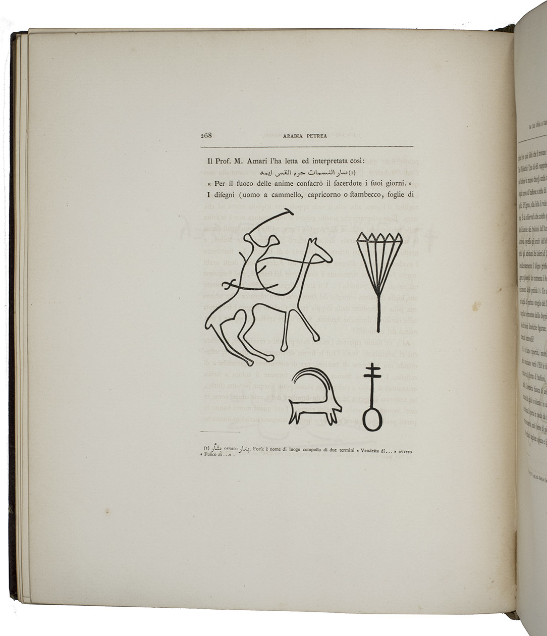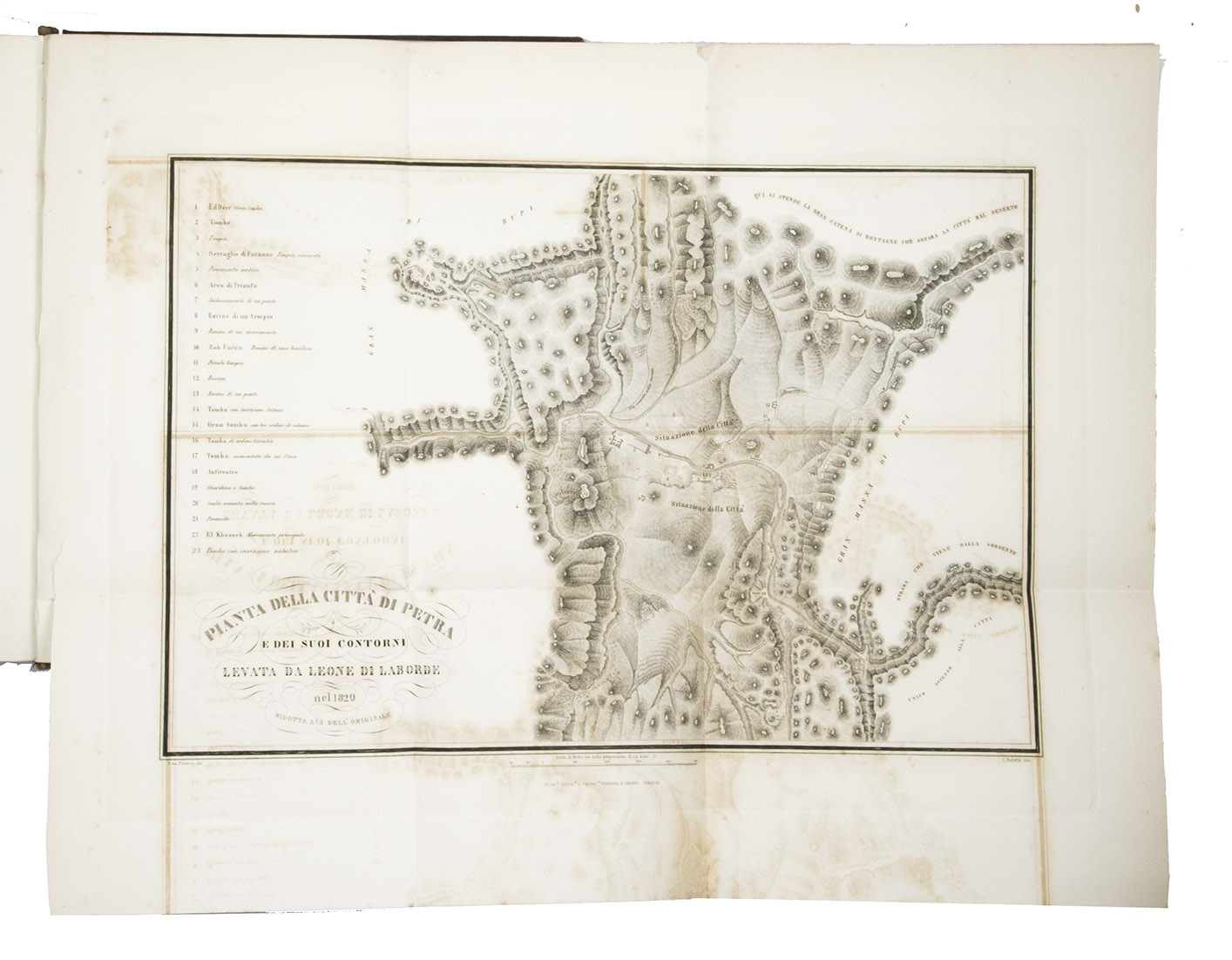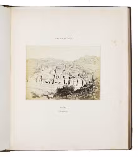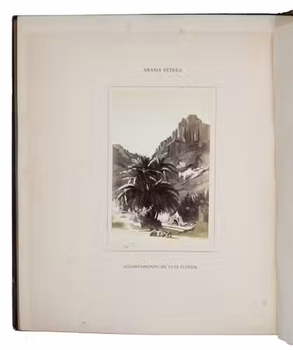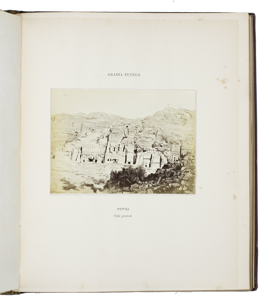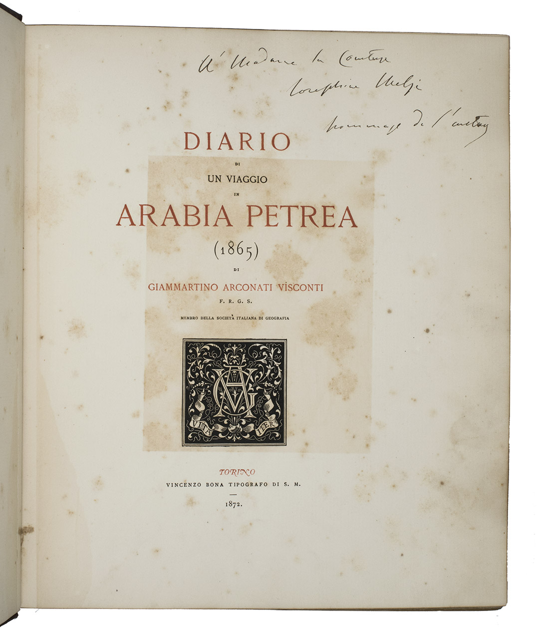 Rare first and only edition of an Italian account of an 1865 expedition through "Arabia Petra", meaning the Sinai Peninsula and adjoining parts of what are now Israel and Jordan, including the ancient city of Petra, now in Jordan, where parts of "Raiders of the lost arc" were filmed (the spectacular ancient buildings are carved into the solid rock walls of the cliffs and probably date from the 5th century BC to the 2nd century AD. The photographically reproduced paintings show the author on camelback, numerous Bedouins, Arabs, Egyptians and Ethiopians as well as archaeological sites, monuments and topographic views. The plates in the second volume depict molluscs and insects, reflecting the authors own research interests in the field of natural history, in addition to archaeology. The typography has been designed to suit the antiquarian subject, with Louis Perrin's Augustaux roman capitals on the title-pages, the main text set in what would then have been considered an "antique" style (types influenced by pre-1800 models) and sans-serif capitals used to represent the ancient Greek and Latin inscriptions. The author quite literally put his stamp on the work, with his crowned monogram not only on the title-page and binding, but also embossed in the paper, where it serves as a sort of watermark. The book does not indicate the size of the edition but since most of the illustrations are original albumen prints, there cannot have been many copies produced. The present copy may be a more deluxe binding than the Blackmer copy, also inscribed by the author to a woman, for it was in green cloth with only Visconti's single initial "V" on the front board.