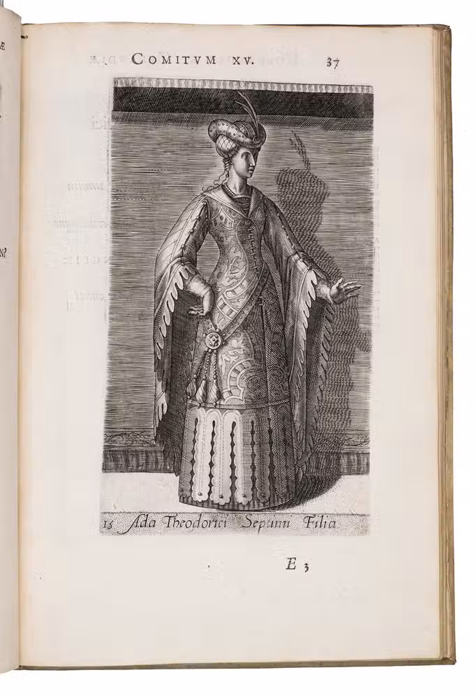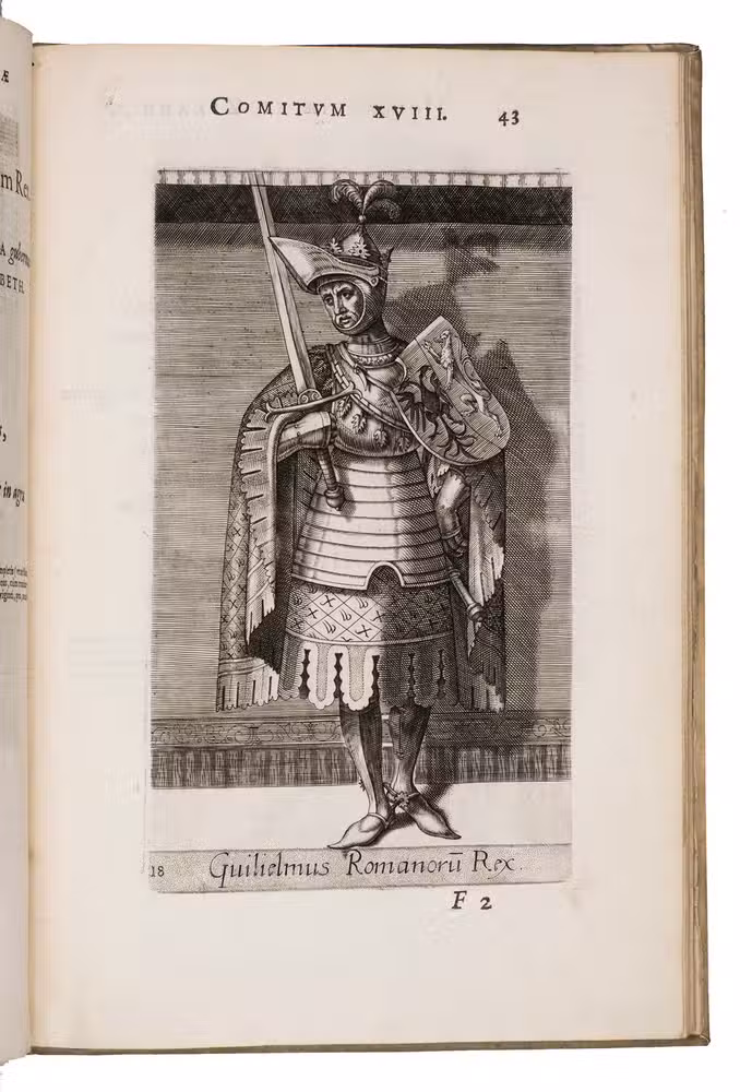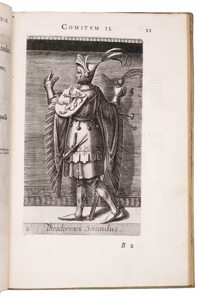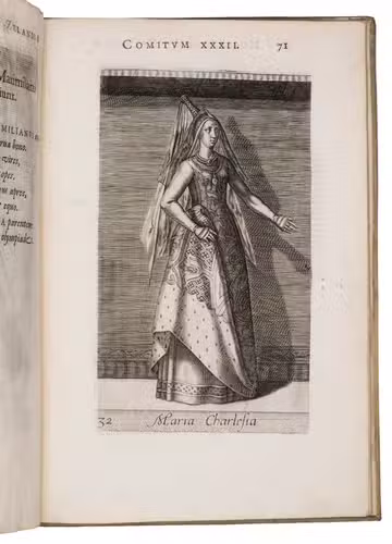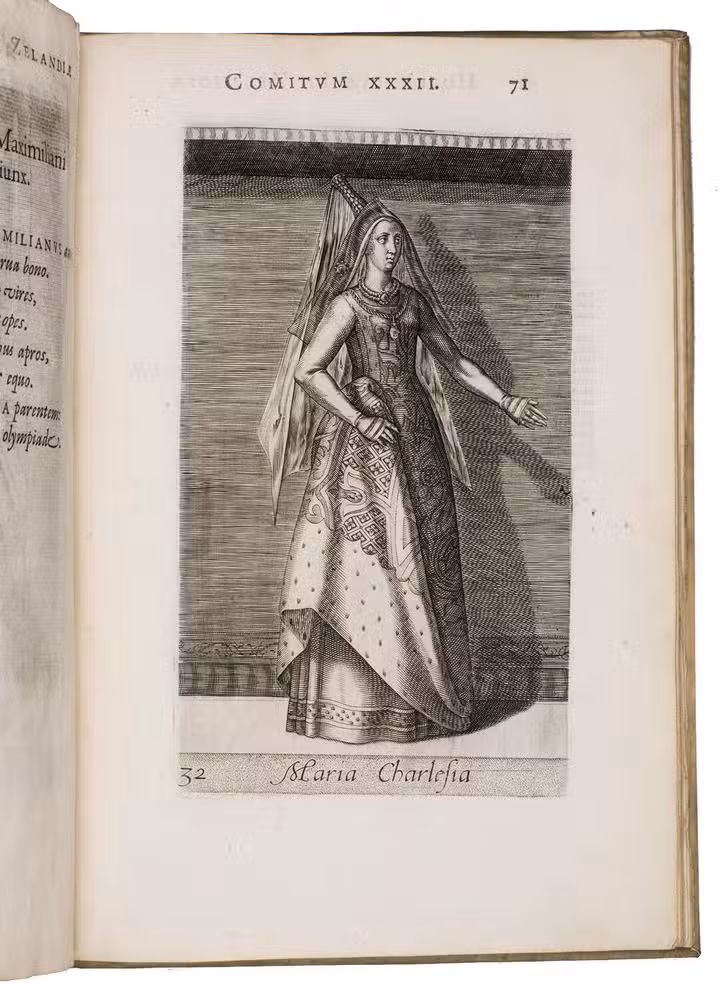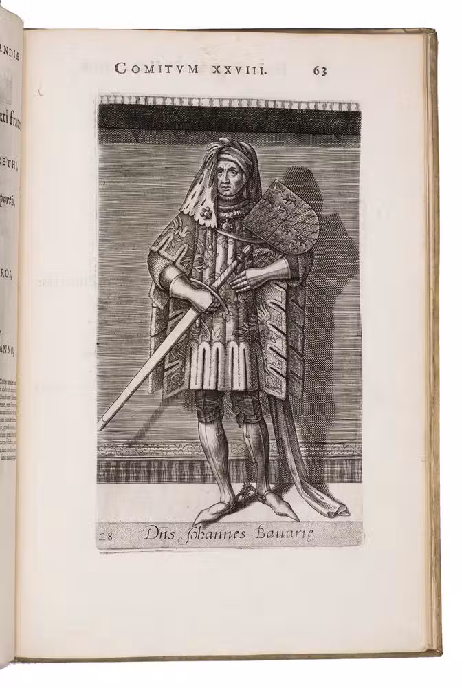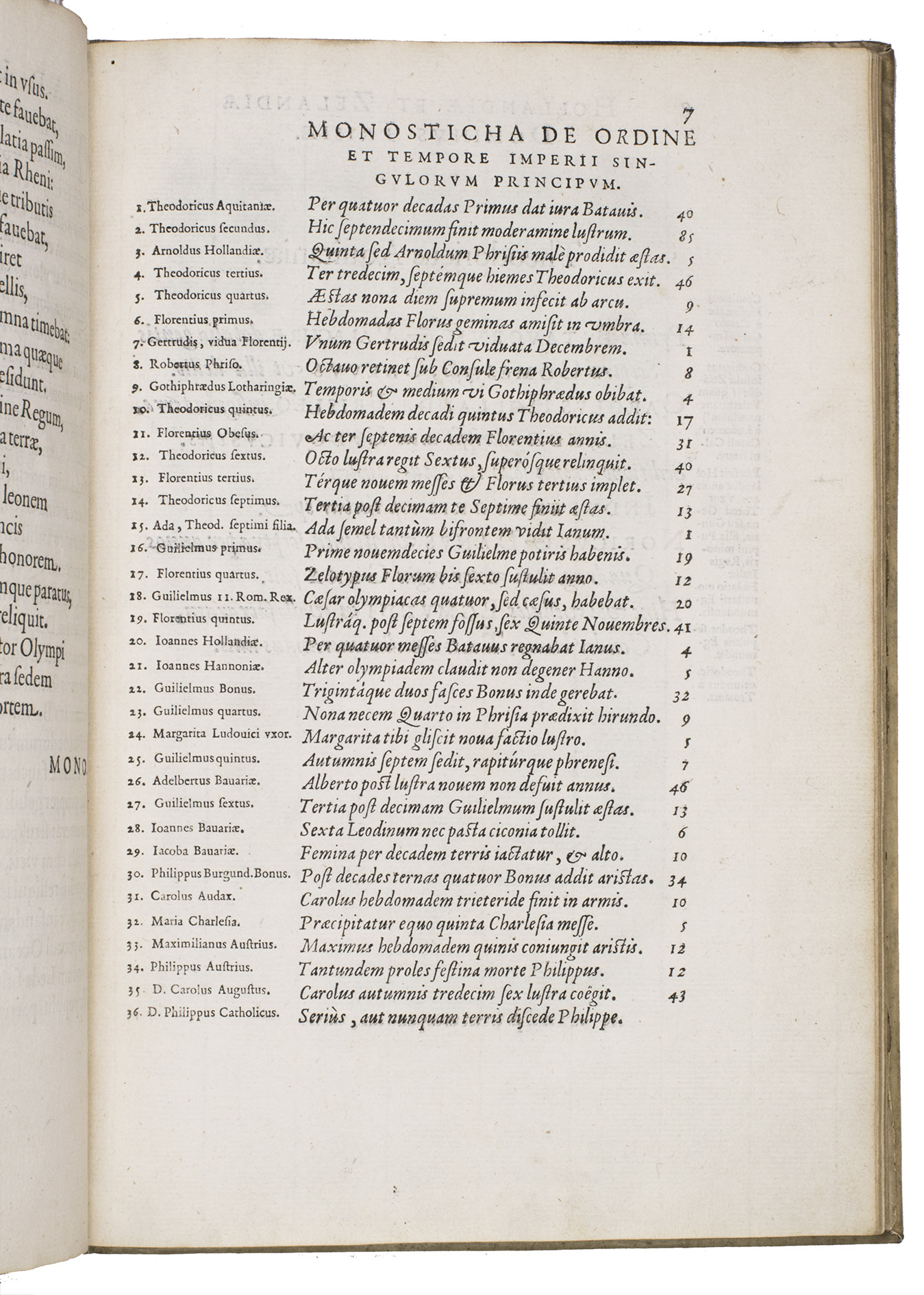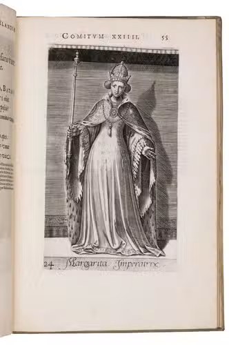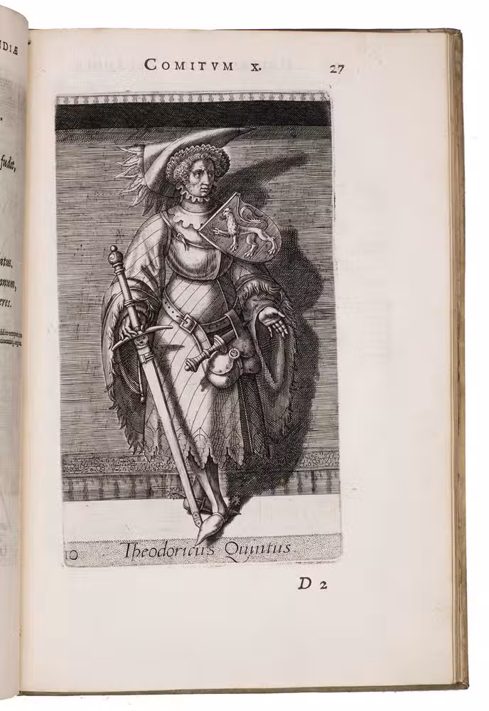 Collection of 36 portraits of counts of Holland, Zeeland, and Friesland, kings and emperors, described in Latin verses by the 16th-century lawyer Michiel Vosmeer. Among the nobles in this work are not only Philip of Burgundy and king Philips II of Spain, but also Jacoba van Beieren, countess of Holland, and Maximilian I, the Holy Roman Emperor. All noble men and women are depicted in an engraving facing the verses by the Dutch publisher and engraver Philipp Galle (1537-1612). Also included is a table with the counts of Holland and Zeeland from 903 to 1549.