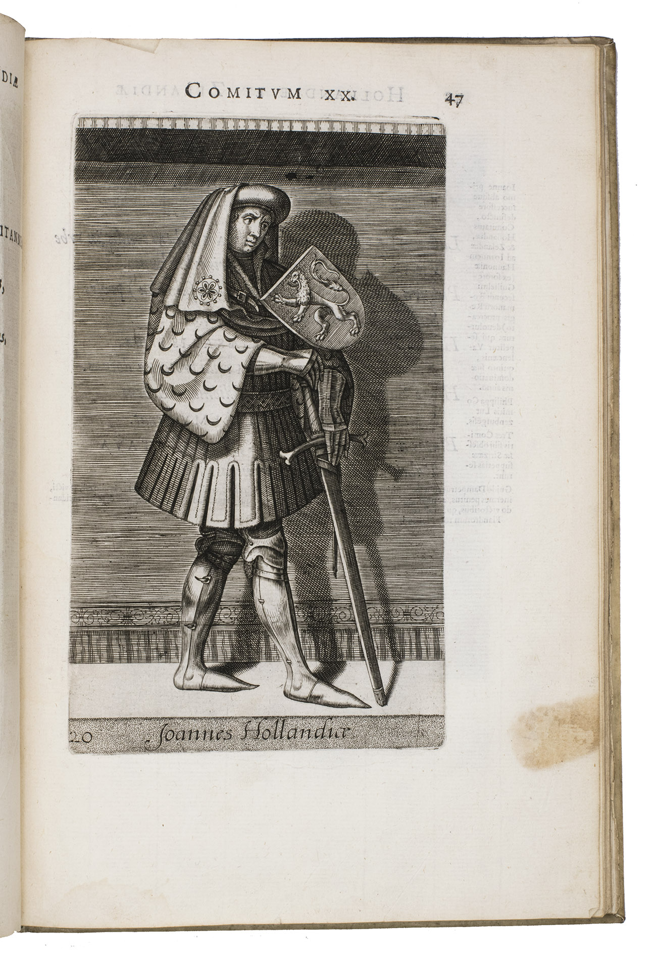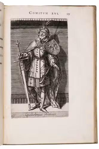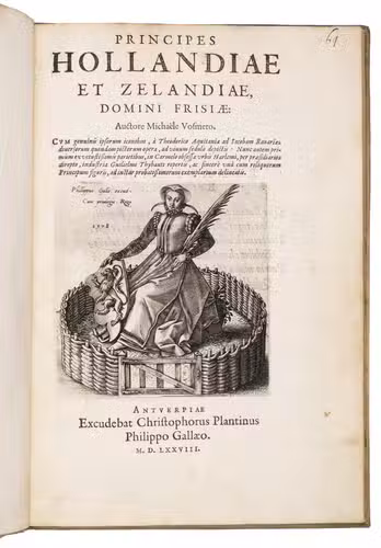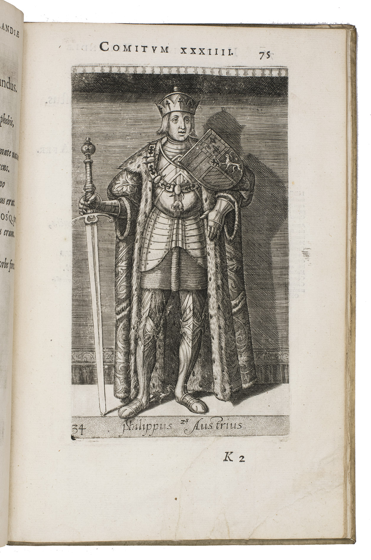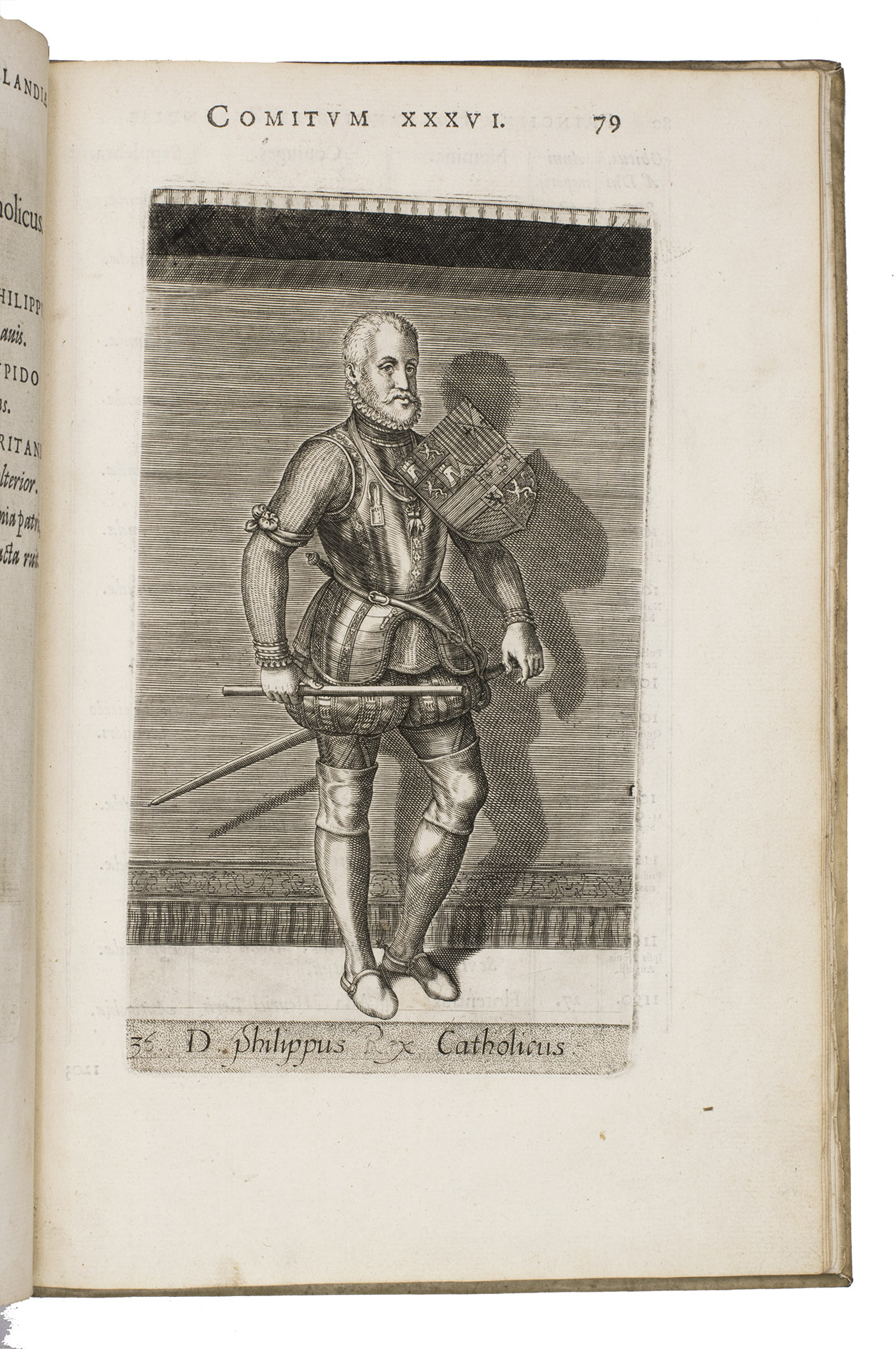 Antwerp, Christophe Plantin, 1578. Small folio. With an engraved title-vignette and 36 full-page engraved portraits of the counts of Holland, Zeeland, and Friesland, and international nobles by Philipp Galle . 17th century vellum, gold-tooled ornaments on the spine. 87, [1 blank] pp.