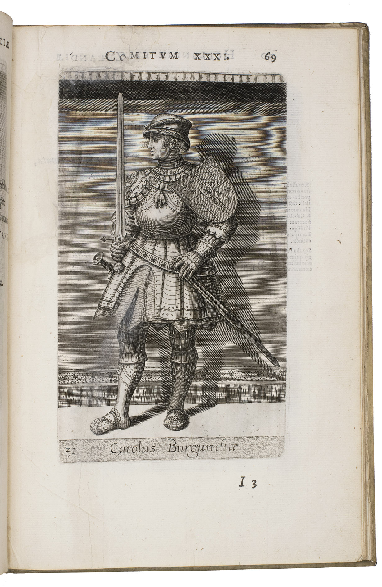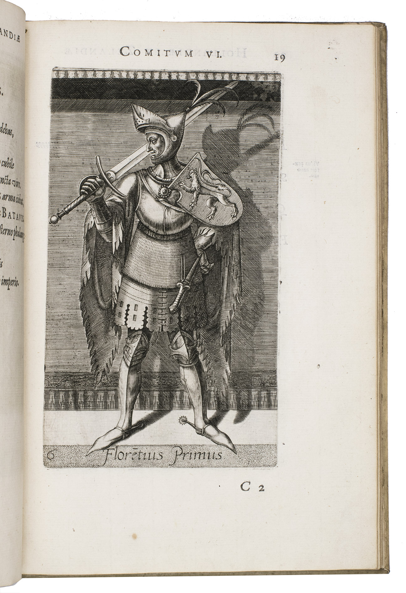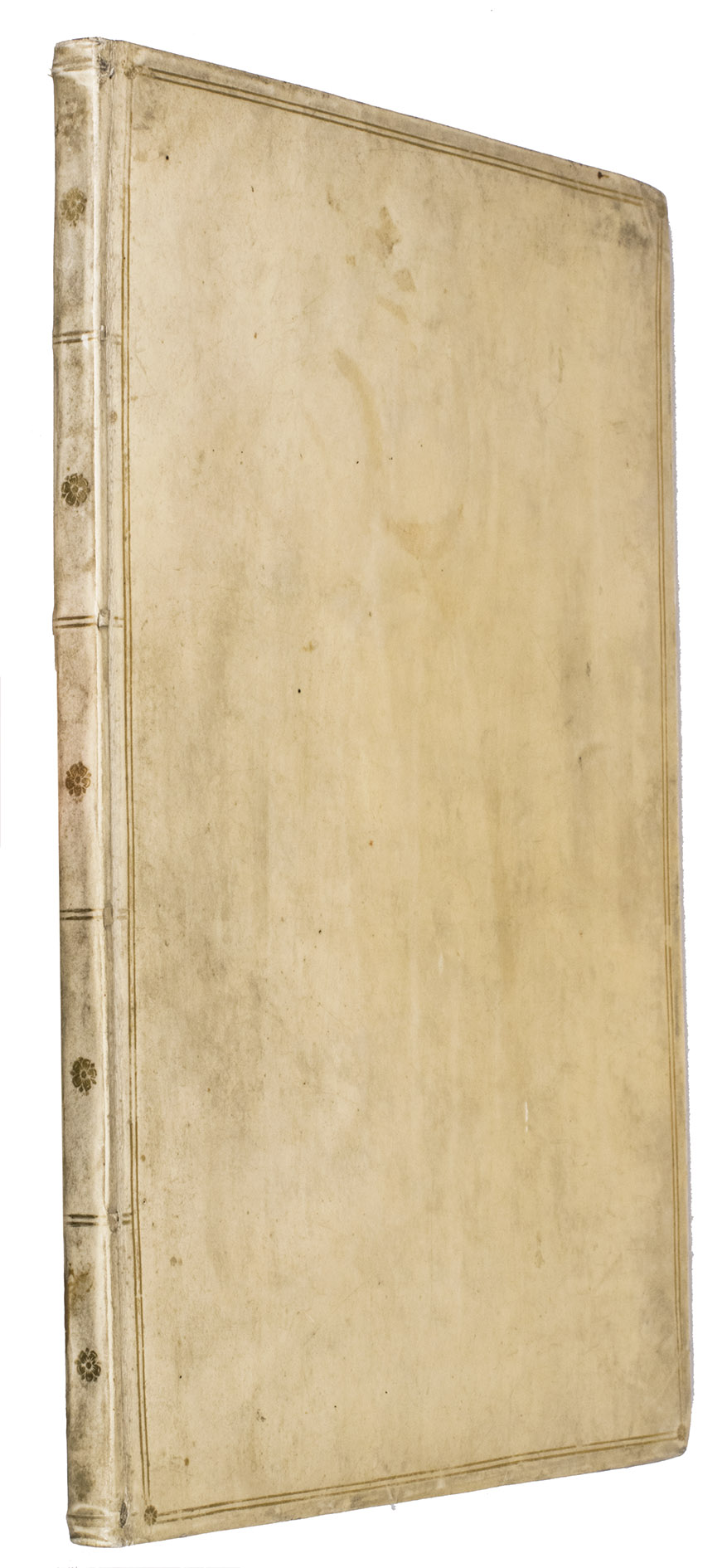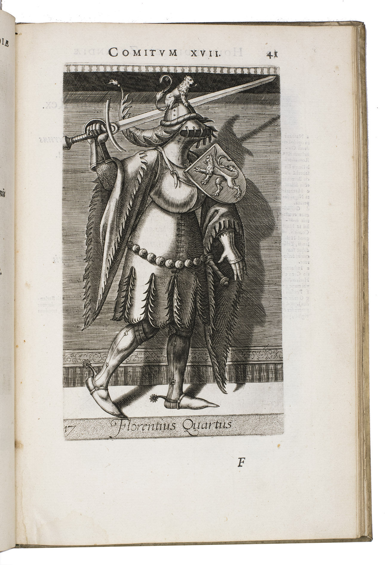 Antwerp, Christophe Plantin, 1578. Small folio. With an engraved title-vignette and 36 full-page engraved portraits of the counts of Holland, Zeeland, and Friesland, and international nobles by Philipp Galle . 17th century vellum, gold-tooled ornaments on the spine. 87, [1 blank] pp.