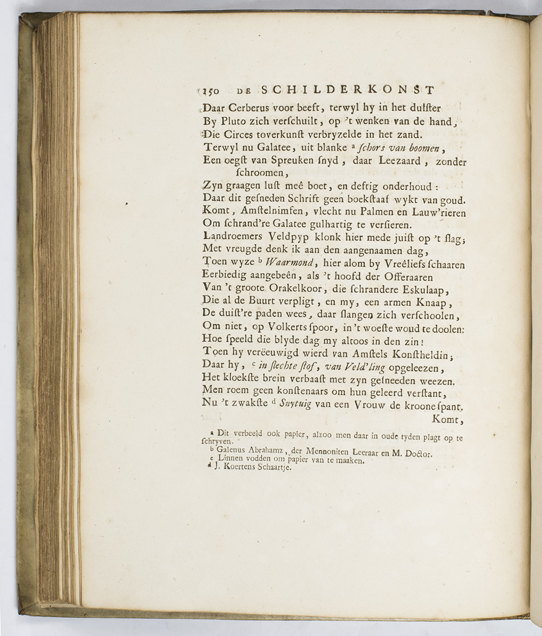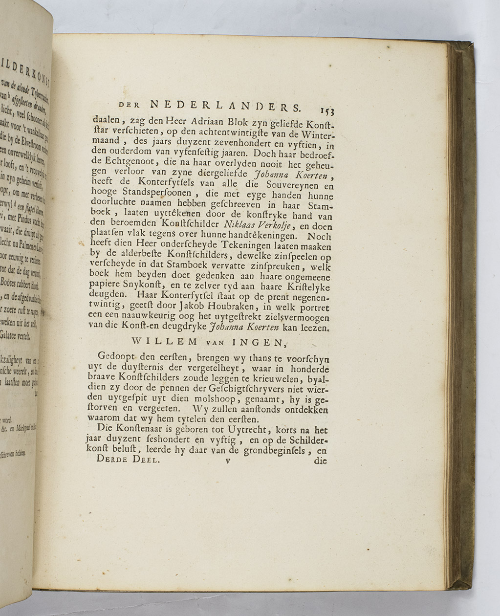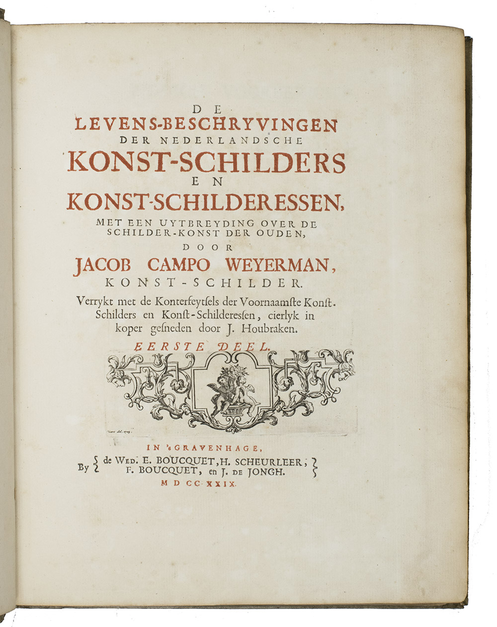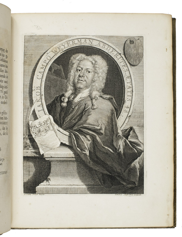 First edition of richly illustrated biographies of more than 100 Dutch painters, male and female, still of interest for the history of Dutch art. The author, Jacob Campo Weyerman (1677-1747), was one of the foremost Dutch authors of the Enlightenment and was known for his merry style. For this history of Dutch art, he leans on Houbraken's De groote schouburgh der Neder-lantsche konstschilders en schilderessen (1718-1721).