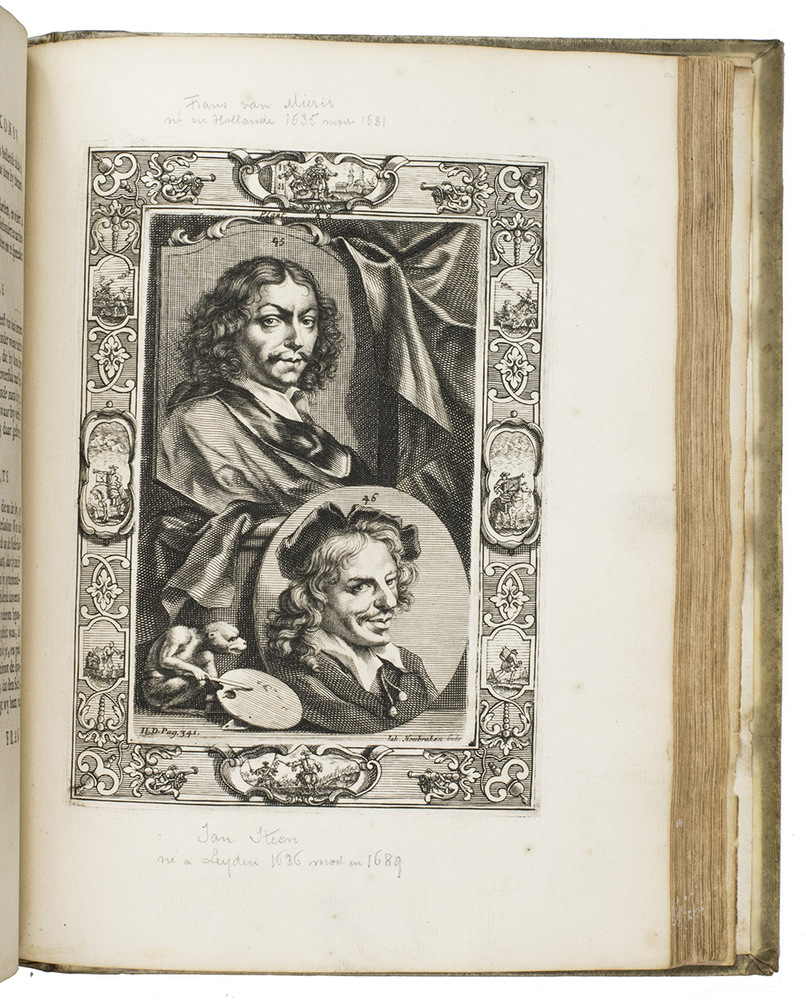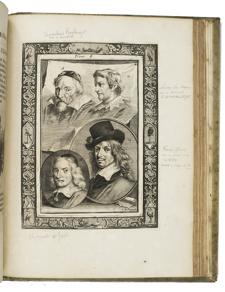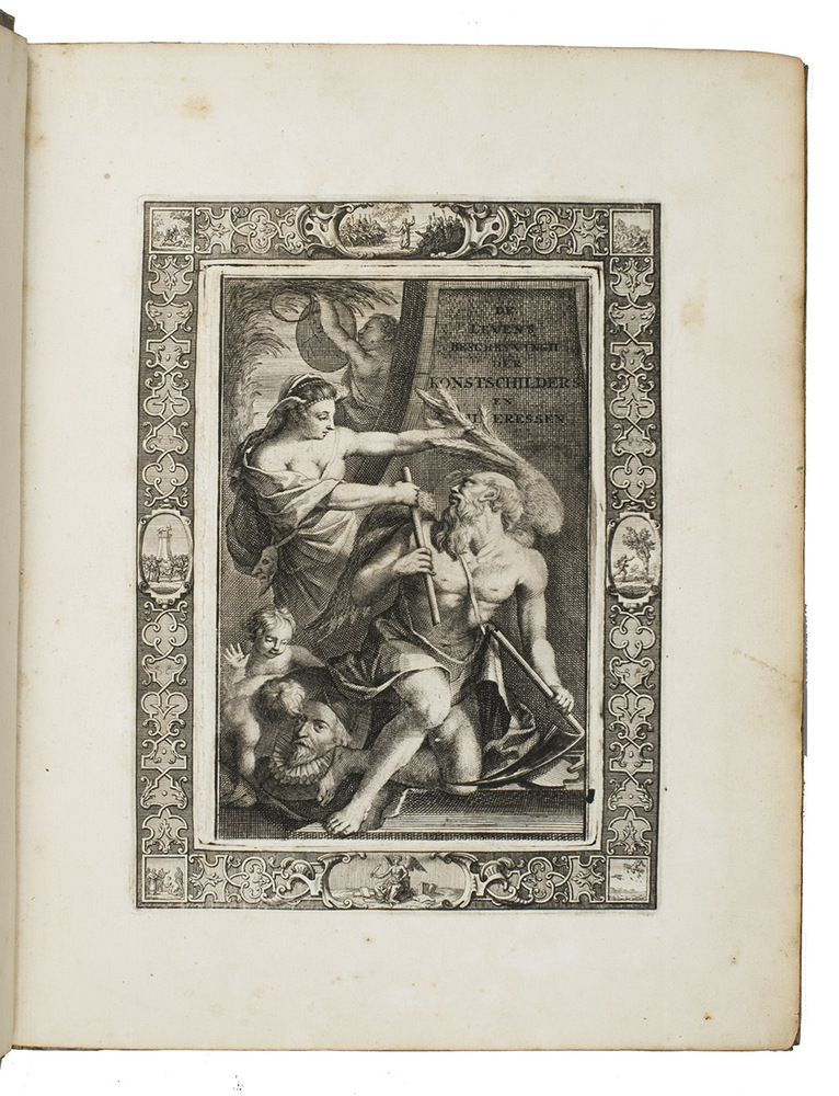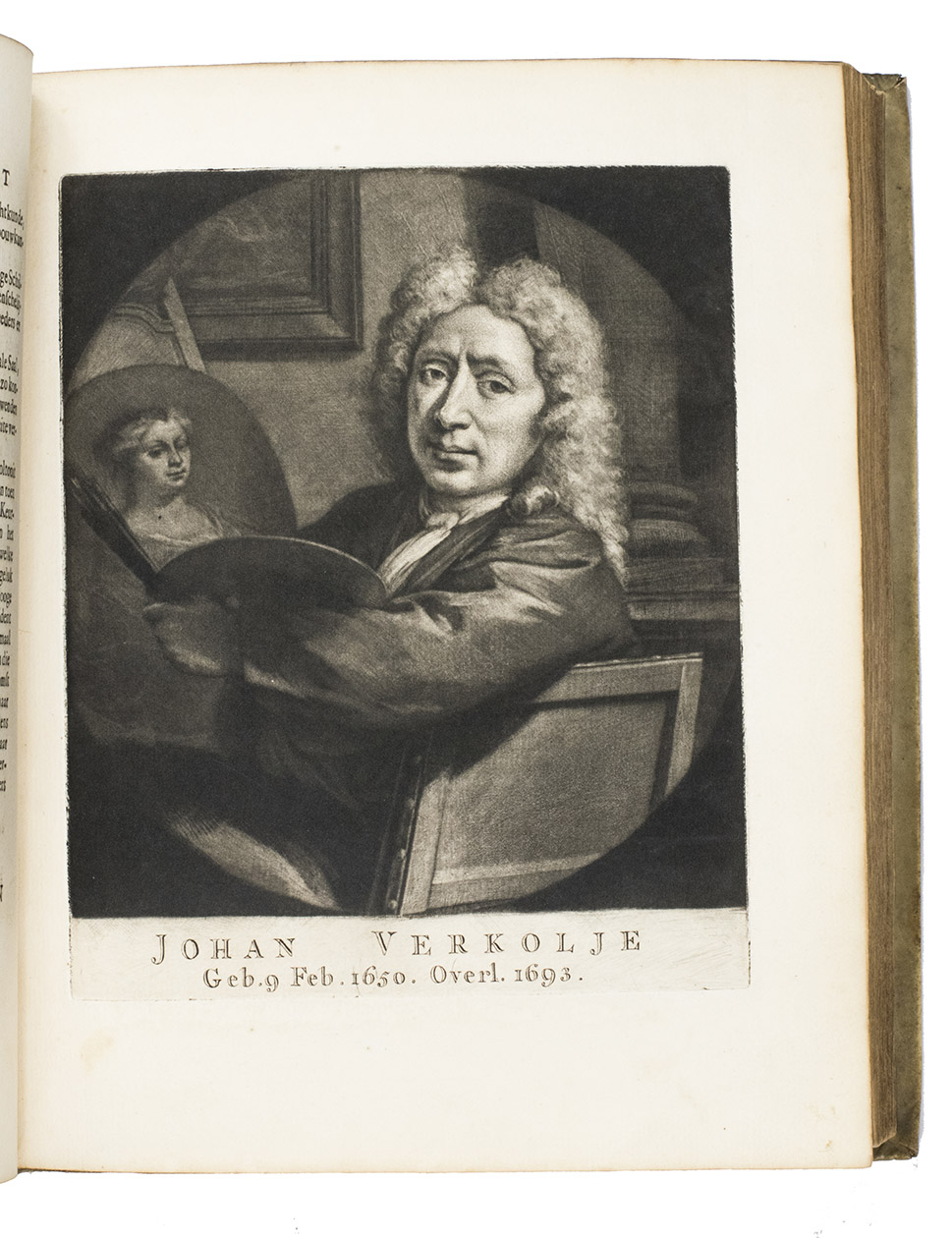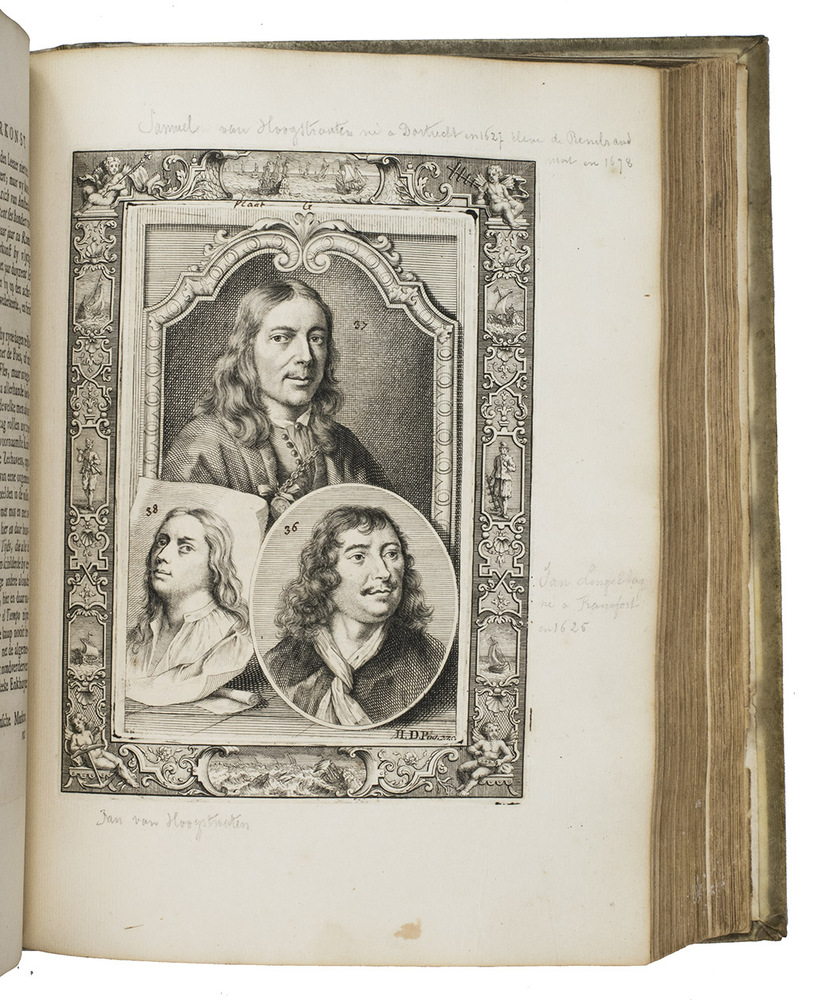 The Hague, widow of E. Boucquet, H. Scheurleer, F. Boucquet, J. de Jongh, 1729 (vols. 1-3); Dordrecht, Ab Blussé & son, 1769 (vol. 4). 4 volumes. 4to. With an engraved frontispiece, title-pages in red and black and with engraved vignettes, a folding portrait of Willem Karel Hendrik Friso (1711-1751), Prince of Orange and from 1747 hereditary Stadtholder Willem IV, a portrait of the author, 40 engraved plates by Houbraken with multiple portraits of artists on each plate, 1 plate with a night scene, 1 mezzotint and 118 engraved vignettes. Contemporary blind-tooled vellum with manuscript titles on spines. Sprinkled edges. [16], 412, [6]; [4], 412, [6], [4], 446, [4].