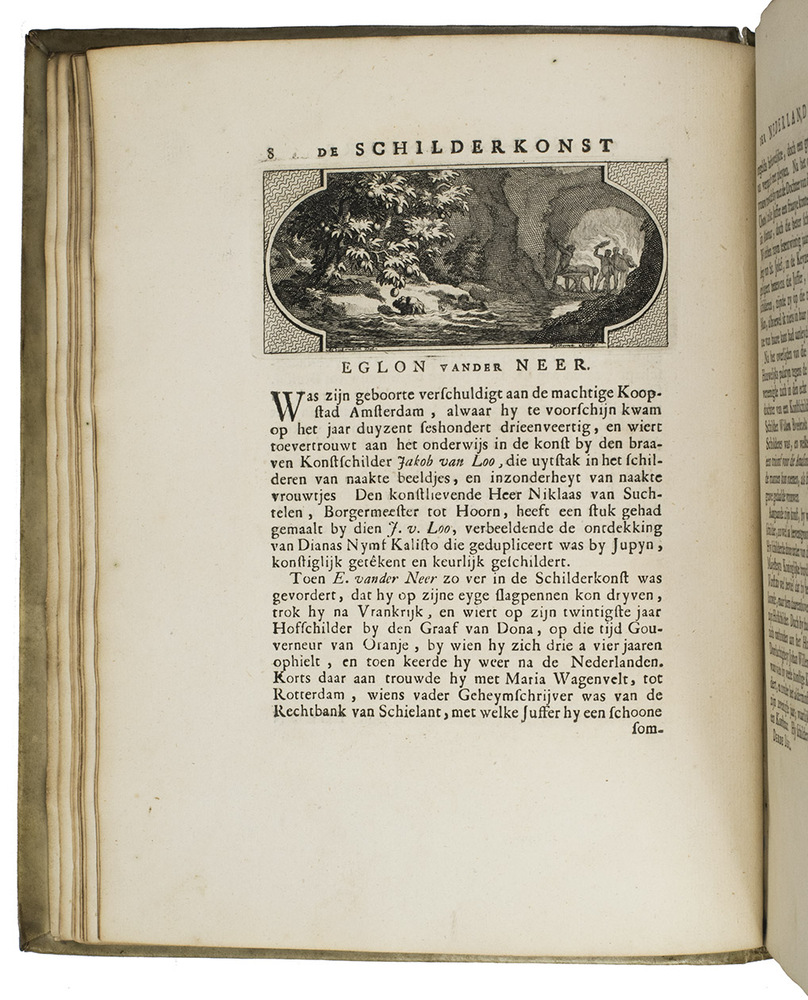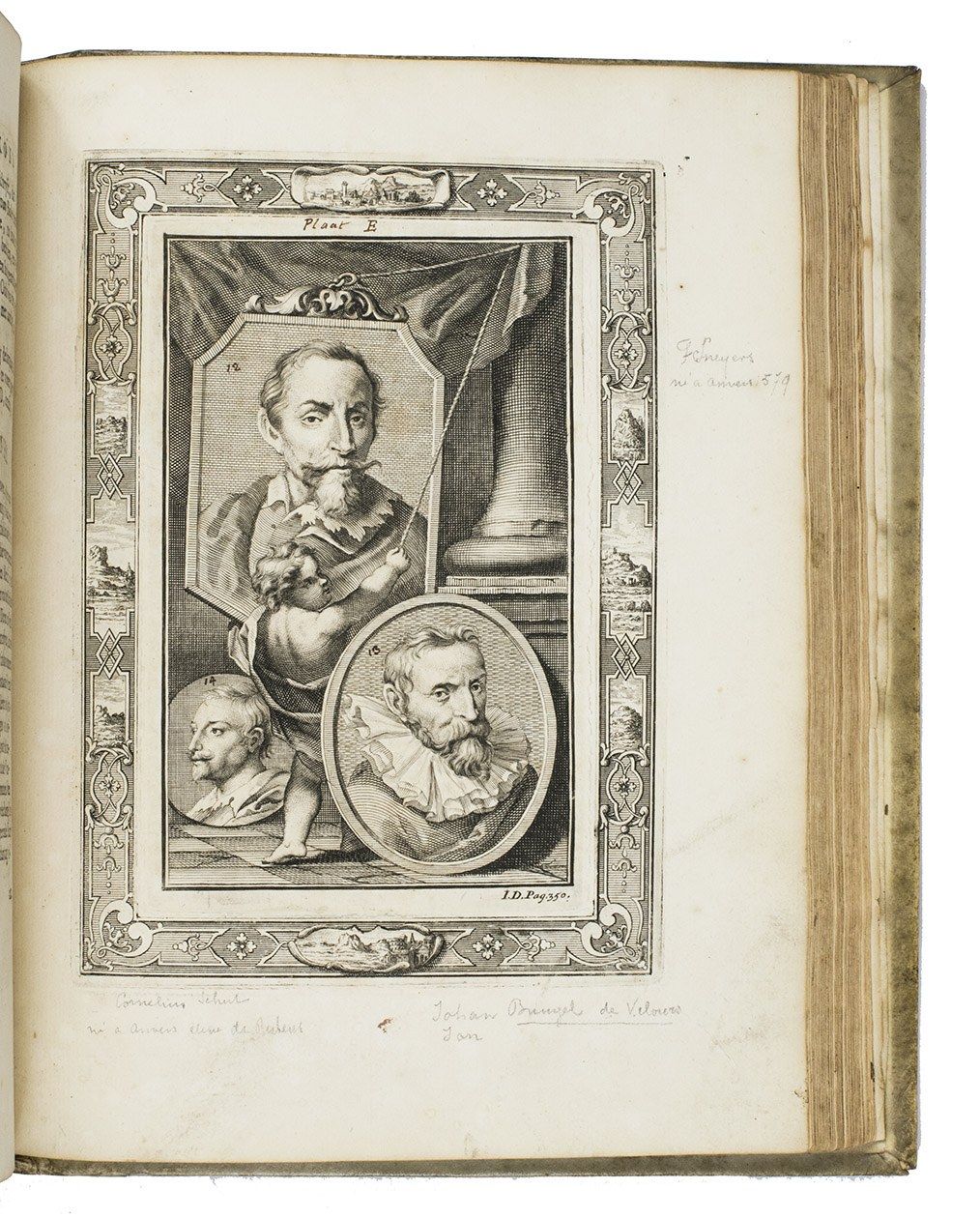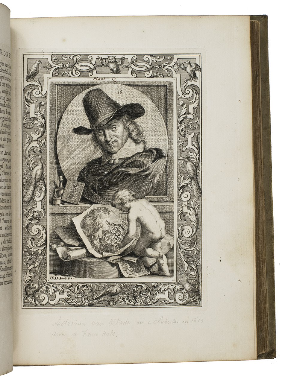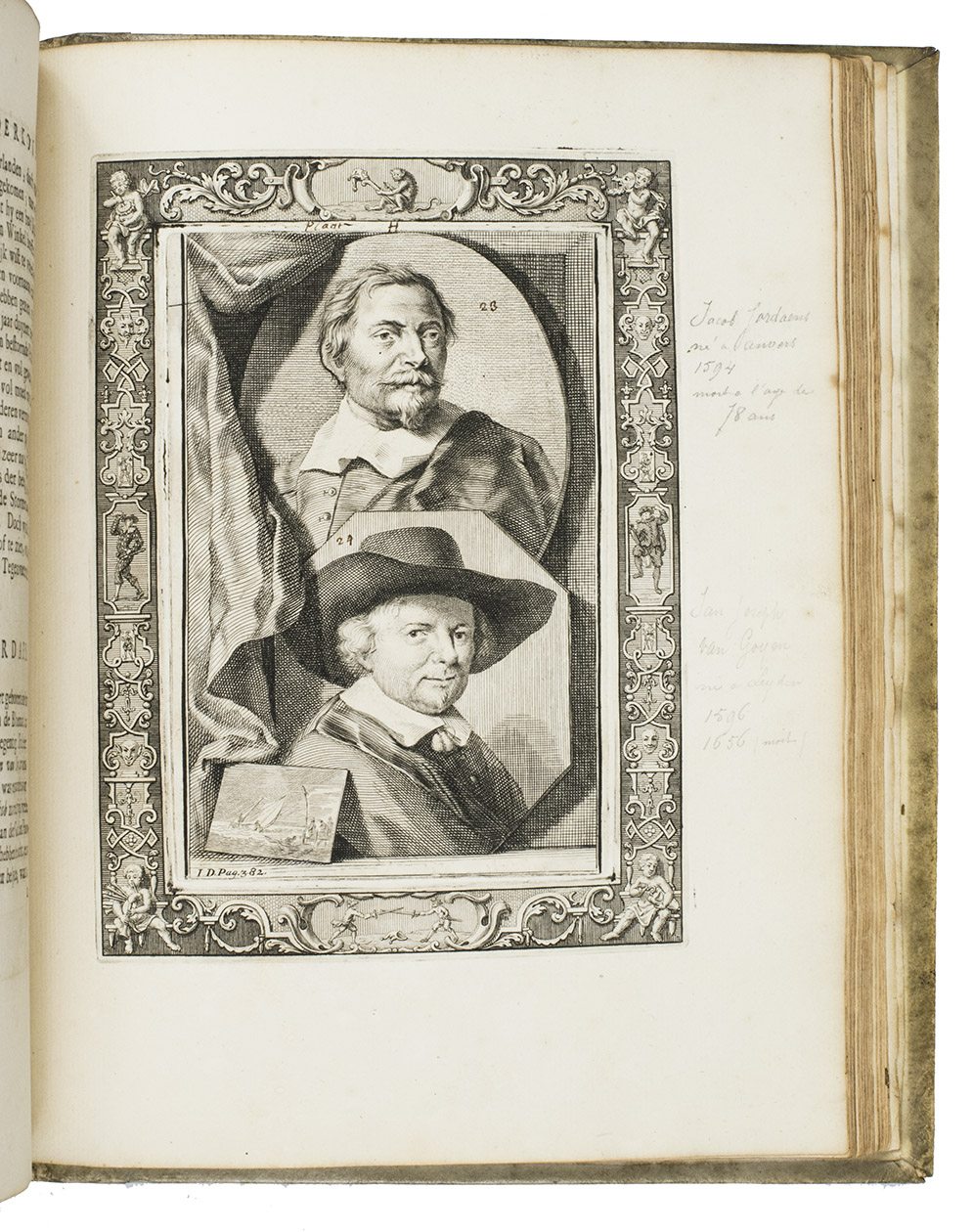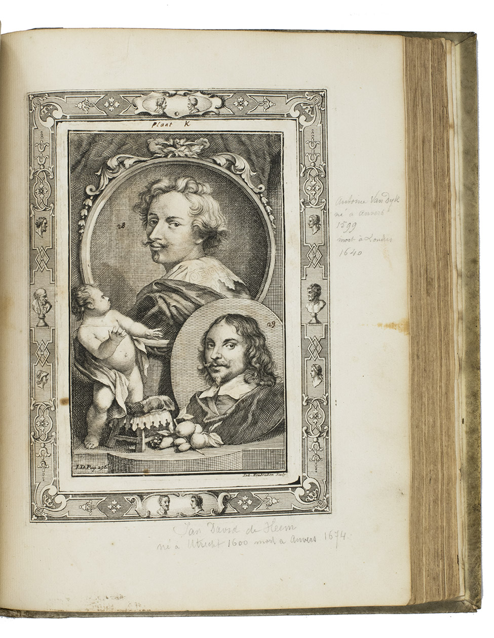 The Hague, widow of E. Boucquet, H. Scheurleer, F. Boucquet, J. de Jongh, 1729 (vols. 1-3); Dordrecht, Ab Blussé & son, 1769 (vol. 4). 4 volumes. 4to. With an engraved frontispiece, title-pages in red and black and with engraved vignettes, a folding portrait of Willem Karel Hendrik Friso (1711-1751), Prince of Orange and from 1747 hereditary Stadtholder Willem IV, a portrait of the author, 40 engraved plates by Houbraken with multiple portraits of artists on each plate, 1 plate with a night scene, 1 mezzotint and 118 engraved vignettes. Contemporary blind-tooled vellum with manuscript titles on spines. Sprinkled edges. [16], 412, [6]; [4], 412, [6], [4], 446, [4].