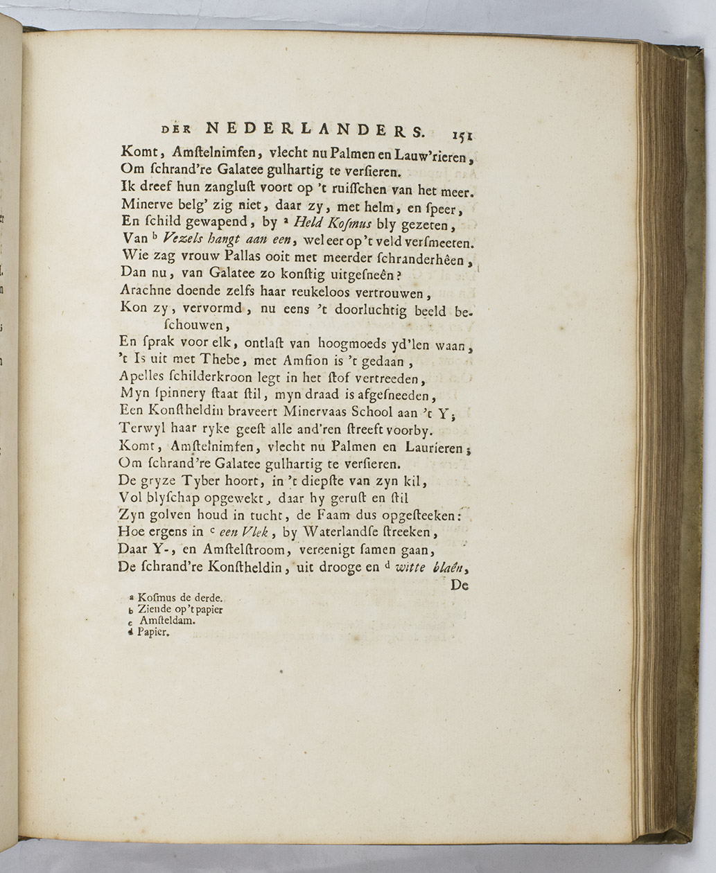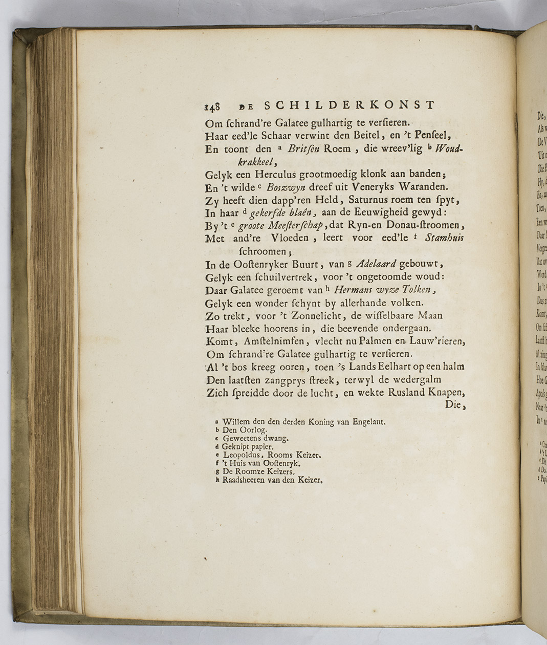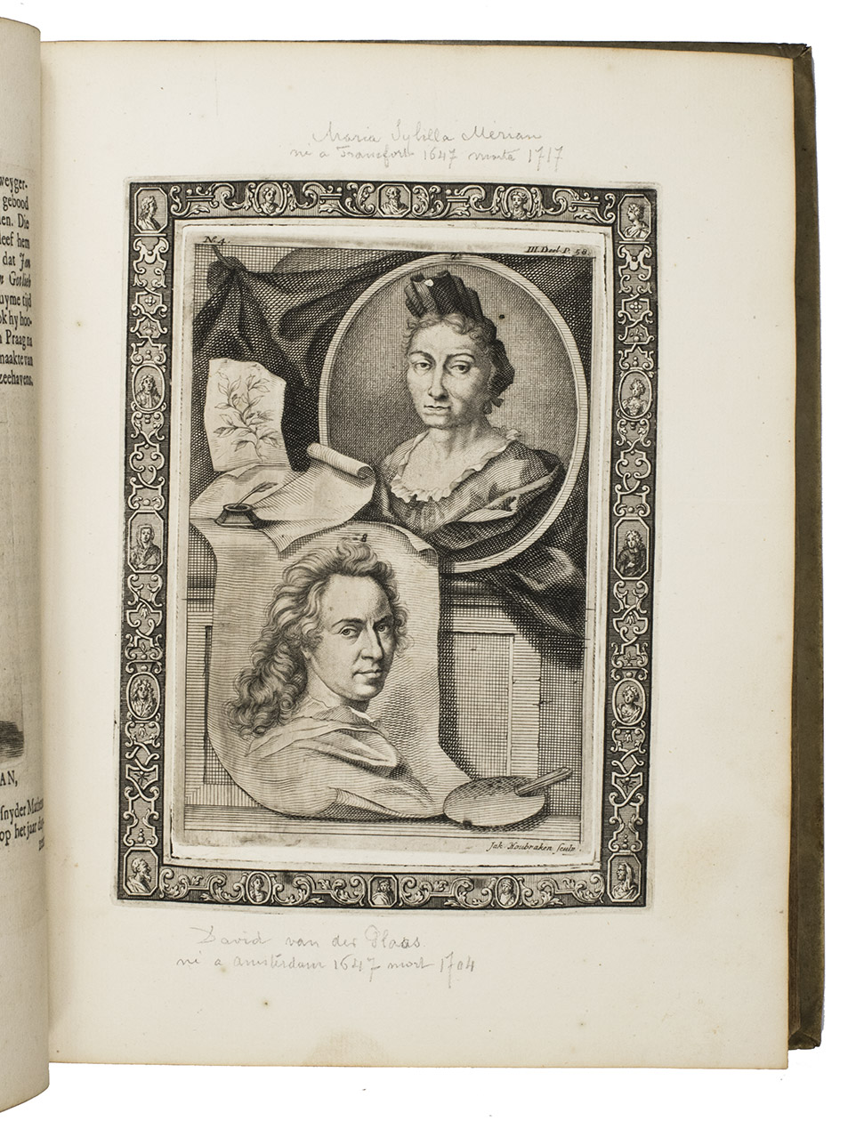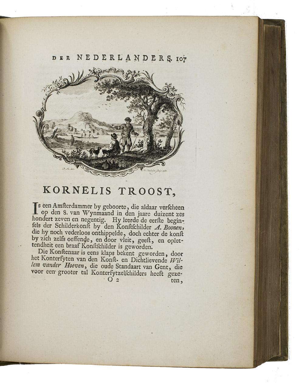 The Hague, widow of E. Boucquet, H. Scheurleer, F. Boucquet, J. de Jongh, 1729 (vols. 1-3); Dordrecht, Ab Blussé & son, 1769 (vol. 4). 4 volumes. 4to. With an engraved frontispiece, title-pages in red and black and with engraved vignettes, a folding portrait of Willem Karel Hendrik Friso (1711-1751), Prince of Orange and from 1747 hereditary Stadtholder Willem IV, a portrait of the author, 40 engraved plates by Houbraken with multiple portraits of artists on each plate, 1 plate with a night scene, 1 mezzotint and 118 engraved vignettes. Contemporary blind-tooled vellum with manuscript titles on spines. Sprinkled edges. [16], 412, [6]; [4], 412, [6], [4], 446, [4].