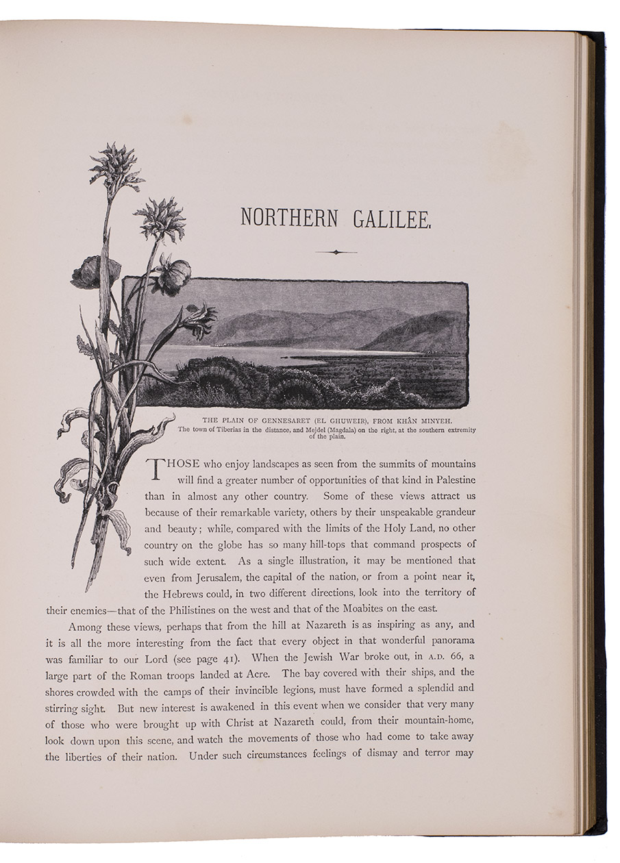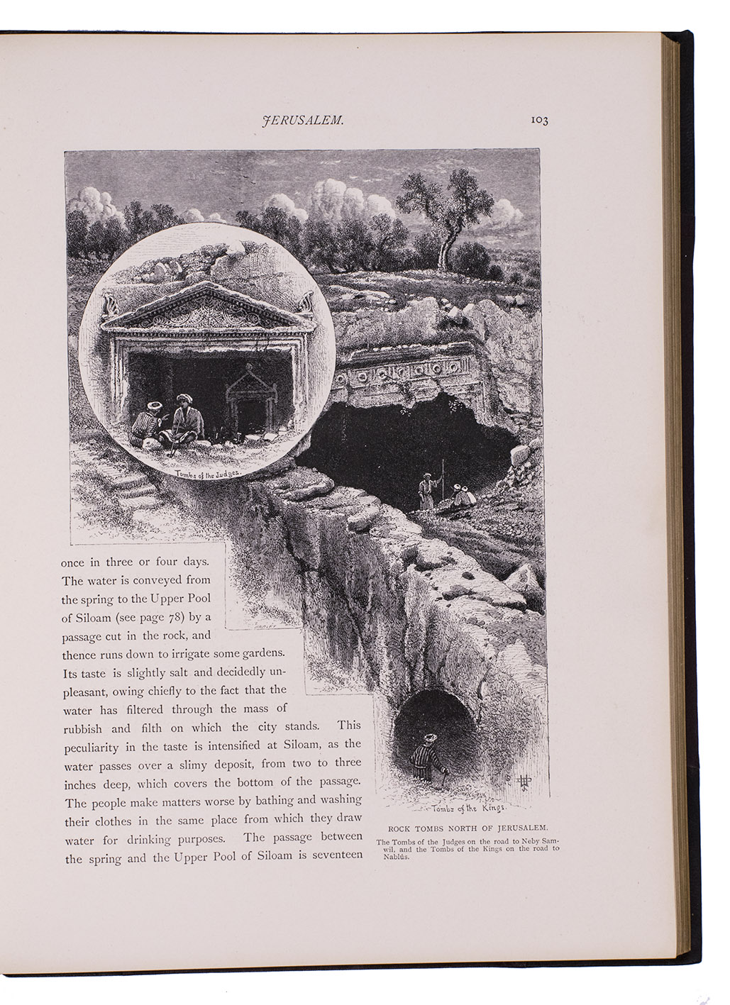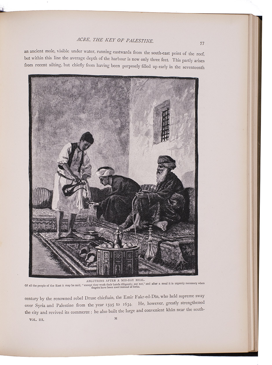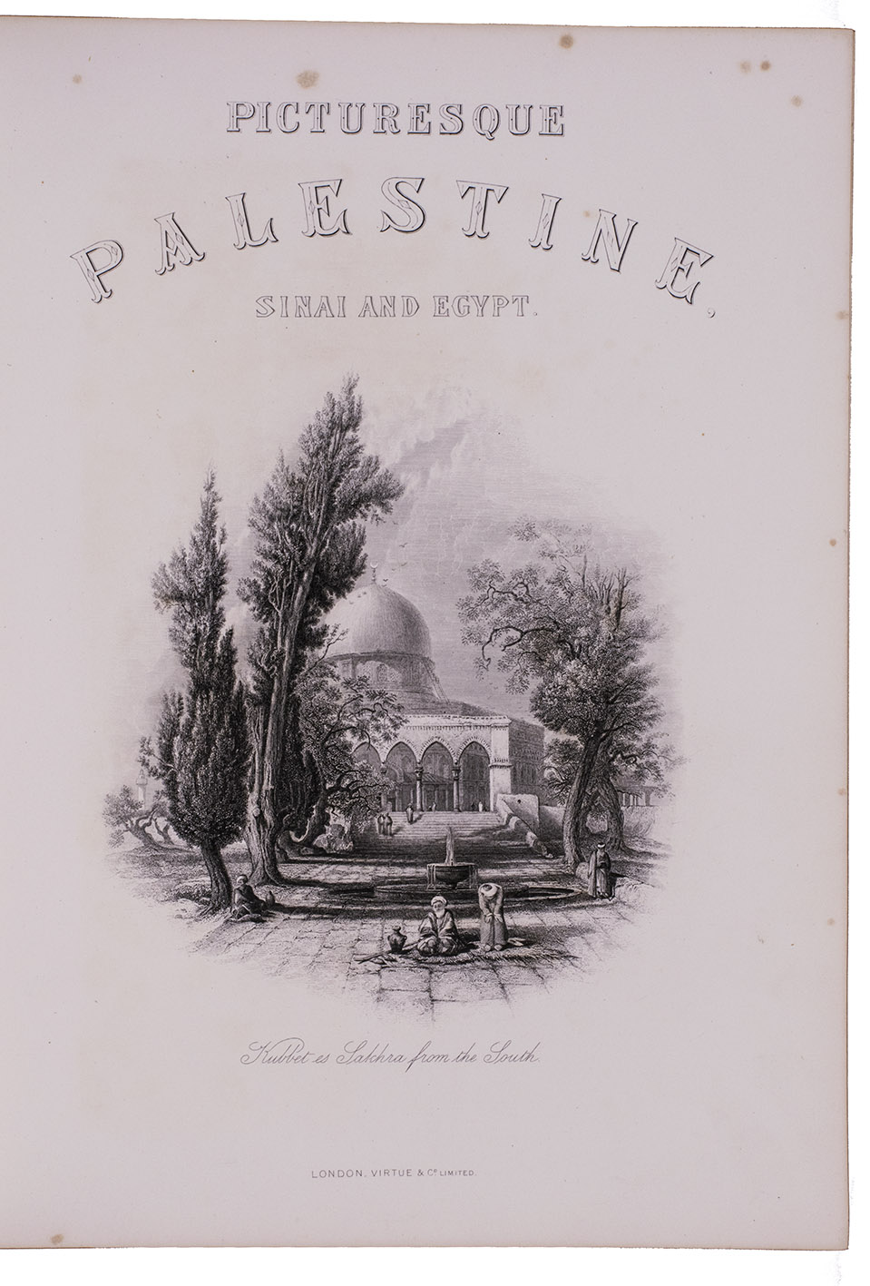 First edition of a beautifully illustrated description of Palestine, Sinai and Egypt by Major-General Sir Charles Wilson (1836-1905). In the preface to his biography on Wilson, Charles Moore Watson wrote that Wilson "probably did more than any other man to increase the knowledge of the geography and archeology of Asia Minor, Palestine and the adjacent countries". It also includes descriptions by distinguished explorers in Palestine such as Canon Tristram, Charles Warren, M. Rogers, and notably Major Claude Reignier Conder, R.E. (1848-1910), as well as several others. The fourth volume is completely devoted to the Sinai (pp. 1-120) and Egypt (pp. 121-234). The illustrations in the parts that describe the Sinai include a detailed map of the Sinai and Egypt, views of Jebel Hammam Far'un, Jebel Kanata, the mountains at the head of Wady Leja and Jebel ed Deir.
