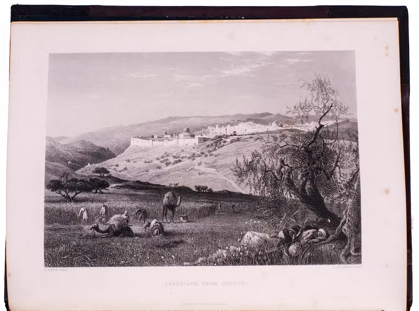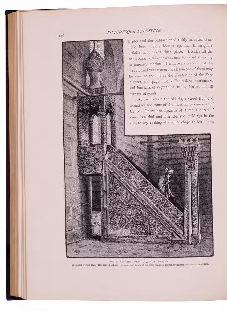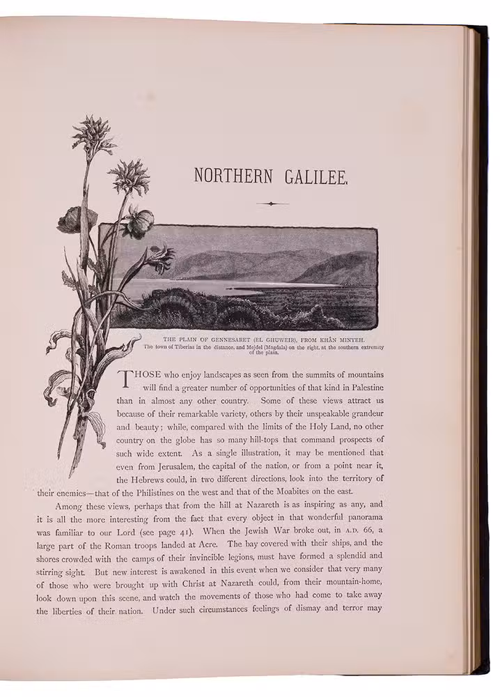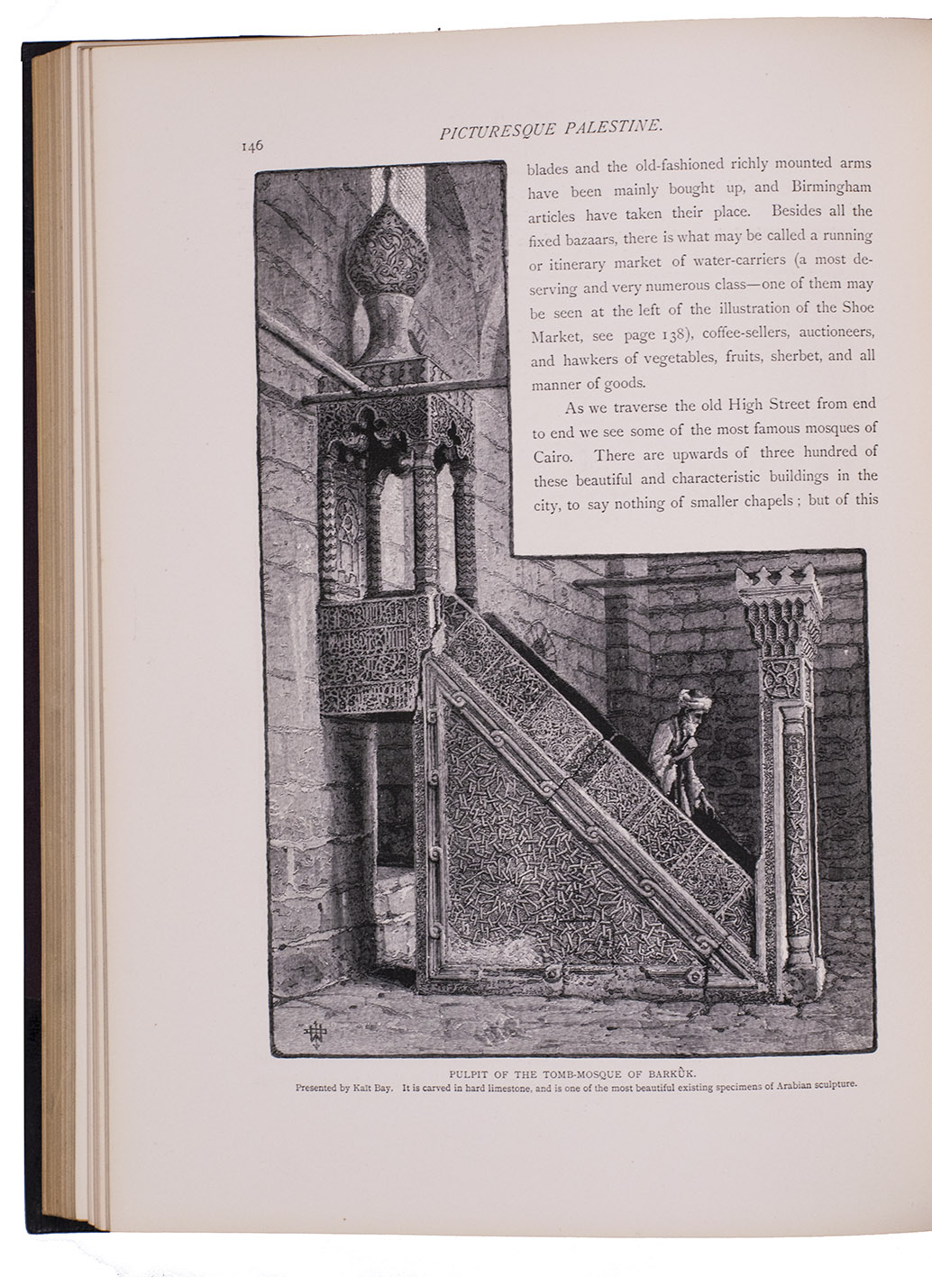 First edition of a beautifully illustrated description of Palestine, Sinai and Egypt by Major-General Sir Charles Wilson (1836-1905). In the preface to his biography on Wilson, Charles Moore Watson wrote that Wilson "probably did more than any other man to increase the knowledge of the geography and archeology of Asia Minor, Palestine and the adjacent countries". It also includes descriptions by distinguished explorers in Palestine such as Canon Tristram, Charles Warren, M. Rogers, and notably Major Claude Reignier Conder, R.E. (1848-1910), as well as several others. The fourth volume is completely devoted to the Sinai (pp. 1-120) and Egypt (pp. 121-234). The illustrations in the parts that describe the Sinai include a detailed map of the Sinai and Egypt, views of Jebel Hammam Far'un, Jebel Kanata, the mountains at the head of Wady Leja and Jebel ed Deir.