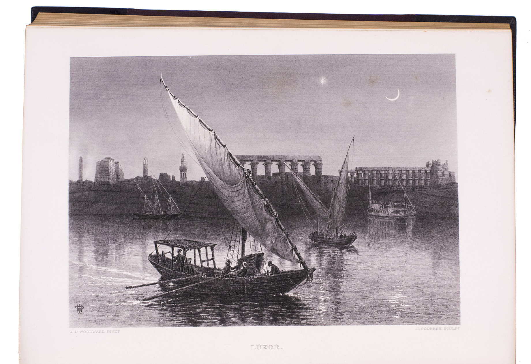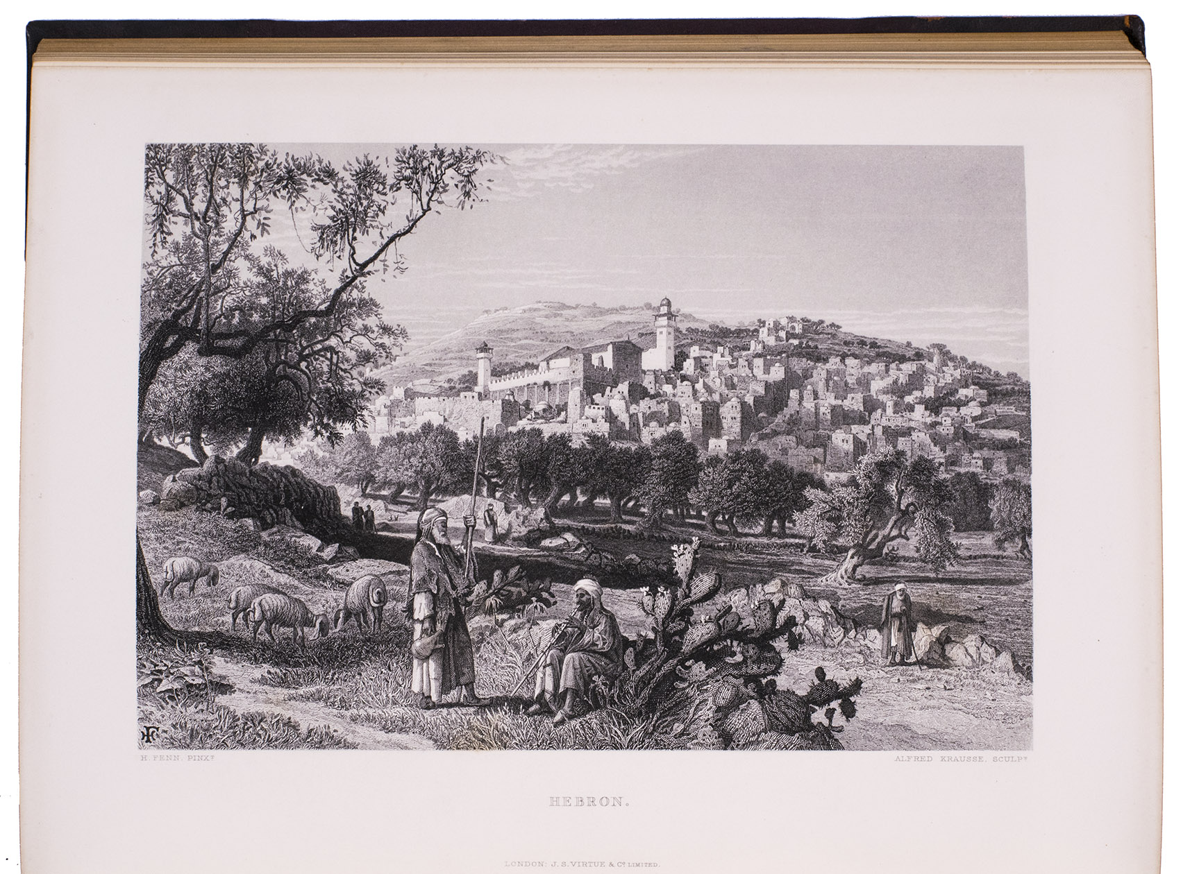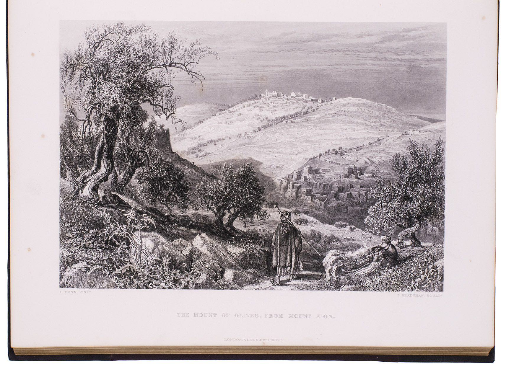 London, Virtue and Co., [ca. 1870]. 4 volumes. Large 4to (33 x 25 cm). With 4 title-pages in red and black, each with a different large steel-engraved vignette, 38 steel-engraved plates (including 4 different frontispieces), 2 double-page engraved maps of Egypt and Sinai, printed in brown, and 576 wood-engravings on integral leaves, many full-page. Contemporary half sheepskin. [2], X, 240; [2], VI, 240; [2], IV, 240; [2], IV, 236 pp.