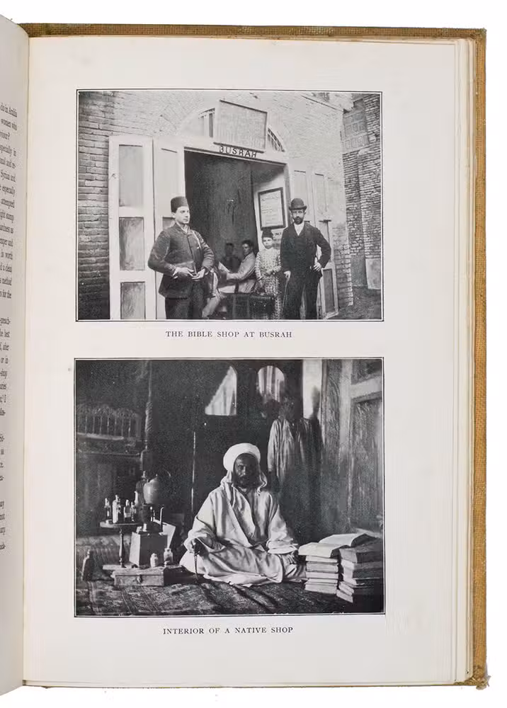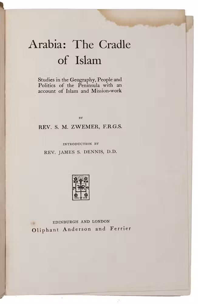 An account of the history, geography, religion, and political and social situation of the Middle East, and especially of the Arabian Peninsula, from a Christian missionary point of view. This information is presented alongside accounts of the author's experiences and it is illustrated with images of local peoples, landscapes and examples of Arabic script and music. According to the preface, this second edition of Zwemer's first work, first published in 1899/1900, was published in order to correct some minor errors that had made their way into the first edition because of the physical distance between the author and the publishers. At the time of publication, Zwemer was doing missionary work in Arabia, while his work was being published in the US. The present copy was published in Edinburgh and London, but apparently (according to the verso of the title-page) printed by the Caxton Press in New York.