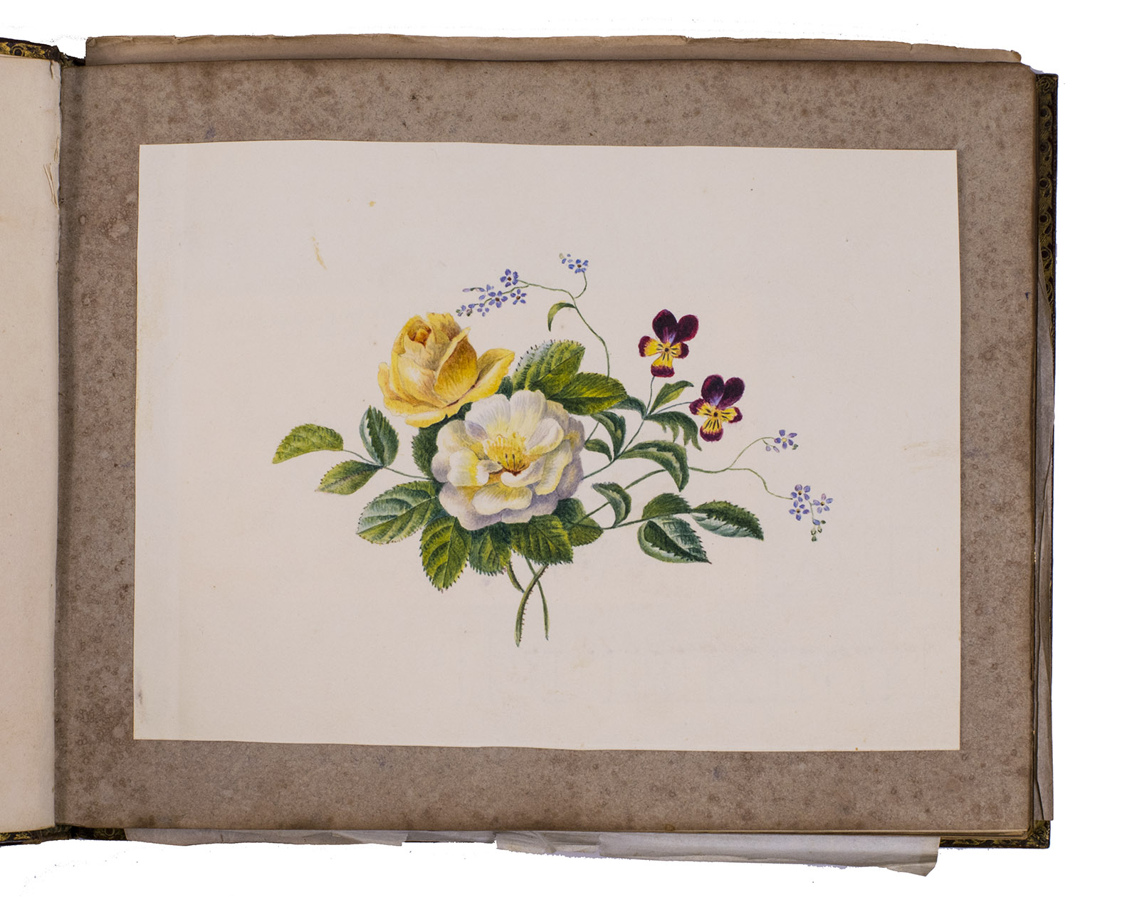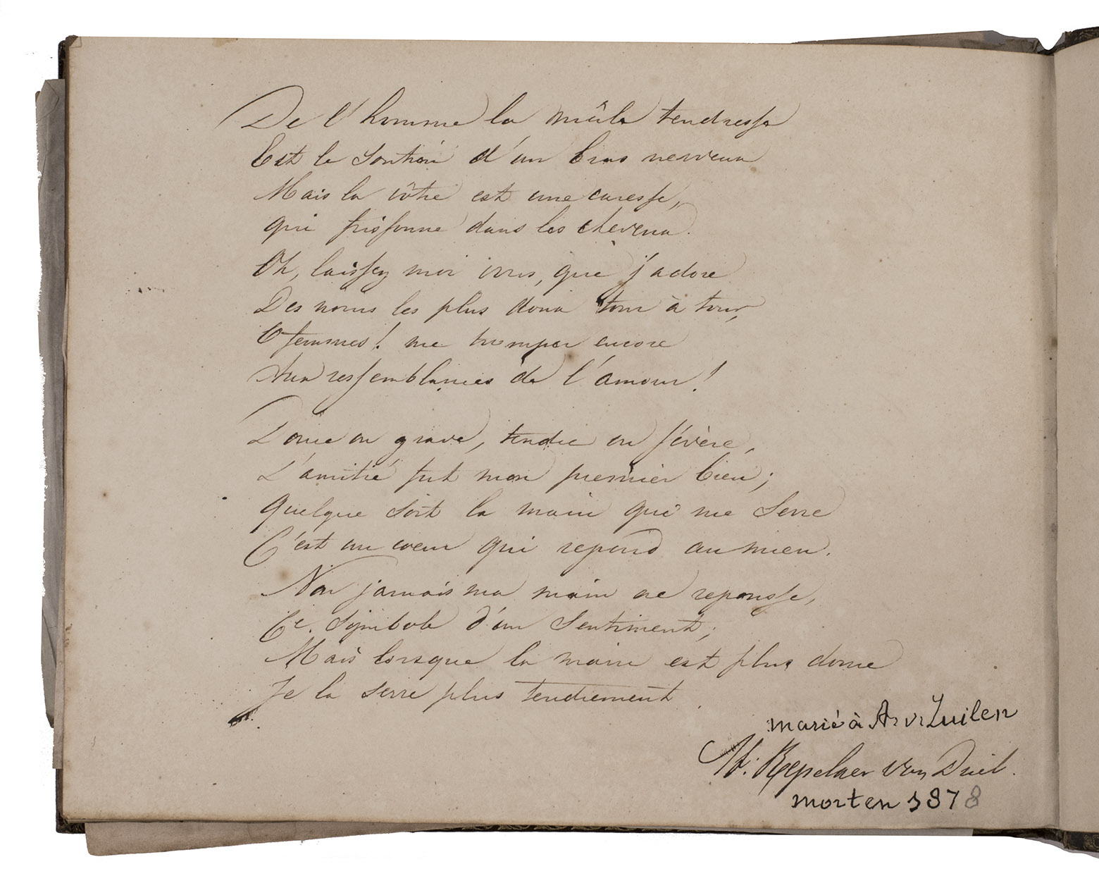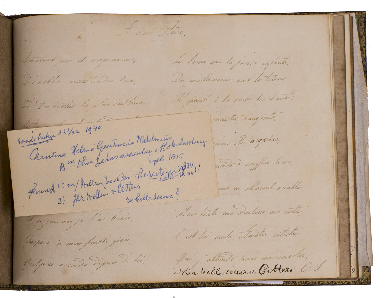 A beautiful example of a richly decorated and illustrated album amicorum, a book of poetry and a scrapbook in one. Alba amicorum were a popular and pleasant pastime at this time, as the first sentence of the album immediately makes clear: "Albums are all the rage, and scrap-books too". Although the album contains many poems by various poets, possibly mostly copied by the owner of the album herself, a girl from a noble family, probably Miss van Boetzelaer (?), the album also contains many contributions by others, particularly women. Examples are F. Testa, Adèle B., J. van Winter, H.v.W., A. van der Goes, H.G. v.d. G., J.C. van Beresteyn, H.J.B., C.B., A. de Schwartzenberg et Hohenlansberg, H. Repelaer van Driel, A.G. v. B. en A. de la B. The contributors probably made the drawings and watercolours to accompany their written entries and the owner mounted them in the album herself. Some of the most remarkable among the richly illustrated contributions are a loosely inserted mountain landscape in watercolour by Johannes van Ravenswaay (1815-1849), a bouquet with flowers in gouache by Wilhelma van Boetzelaer (an English teacher at the royal military academy at Breda) and another bouquet by A.J. Taets d'Amerongen née de Boetzelaer. Another beautiful drawing of three hummingbirds is executed in gouache and decorated with gold by Suzette van B., who wrote several contributions for this album. Also beautiful are a still life with fruits drawn by Mimi Stratenus, two gouaches of butterflies on pith paper by C. Bicker Borski and Christine van Berestyn, and gouache paintings of a rose by Elisa Hanbury and a butterfly by Dorothée Palland Sandberg. Also mounted in this album are engraved portraits of William Shakespeare (1564-1616) and Pierre Corneille (1606-1684), probably reflecting the poetic tastes of the albums owner. This album is not only a beautiful example of the alba amicorum culture among noble women, which flourished for centuries, but also a book for a woman made primarily by women, reflecting an important part of the culture of noble women in the first half of the 19th century.