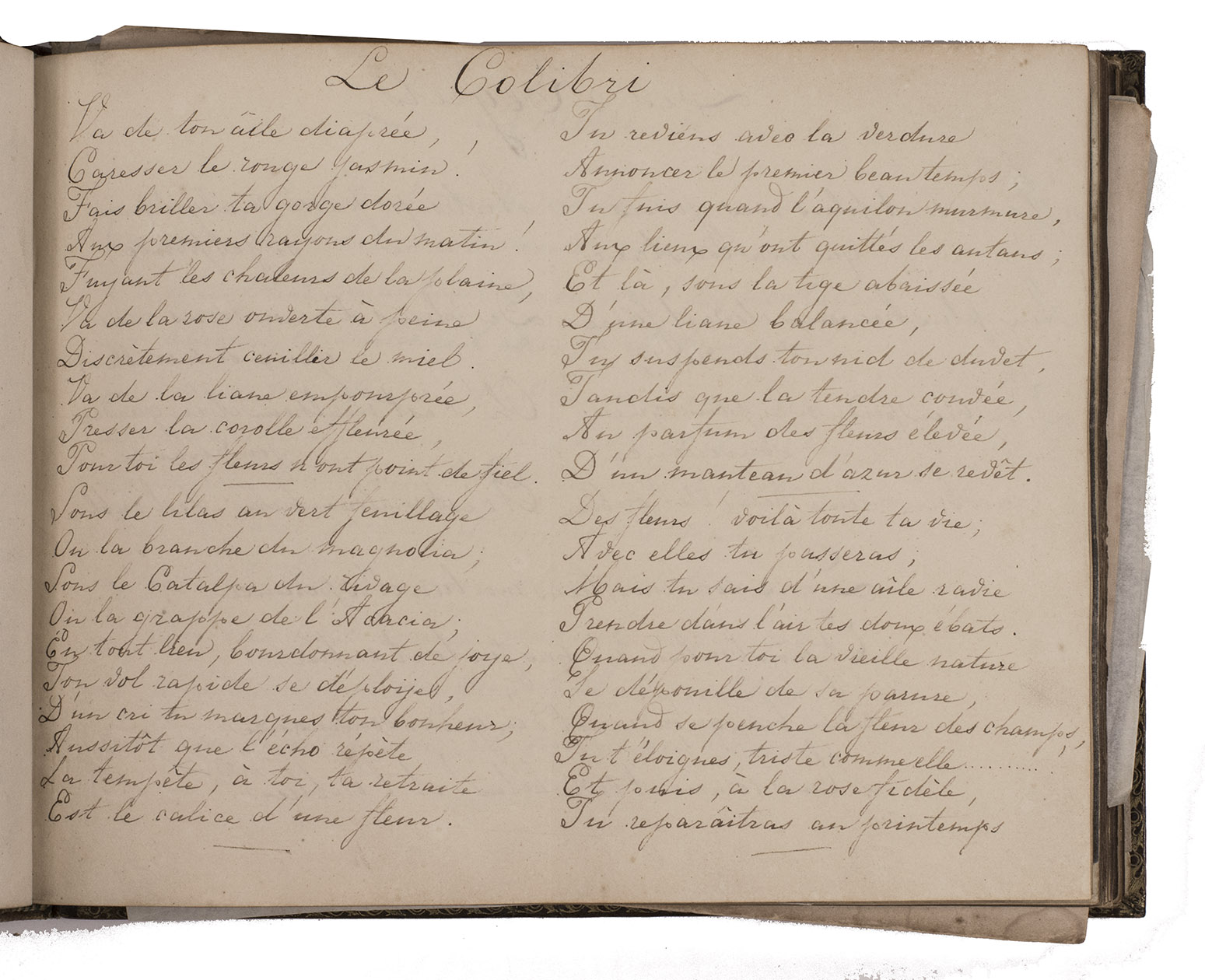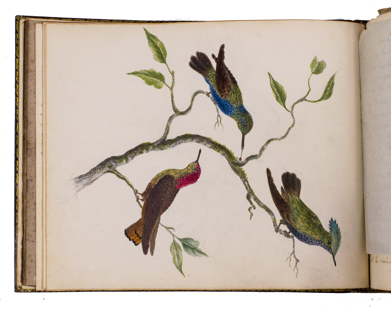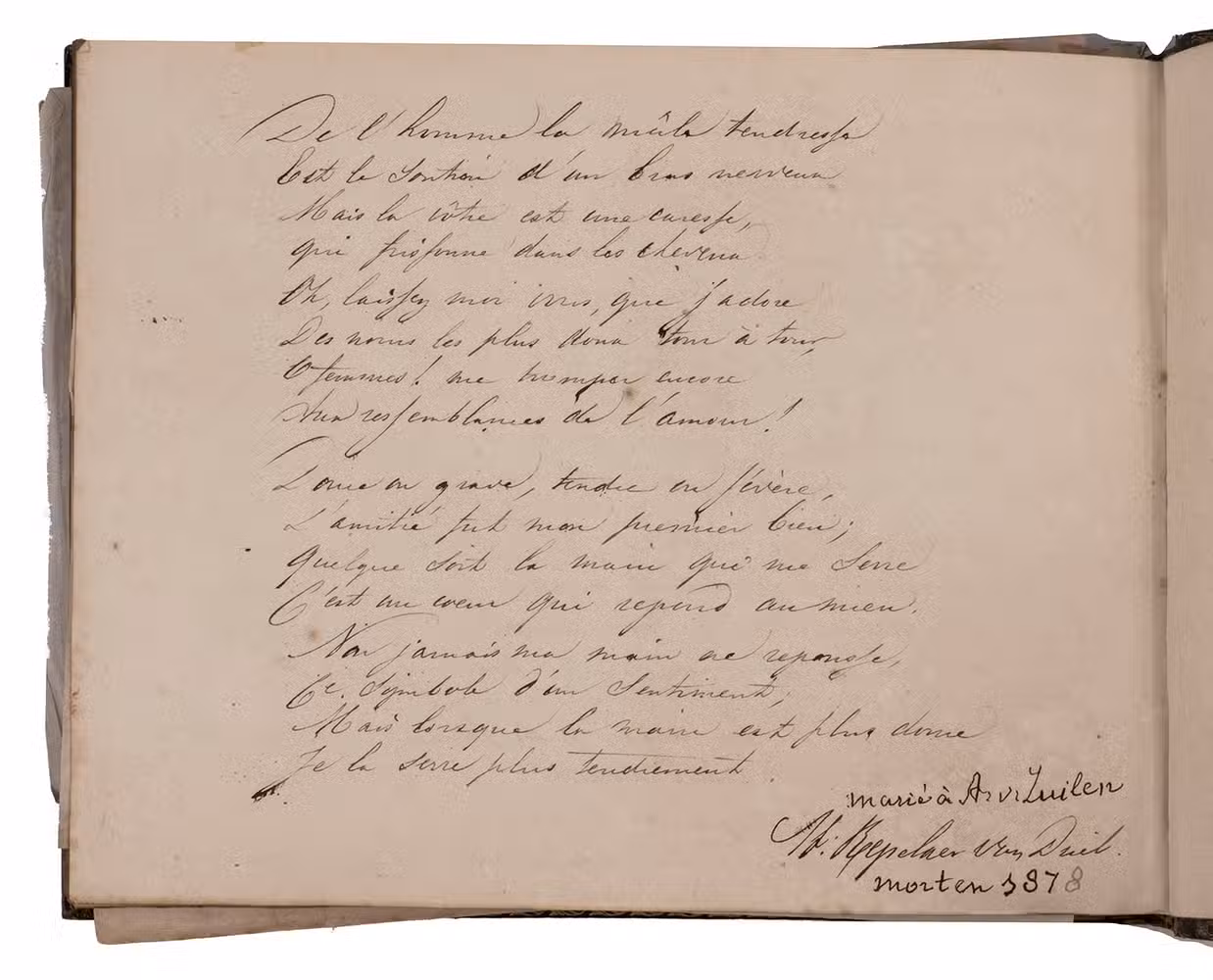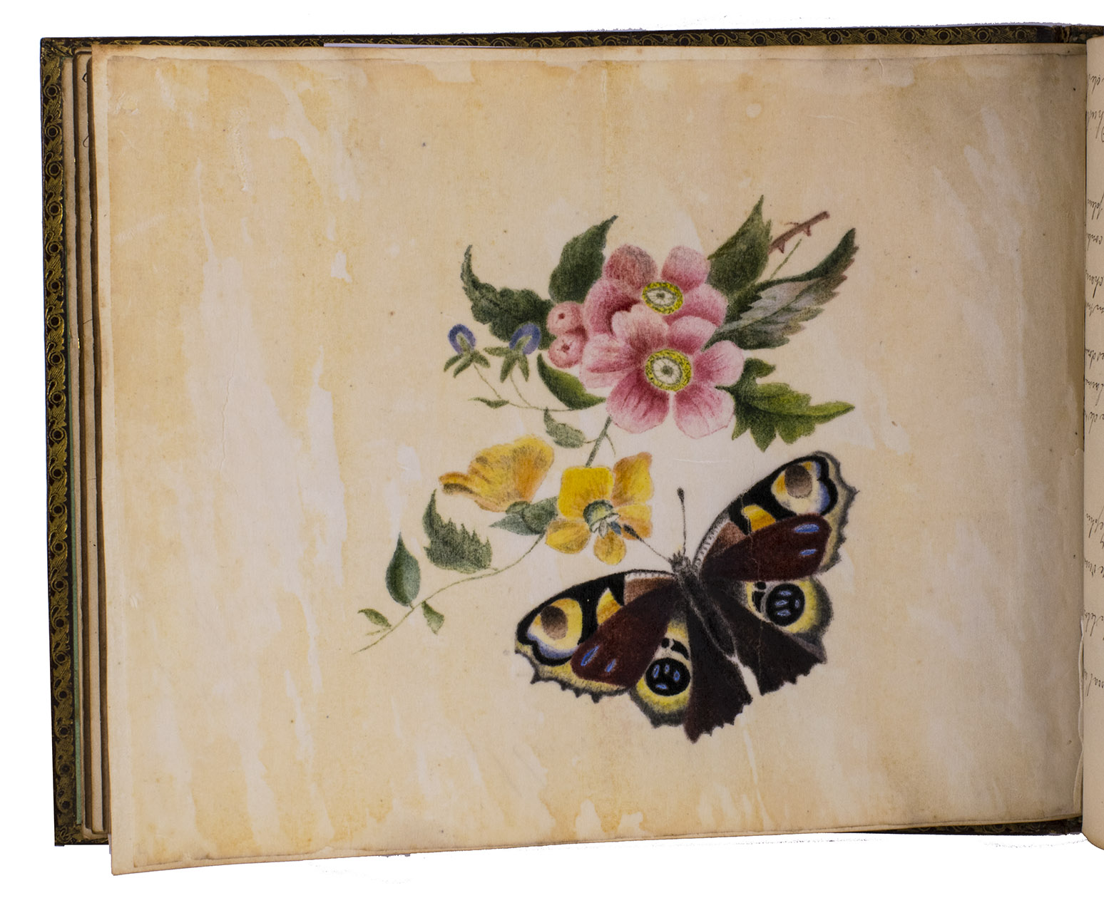 A beautiful example of a richly decorated and illustrated album amicorum, a book of poetry and a scrapbook in one. Alba amicorum were a popular and pleasant pastime at this time, as the first sentence of the album immediately makes clear: "Albums are all the rage, and scrap-books too". Although the album contains many poems by various poets, possibly mostly copied by the owner of the album herself, a girl from a noble family, probably Miss van Boetzelaer (?), the album also contains many contributions by others, particularly women. Examples are F. Testa, Adèle B., J. van Winter, H.v.W., A. van der Goes, H.G. v.d. G., J.C. van Beresteyn, H.J.B., C.B., A. de Schwartzenberg et Hohenlansberg, H. Repelaer van Driel, A.G. v. B. en A. de la B. The contributors probably made the drawings and watercolours to accompany their written entries and the owner mounted them in the album herself. Some of the most remarkable among the richly illustrated contributions are a loosely inserted mountain landscape in watercolour by Johannes van Ravenswaay (1815-1849), a bouquet with flowers in gouache by Wilhelma van Boetzelaer (an English teacher at the royal military academy at Breda) and another bouquet by A.J. Taets d'Amerongen née de Boetzelaer. Another beautiful drawing of three hummingbirds is executed in gouache and decorated with gold by Suzette van B., who wrote several contributions for this album. Also beautiful are a still life with fruits drawn by Mimi Stratenus, two gouaches of butterflies on pith paper by C. Bicker Borski and Christine van Berestyn, and gouache paintings of a rose by Elisa Hanbury and a butterfly by Dorothée Palland Sandberg. Also mounted in this album are engraved portraits of William Shakespeare (1564-1616) and Pierre Corneille (1606-1684), probably reflecting the poetic tastes of the albums owner. This album is not only a beautiful example of the alba amicorum culture among noble women, which flourished for centuries, but also a book for a woman made primarily by women, reflecting an important part of the culture of noble women in the first half of the 19th century.
