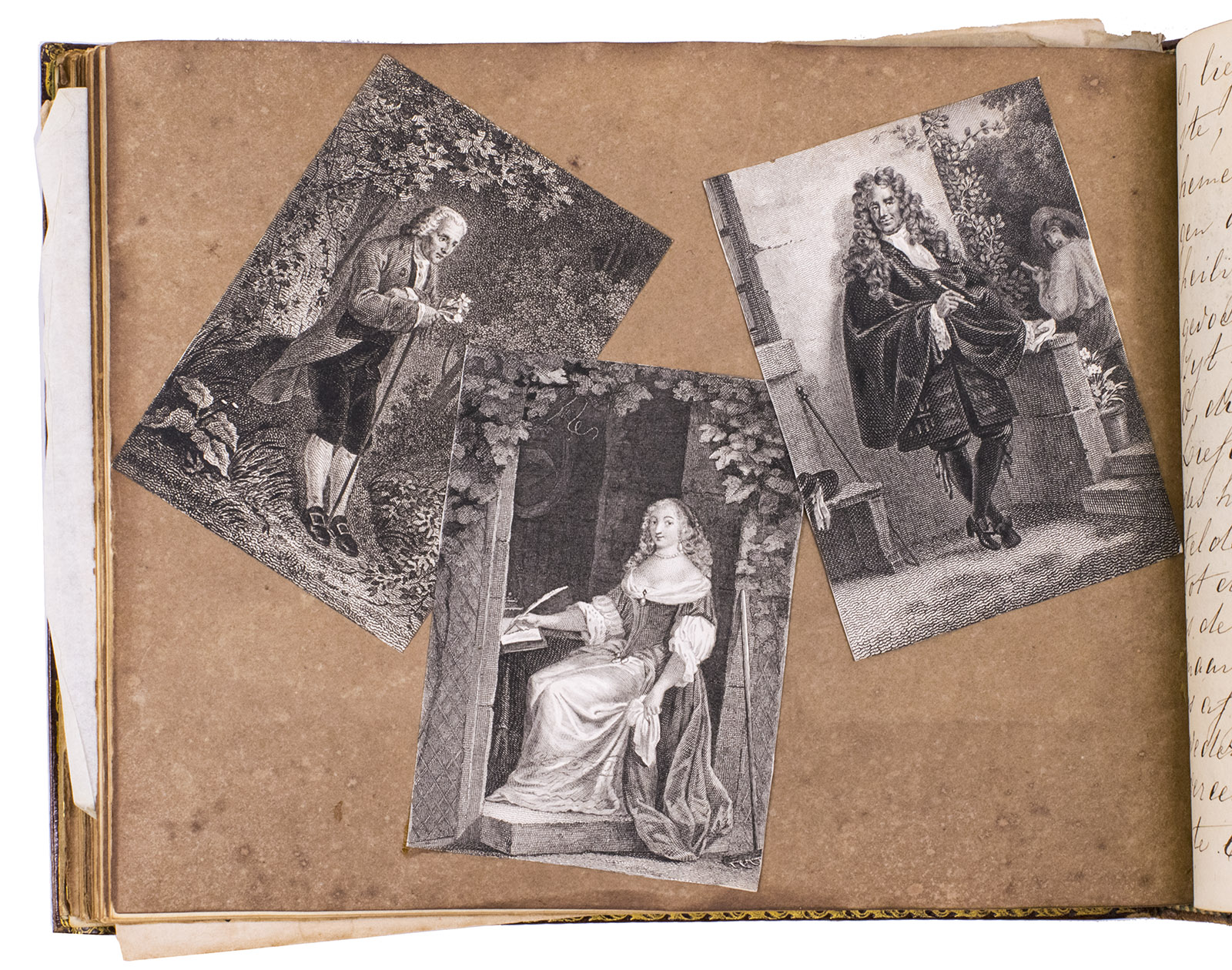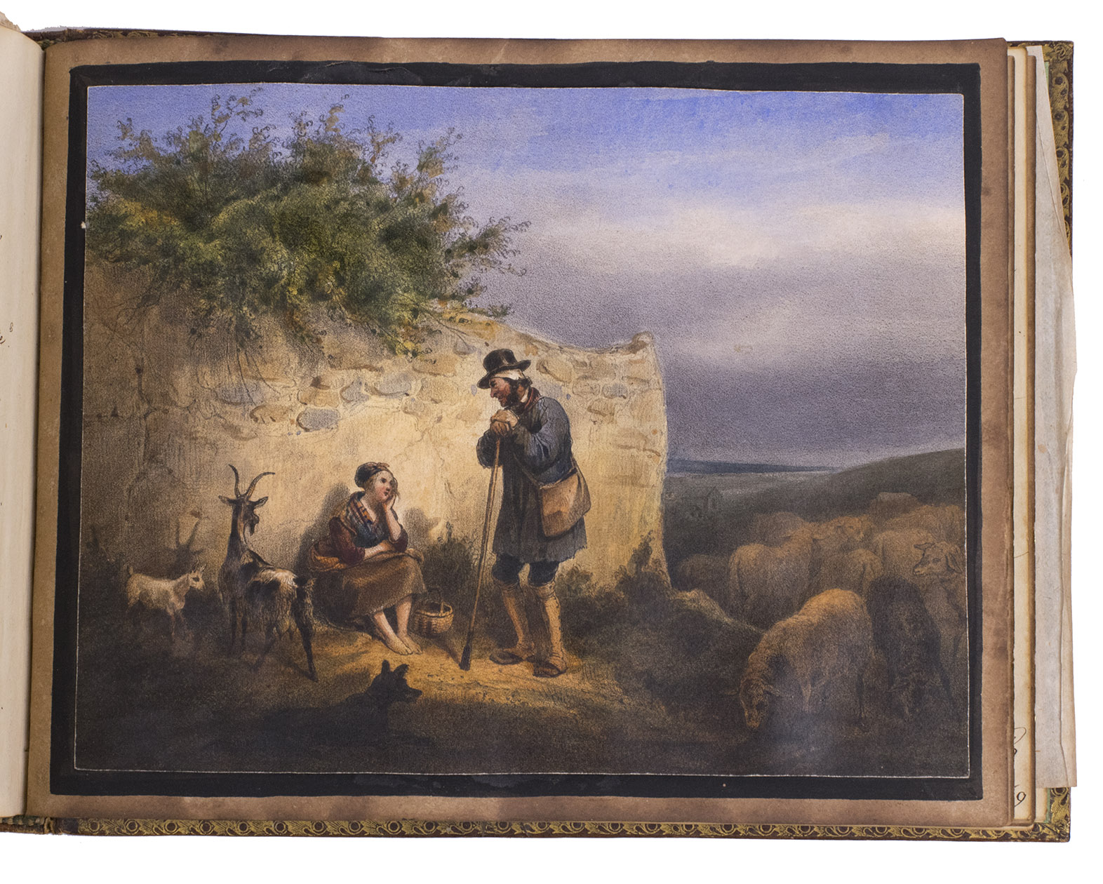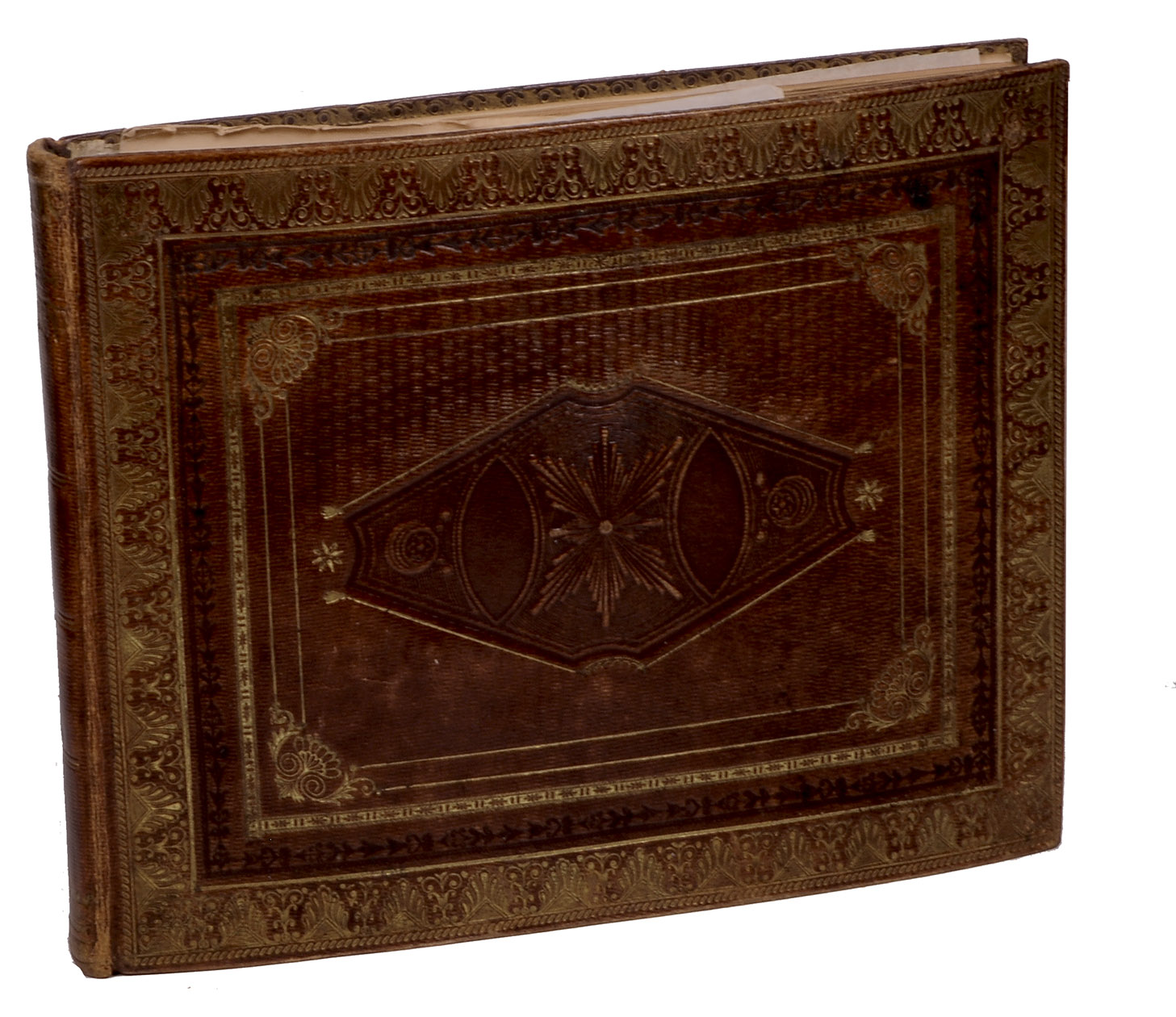 Heerenveen, 1831-1849. Oblong 4to. Manuscript with many contributions in French and English, a single contribution in Dutch and a four-line verse in German, mainly written in the same hand, probably of the owner of this album. With 45 mounted or occasionally loosely inserted drawings, paintings and prints in various formats, some coloured by contemporary hands. Contemporary gold- and blind-tooled brown morocco, each board richly decorated with frames and an oblong lozenge-shaped centrepiece, gilt edges. [96] ll.