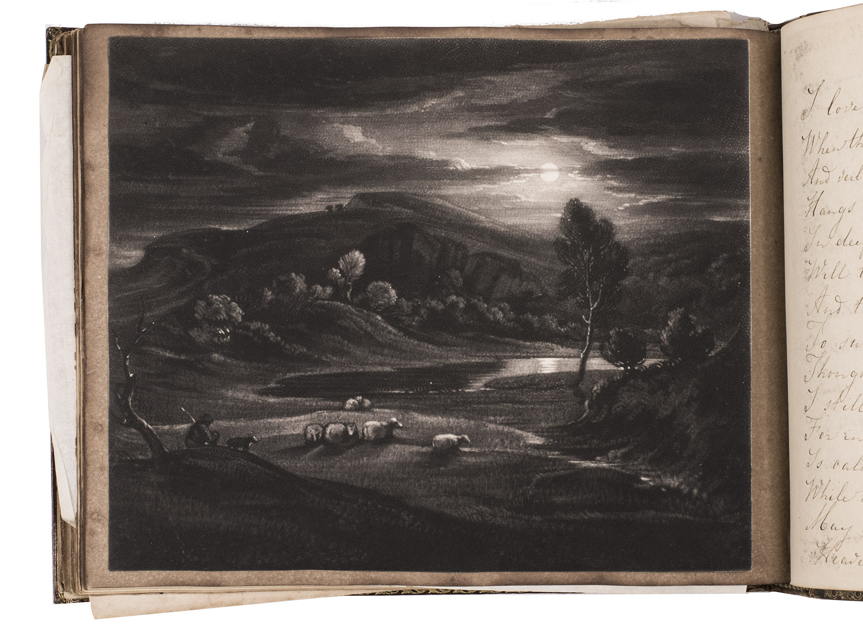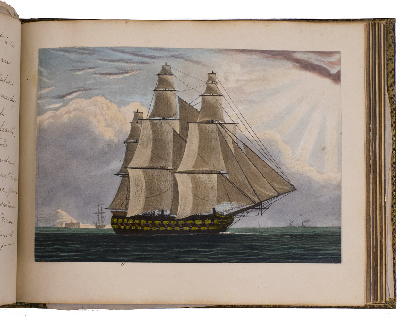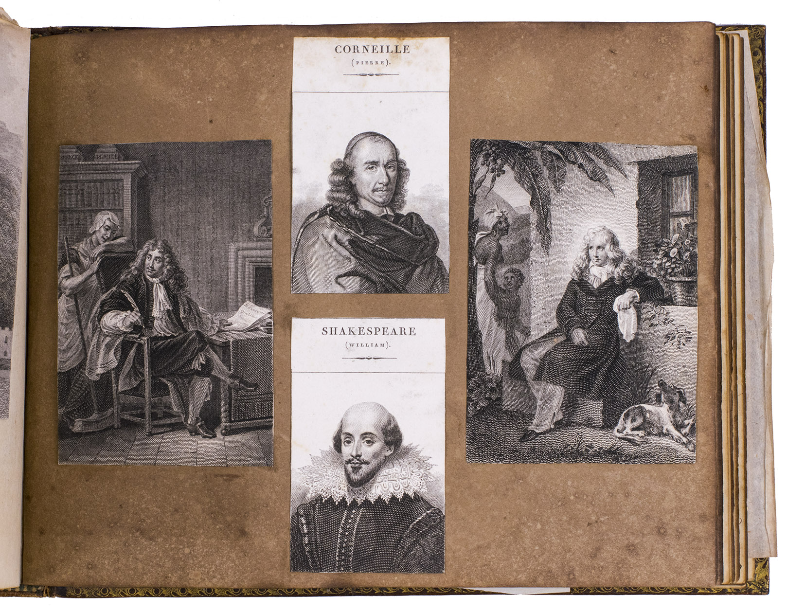 Heerenveen, 1831-1849. Oblong 4to. Manuscript with many contributions in French and English, a single contribution in Dutch and a four-line verse in German, mainly written in the same hand, probably of the owner of this album. With 45 mounted or occasionally loosely inserted drawings, paintings and prints in various formats, some coloured by contemporary hands. Contemporary gold- and blind-tooled brown morocco, each board richly decorated with frames and an oblong lozenge-shaped centrepiece, gilt edges. [96] ll.