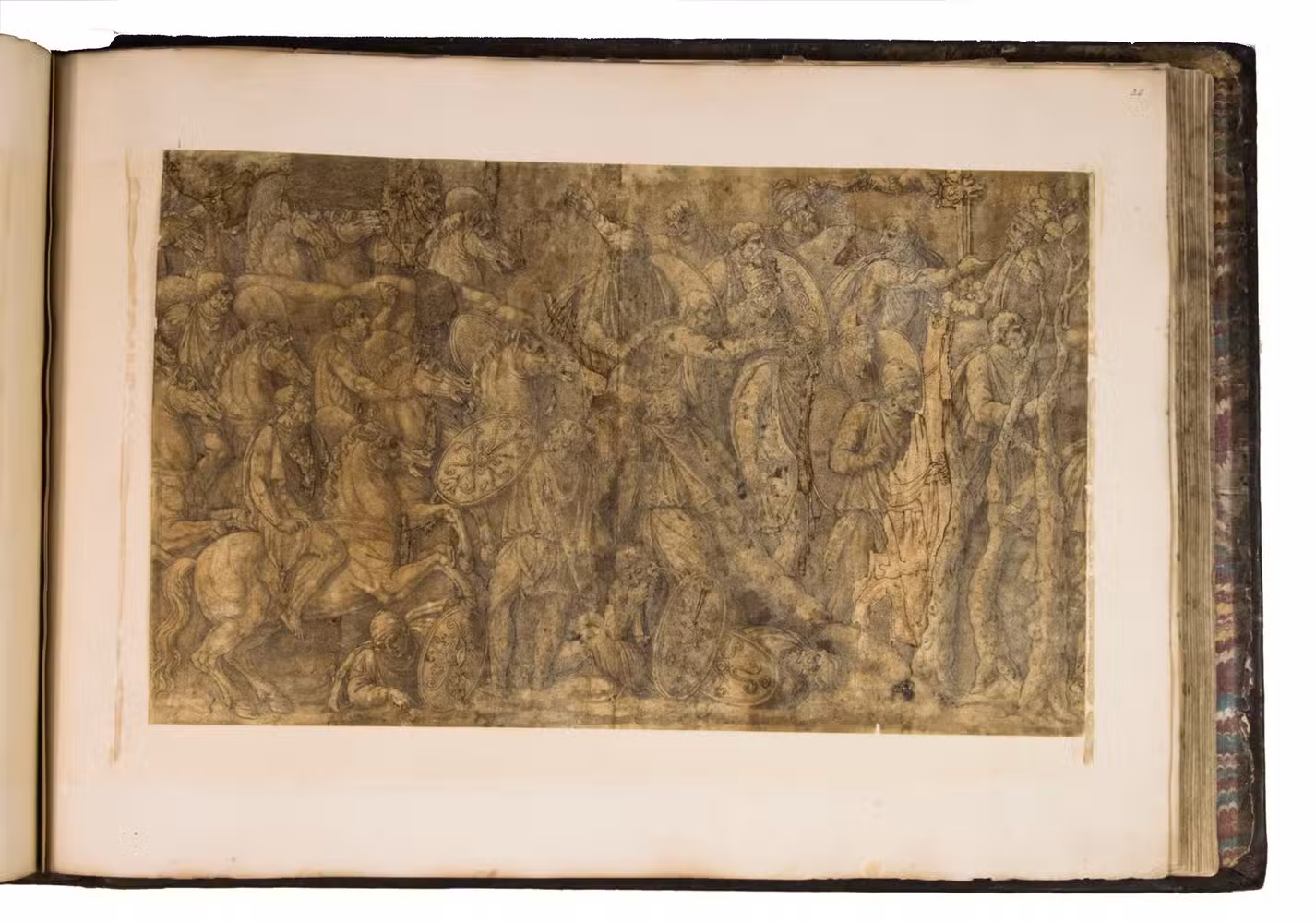 The drawings, especially the later ones, fit together perfectly side by side, suggesting they were made on a very long strip of paper and cut into smaller pieces at a later date. They may even have formed a scroll or rotulus, which was not uncommon for studies of Trajan's Column. The condition of especially the earlier drawings implies that the collection was handled often in the past, and possibly served as a reference for either scholars or artists.