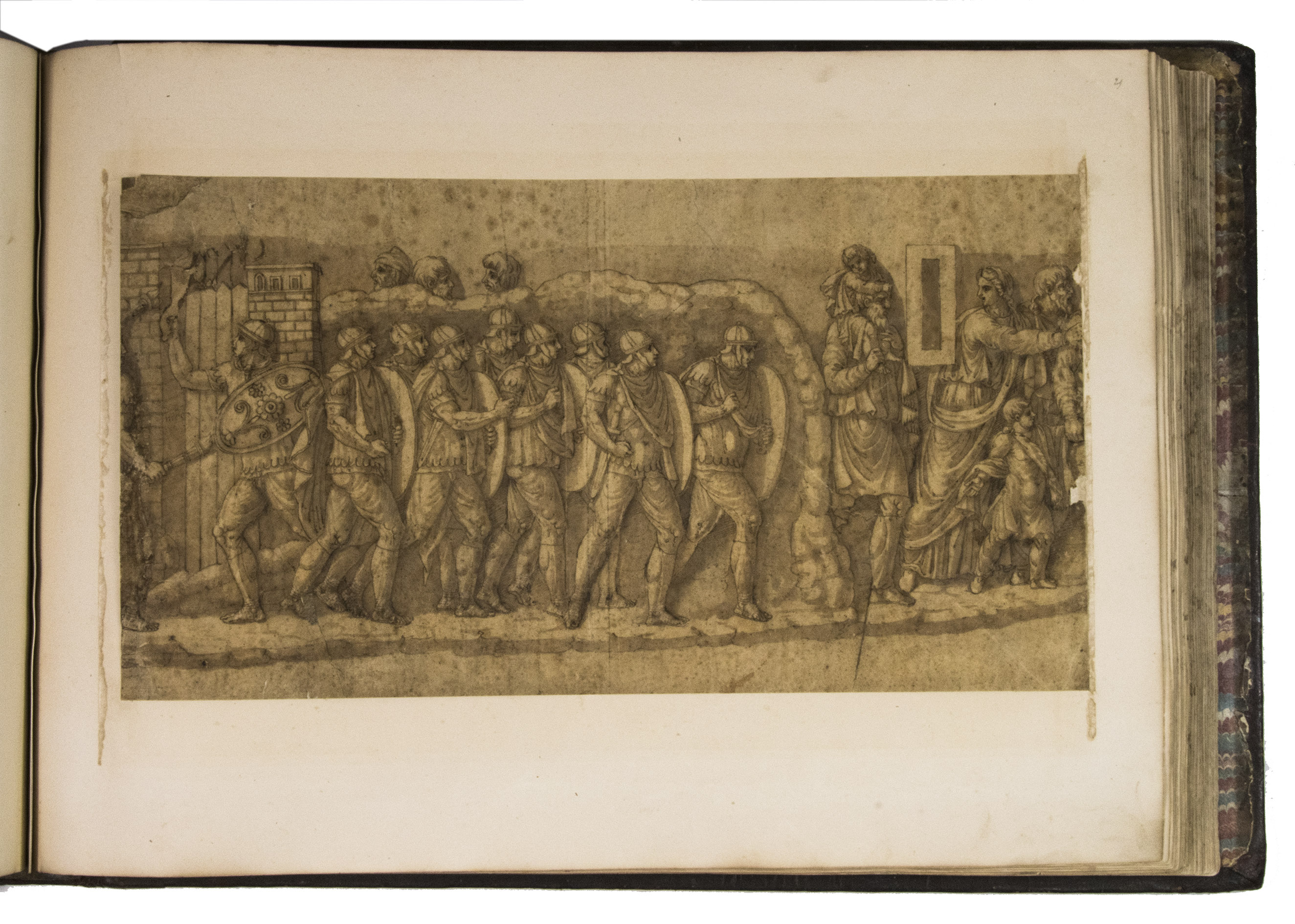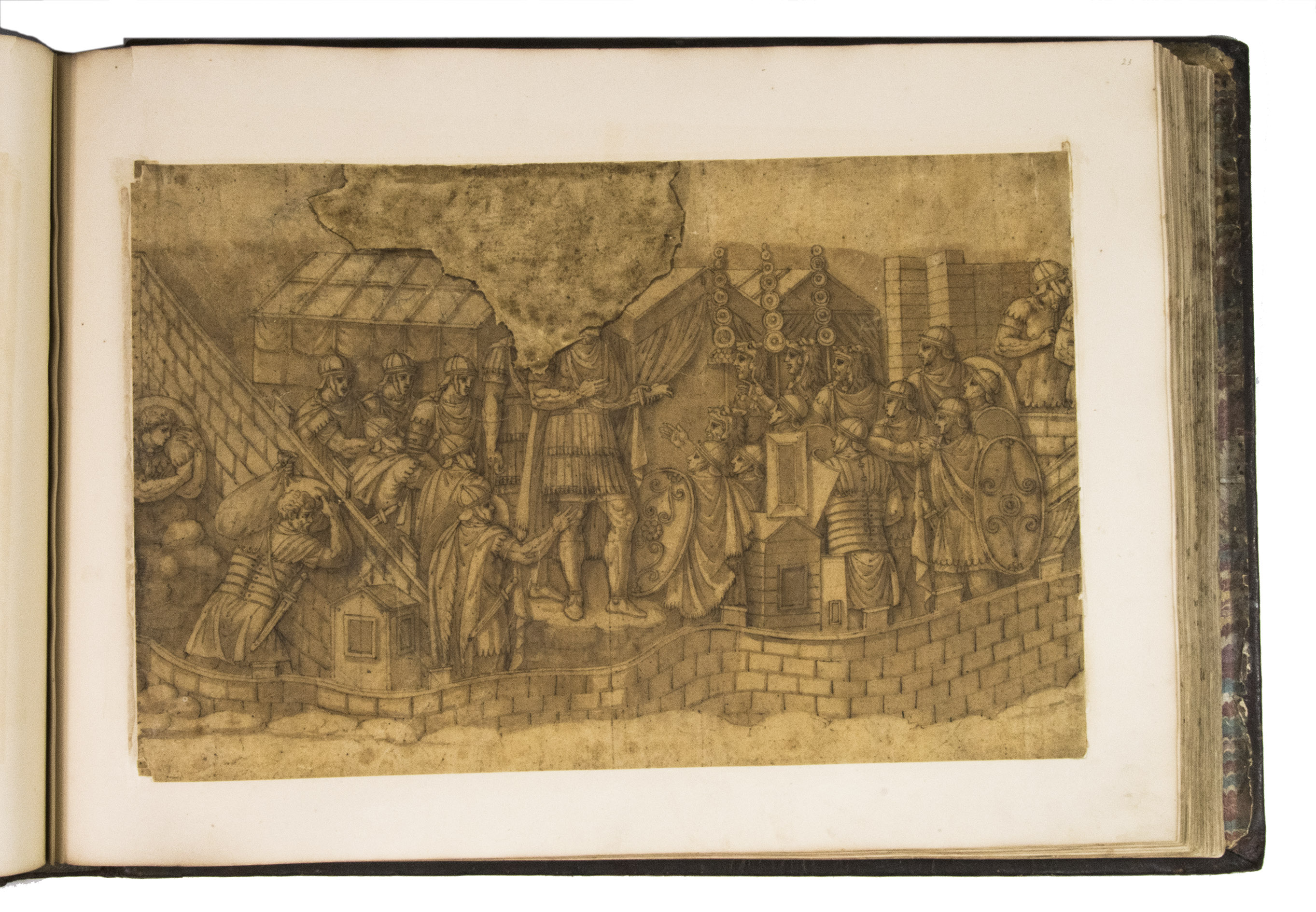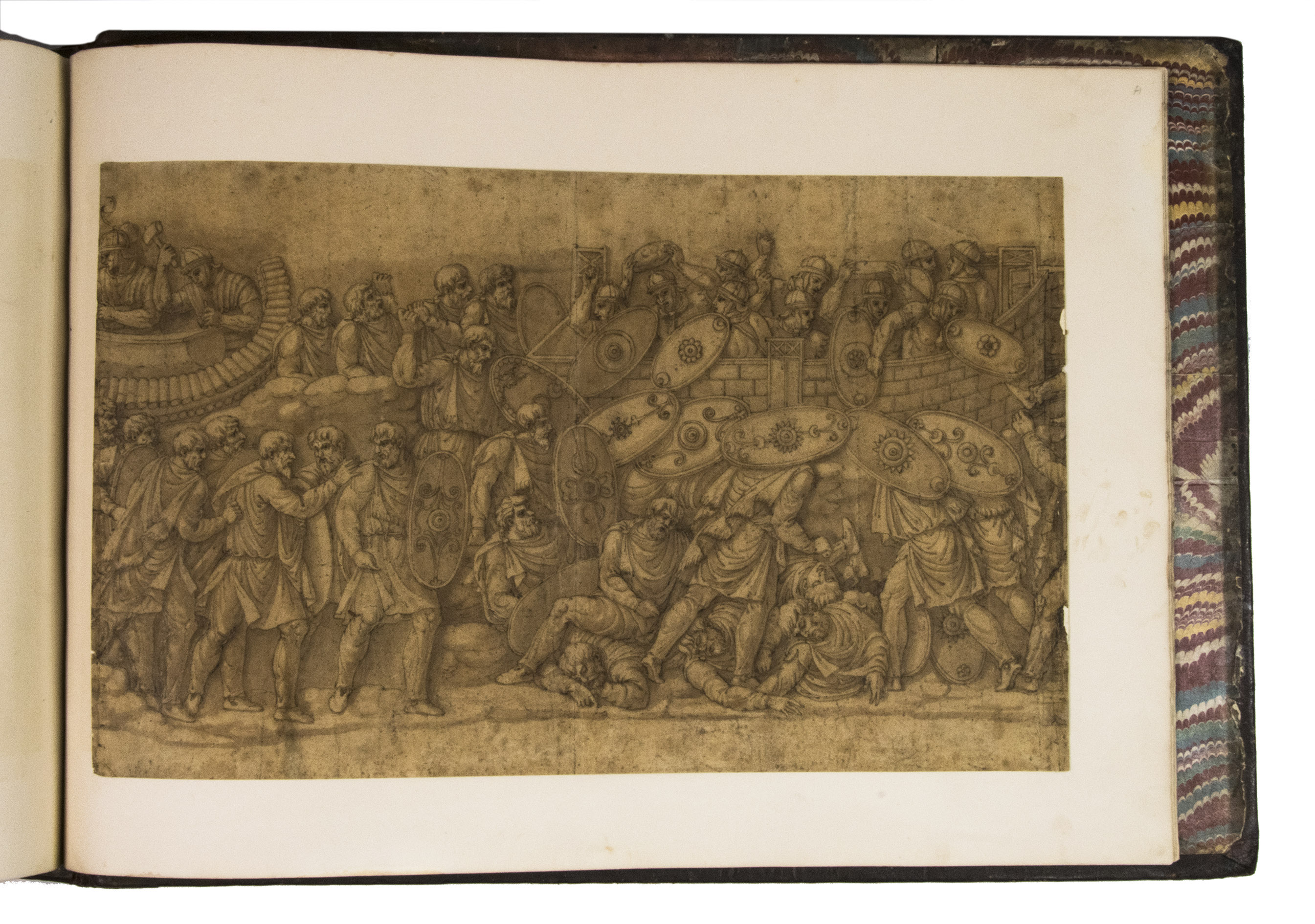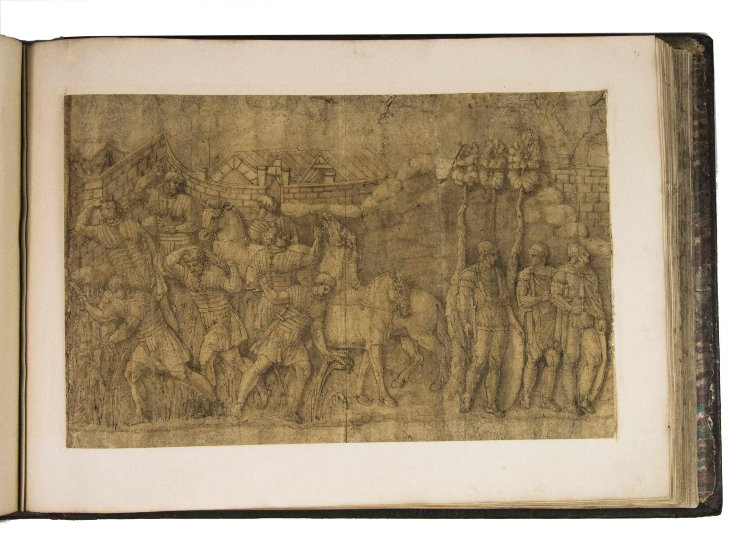 The binding shows clear signs of wear (the boards are scuffed and rubbed, the leather around the edges and joints is shaved), the work has been re-backed with the original back strip laid down, the album contains 19th-century leaves on which the illustrations are mounted. The marbled endpapers are slightly faded and browned along the edges, the illustrations are somewhat browned but still clearly visible, they are all creased/ folded in the middle, the earlier drawings with losses and extensive repairs, some laid onto support, heavy toning and surface dirt throughout, some slight offsetting on the blank versos of the album leaves, lacking the illustration which was mounted on leaf [73] (?). Cf. Heenes, Volker, "On sixteenth-century copies of the reliefs from the Column of Trajan - Two new drawings from an unknown rotulus", in: RIHA Journal (0094), July 2014.