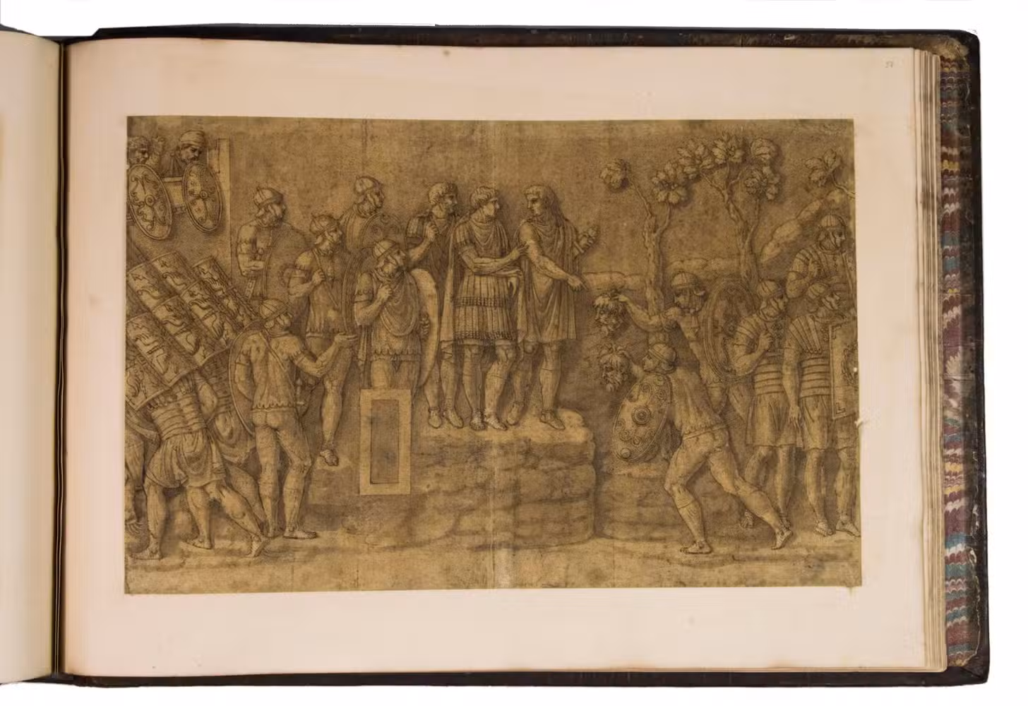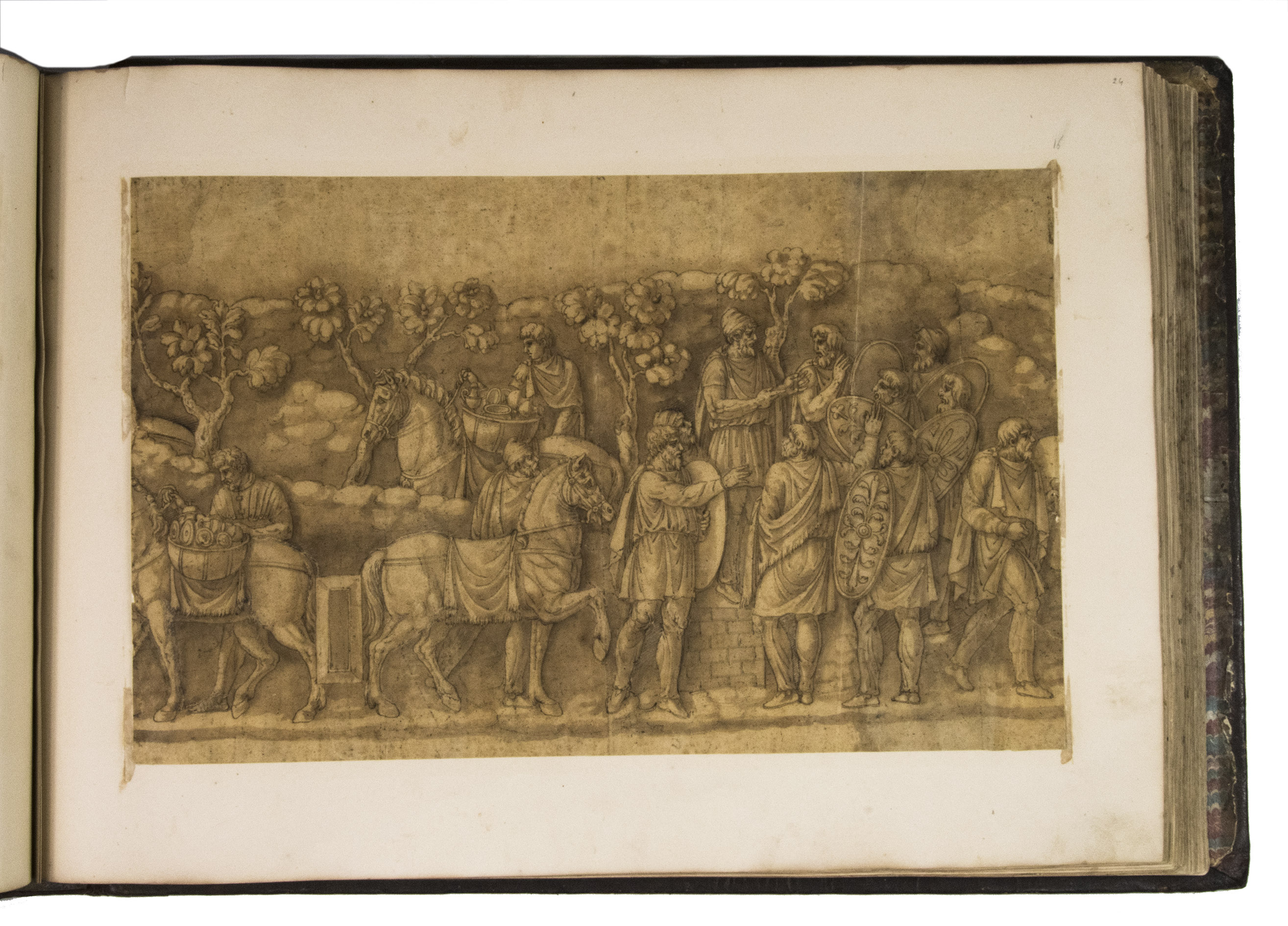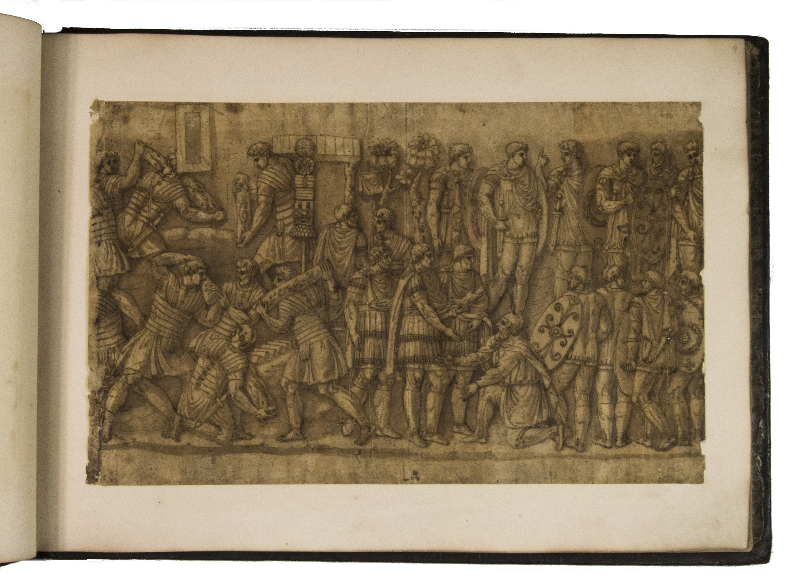 The binding shows clear signs of wear (the boards are scuffed and rubbed, the leather around the edges and joints is shaved), the work has been re-backed with the original back strip laid down, the album contains 19th-century leaves on which the illustrations are mounted. The marbled endpapers are slightly faded and browned along the edges, the illustrations are somewhat browned but still clearly visible, they are all creased/ folded in the middle, the earlier drawings with losses and extensive repairs, some laid onto support, heavy toning and surface dirt throughout, some slight offsetting on the blank versos of the album leaves, lacking the illustration which was mounted on leaf [73] (?). Cf. Heenes, Volker, "On sixteenth-century copies of the reliefs from the Column of Trajan - Two new drawings from an unknown rotulus", in: RIHA Journal (0094), July 2014.