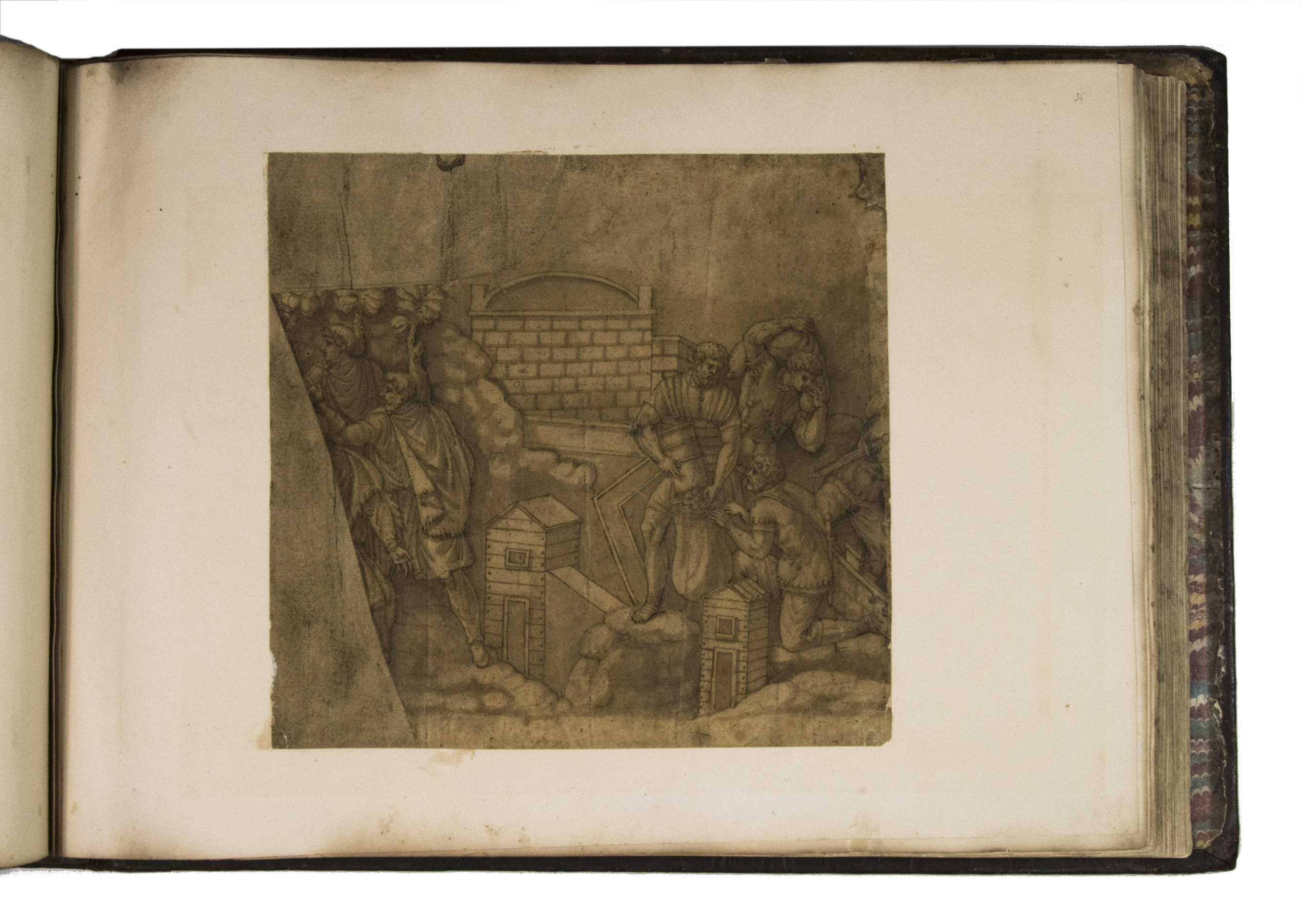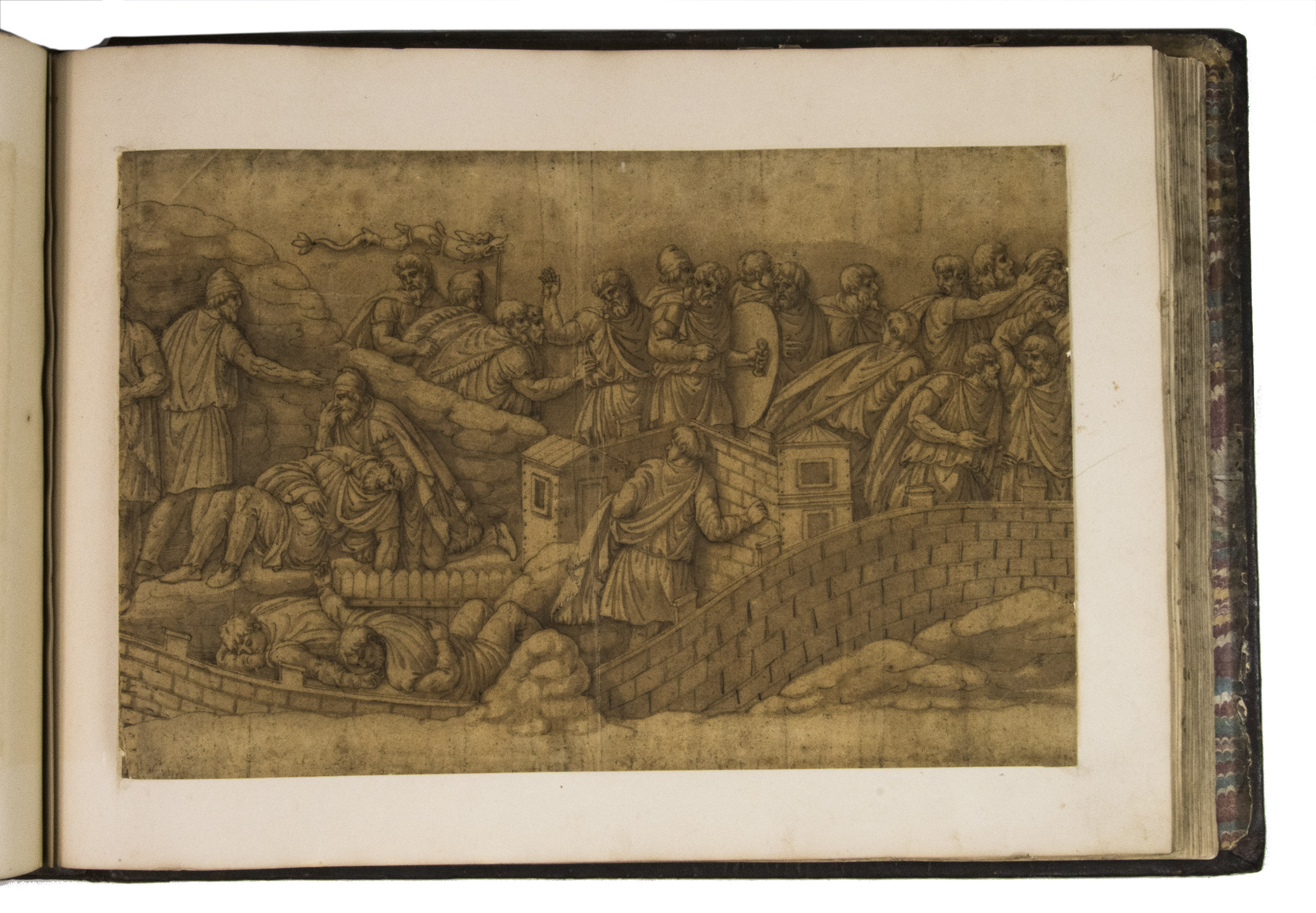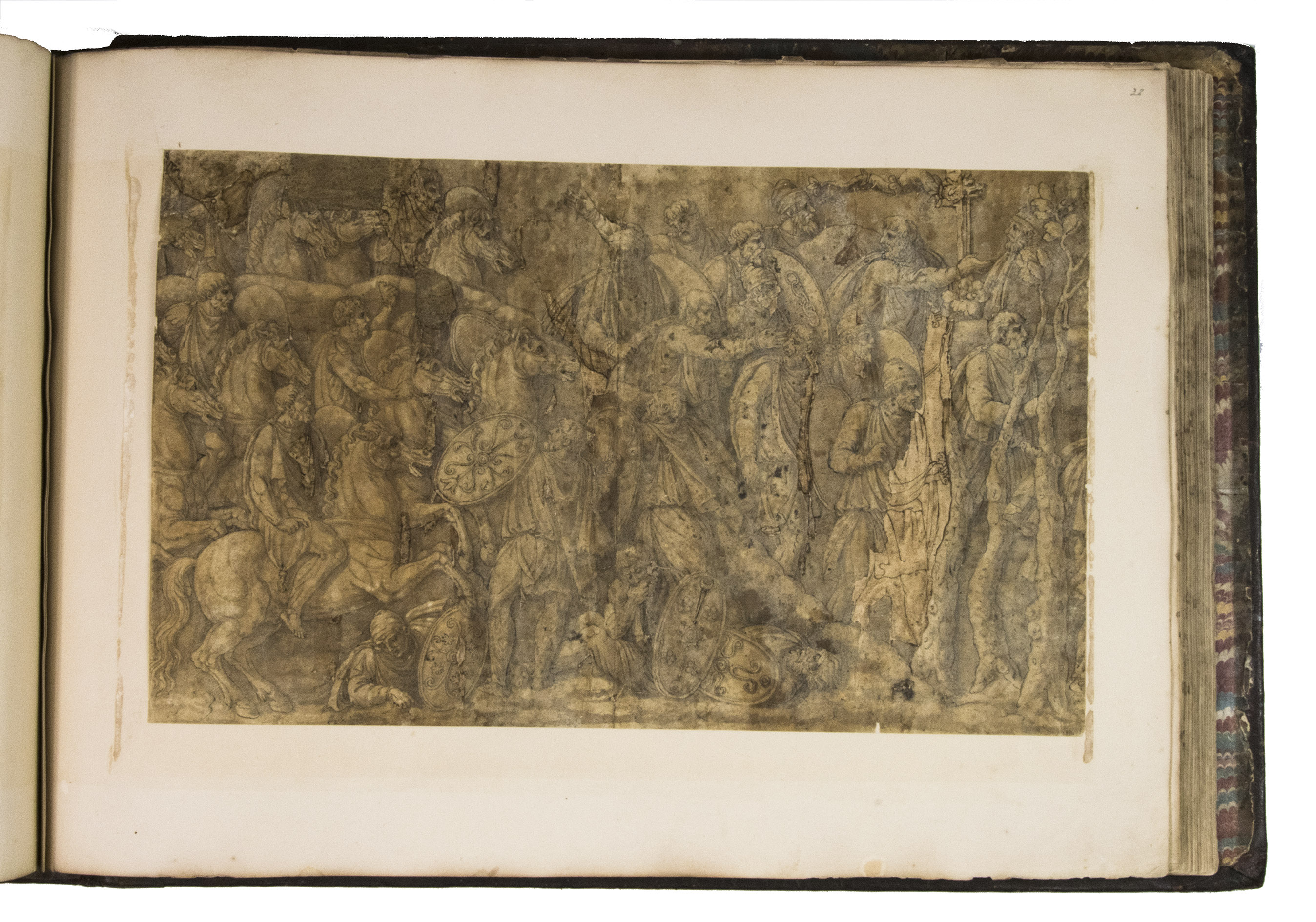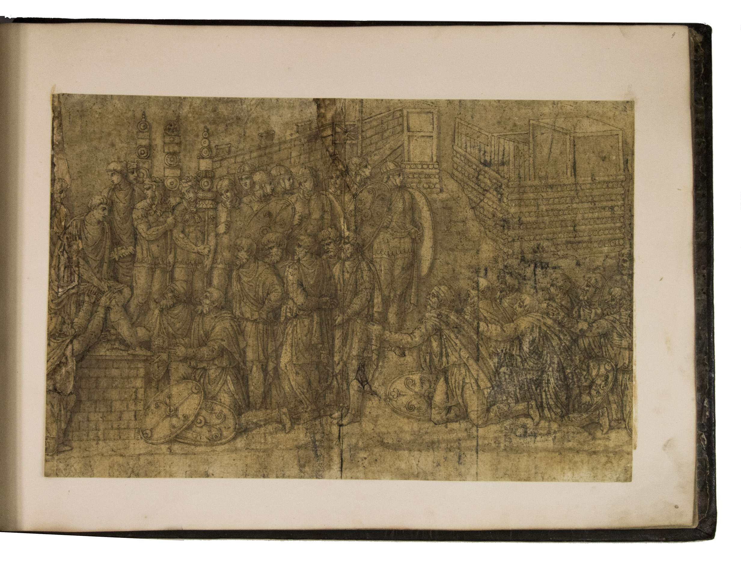 The binding shows clear signs of wear (the boards are scuffed and rubbed, the leather around the edges and joints is shaved), the work has been re-backed with the original back strip laid down, the album contains 19th-century leaves on which the illustrations are mounted. The marbled endpapers are slightly faded and browned along the edges, the illustrations are somewhat browned but still clearly visible, they are all creased/ folded in the middle, the earlier drawings with losses and extensive repairs, some laid onto support, heavy toning and surface dirt throughout, some slight offsetting on the blank versos of the album leaves, lacking the illustration which was mounted on leaf [73] (?). Cf. Heenes, Volker, "On sixteenth-century copies of the reliefs from the Column of Trajan - Two new drawings from an unknown rotulus", in: RIHA Journal (0094), July 2014.