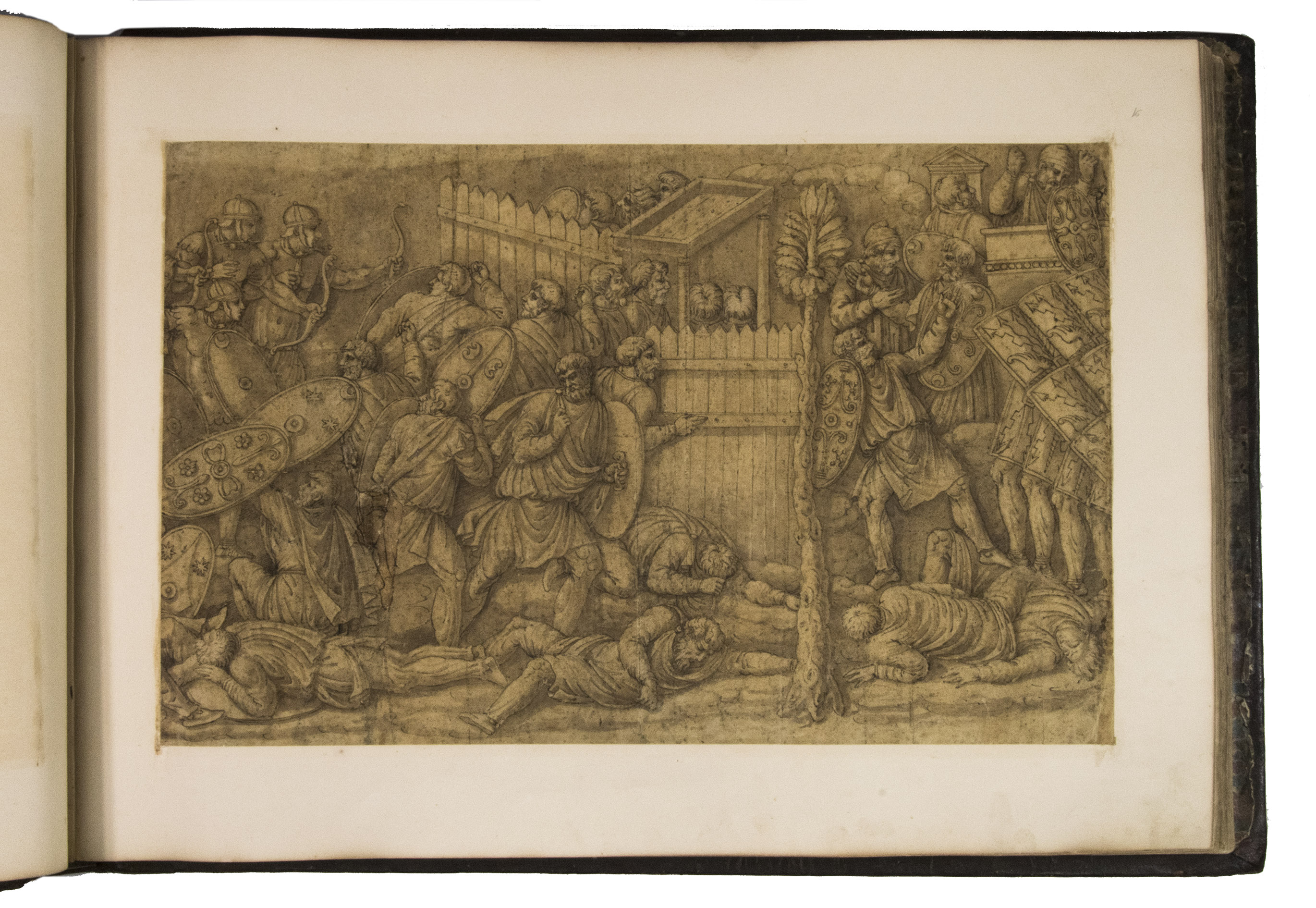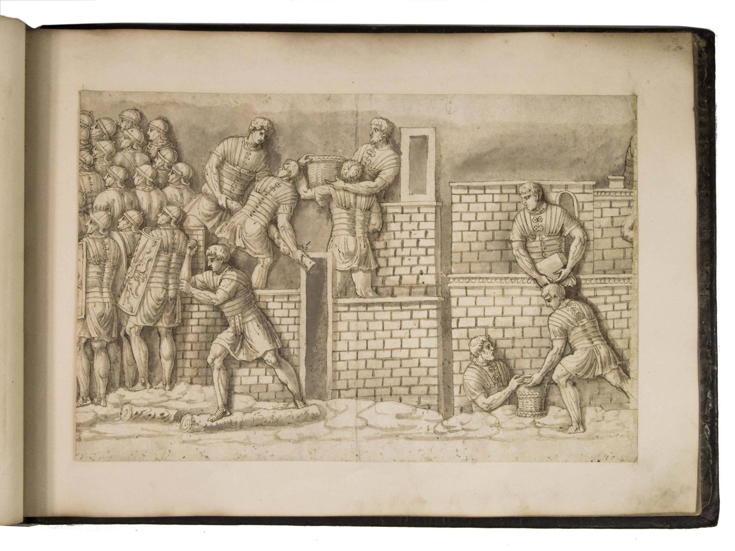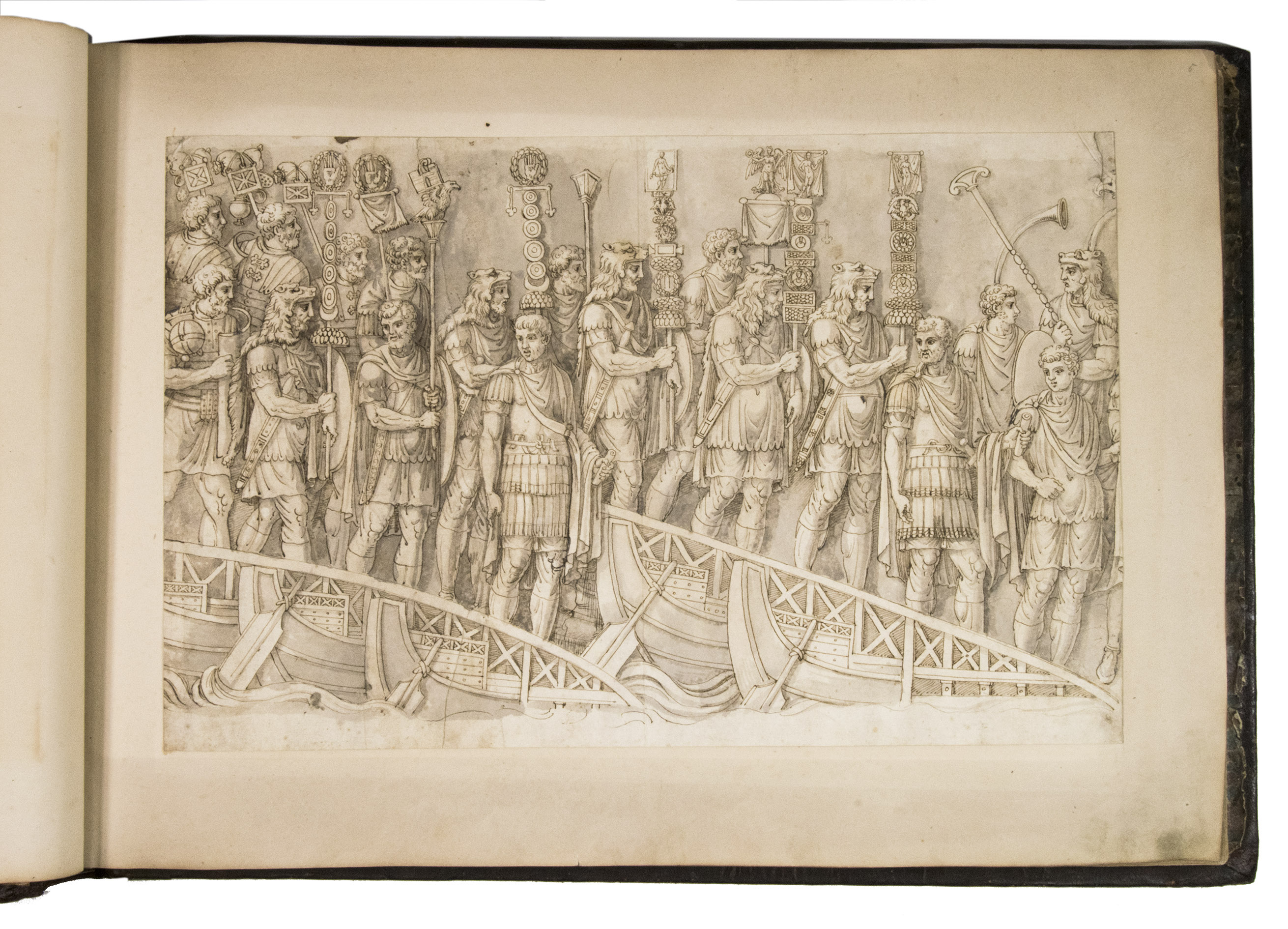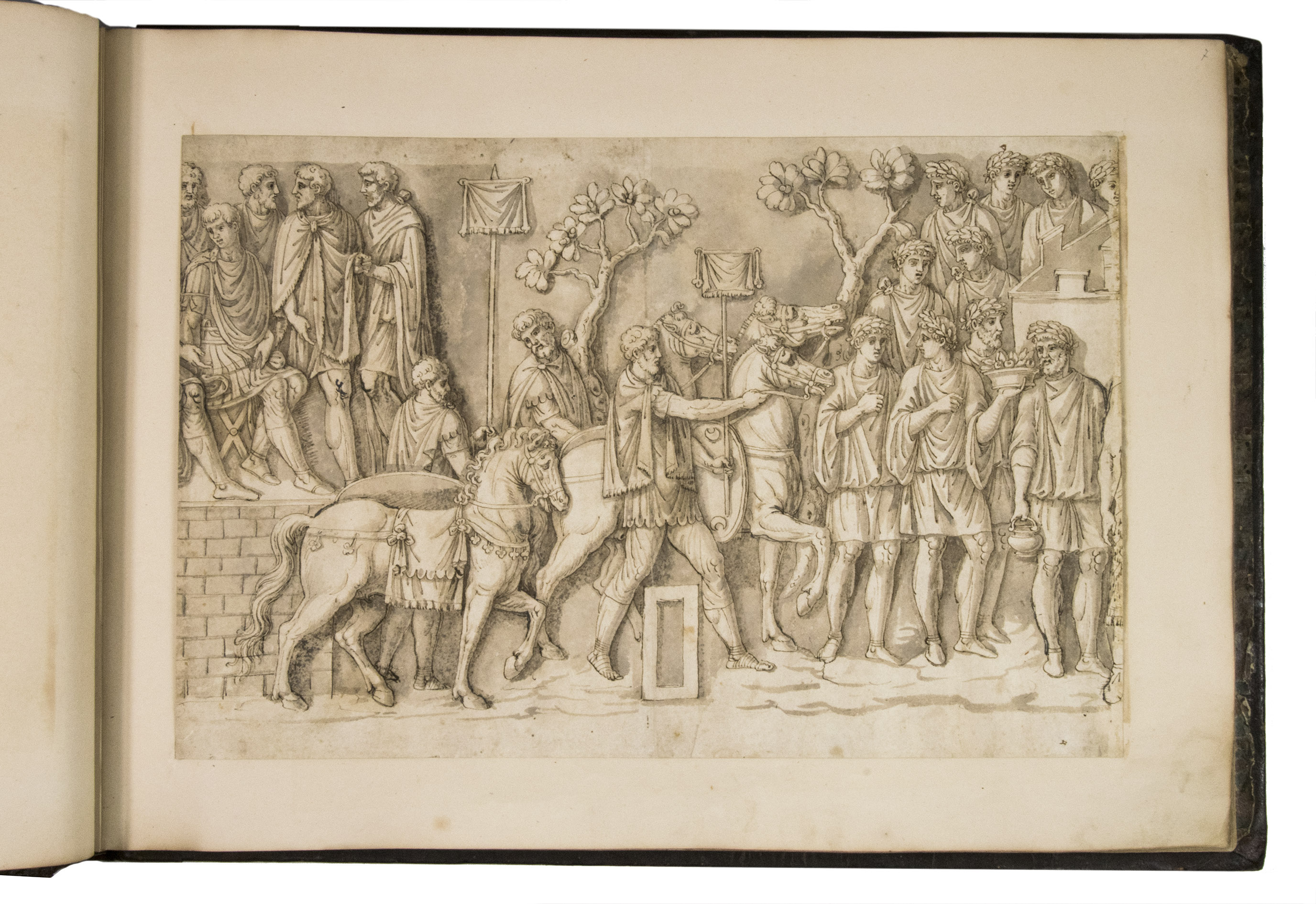 Remarkable collection of 72 drawings of the scenes on Trajan's Column in Rome. They were made by at least two different Italian artists from slightly different periods, but in a cohesive style. The drawings have been mounted into an album bearing the coat of arms of King Philip V of Spain (1683-1746). Trajan's Column proved to be endlessly inspiring in the time period the present drawings were made, as similar collections of studies are known from artists such as Amico Aspertini (1474-1552), Giovanni Battista Cipriani (1727-1785), and Nicolas Poussin (1594-1665).