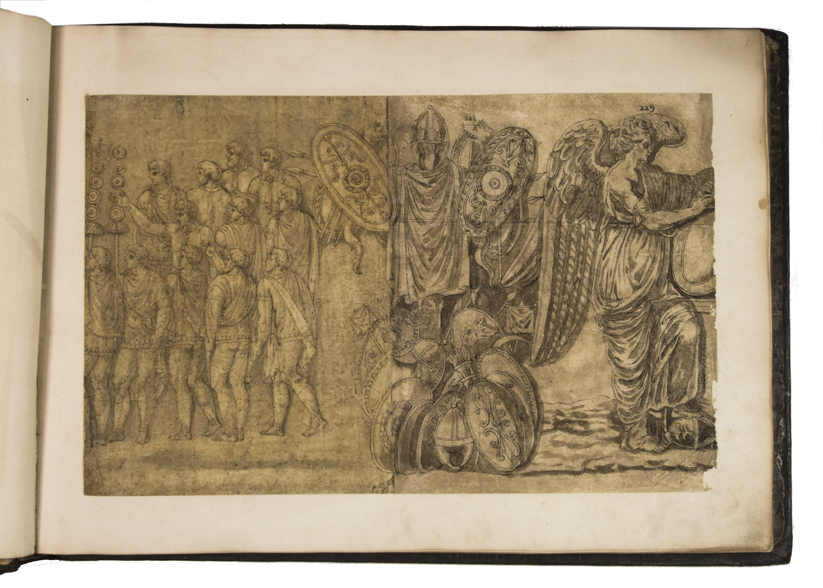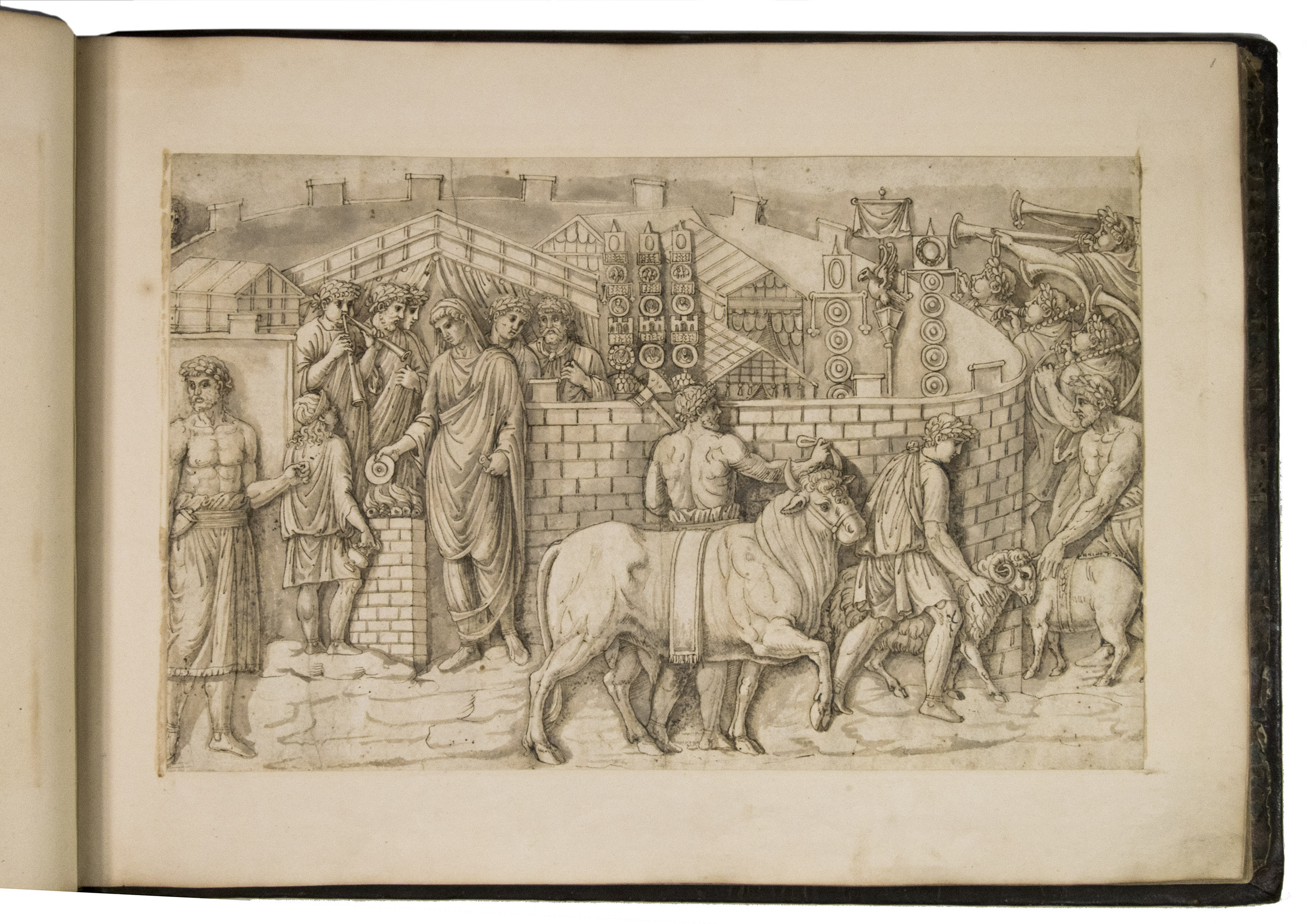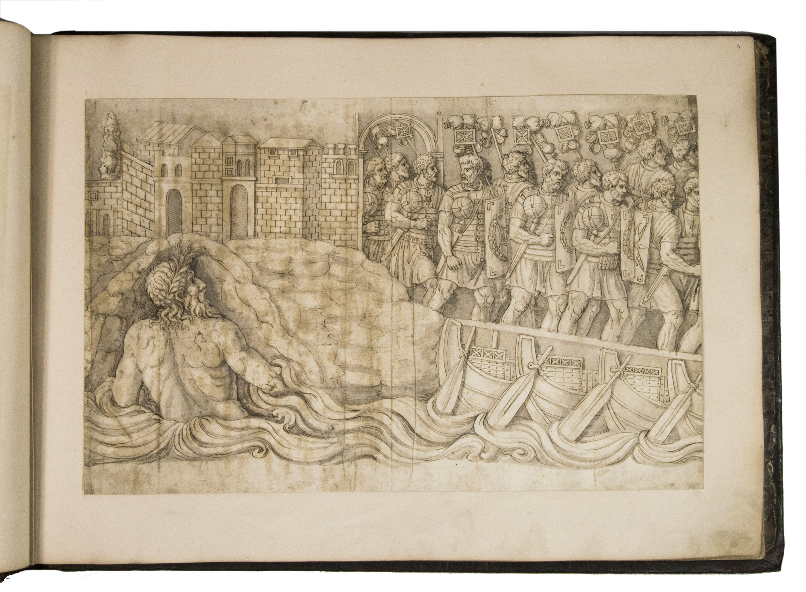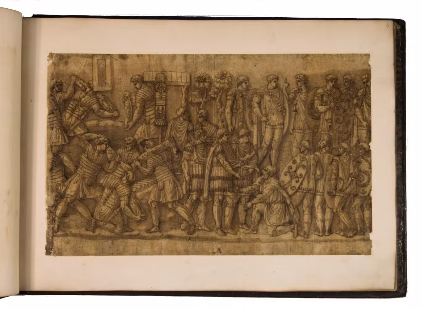 Remarkable collection of 72 drawings of the scenes on Trajan's Column in Rome. They were made by at least two different Italian artists from slightly different periods, but in a cohesive style. The drawings have been mounted into an album bearing the coat of arms of King Philip V of Spain (1683-1746). Trajan's Column proved to be endlessly inspiring in the time period the present drawings were made, as similar collections of studies are known from artists such as Amico Aspertini (1474-1552), Giovanni Battista Cipriani (1727-1785), and Nicolas Poussin (1594-1665).