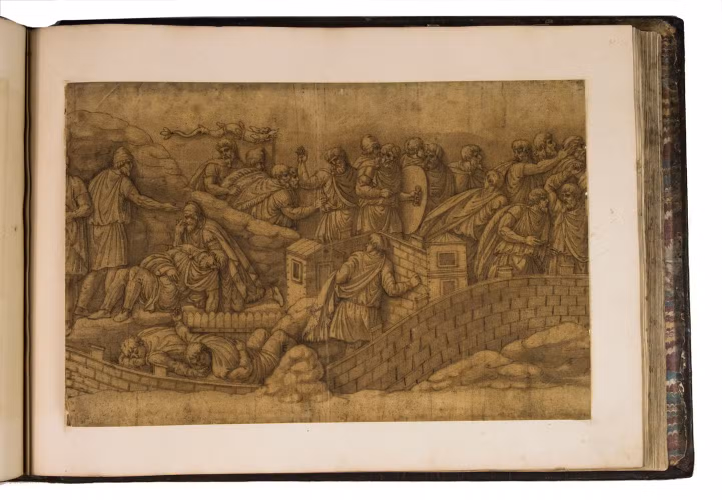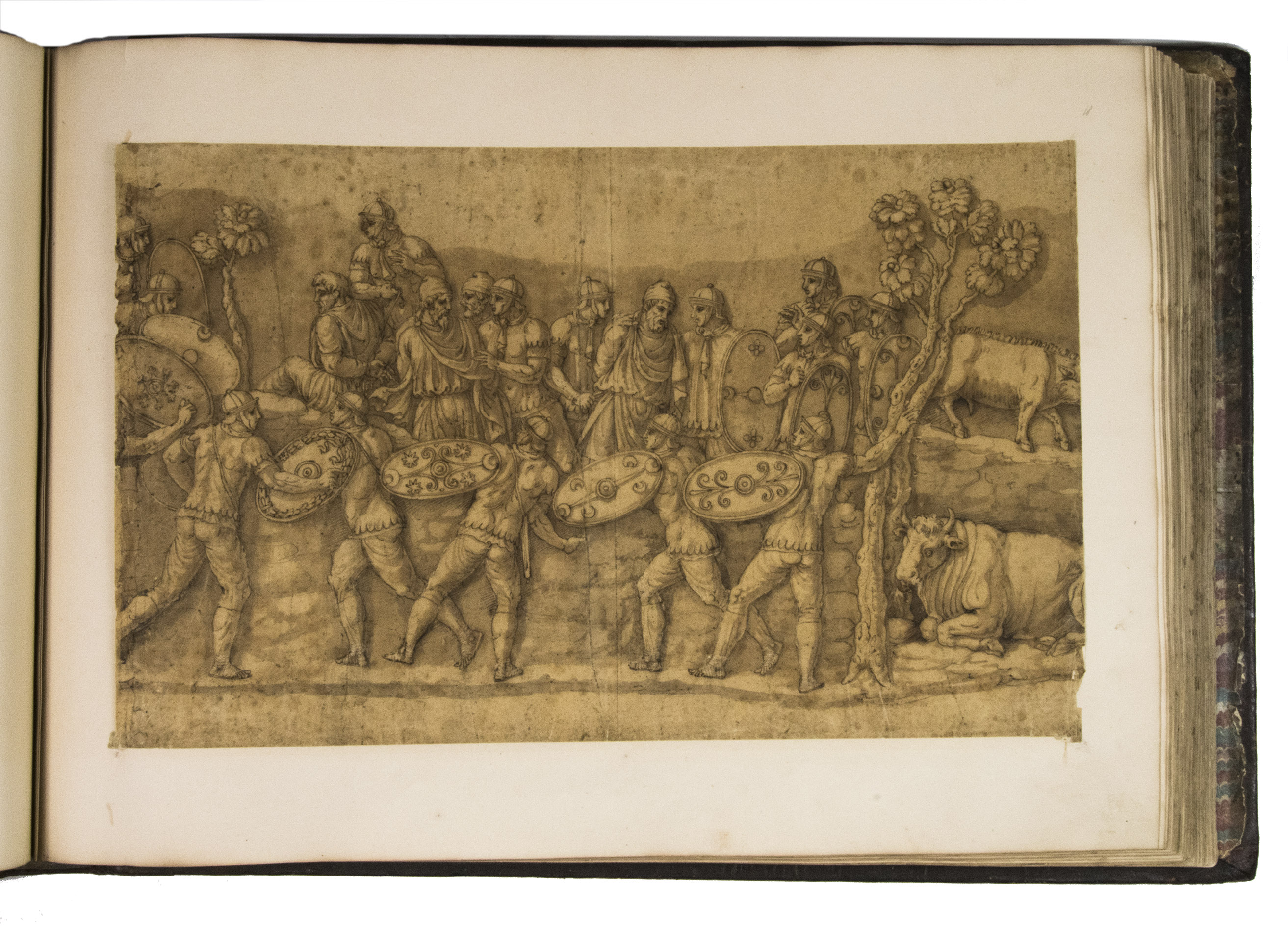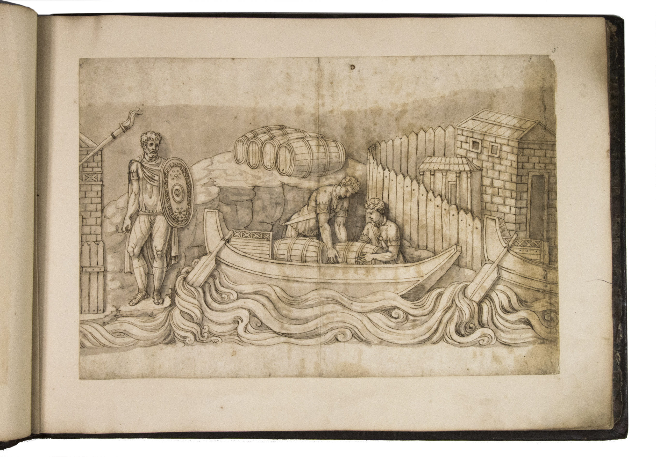 The drawings show a selection of scenes from both the first and second Dacian Wars, as depicted on the friezes of the Trajan Column. They are made on different types of paper, which are easily distinguished by their colour. The later drawings on the light cream coloured paper depict the very first scenes, found at the base of the column. They have been mounted in the album in the right order. The earlier drawings on the darker paper depict the later scenes, including the battles. They appear to have been mounted at least partly in reverse order, as the first few drawings in the album show the victory scenes at the end of the first Dacian War. The cohesive style of the different sets of drawings strongly suggests that the artists used the same model. This was most likely Alfonso Chacón's Historia utriusque belli Dacici a Traiano Caesare gesti (1576), with engravings by Francesco Villamena (ca. 1565-1624), or one of the 17th-century editions with engravings by Giovanni Pietro Bellori (1613-1696) and Pietro Santi Bartoli (1635-1700).