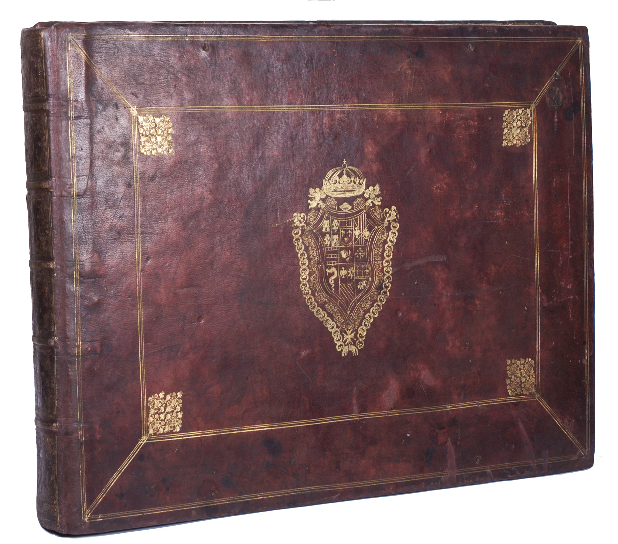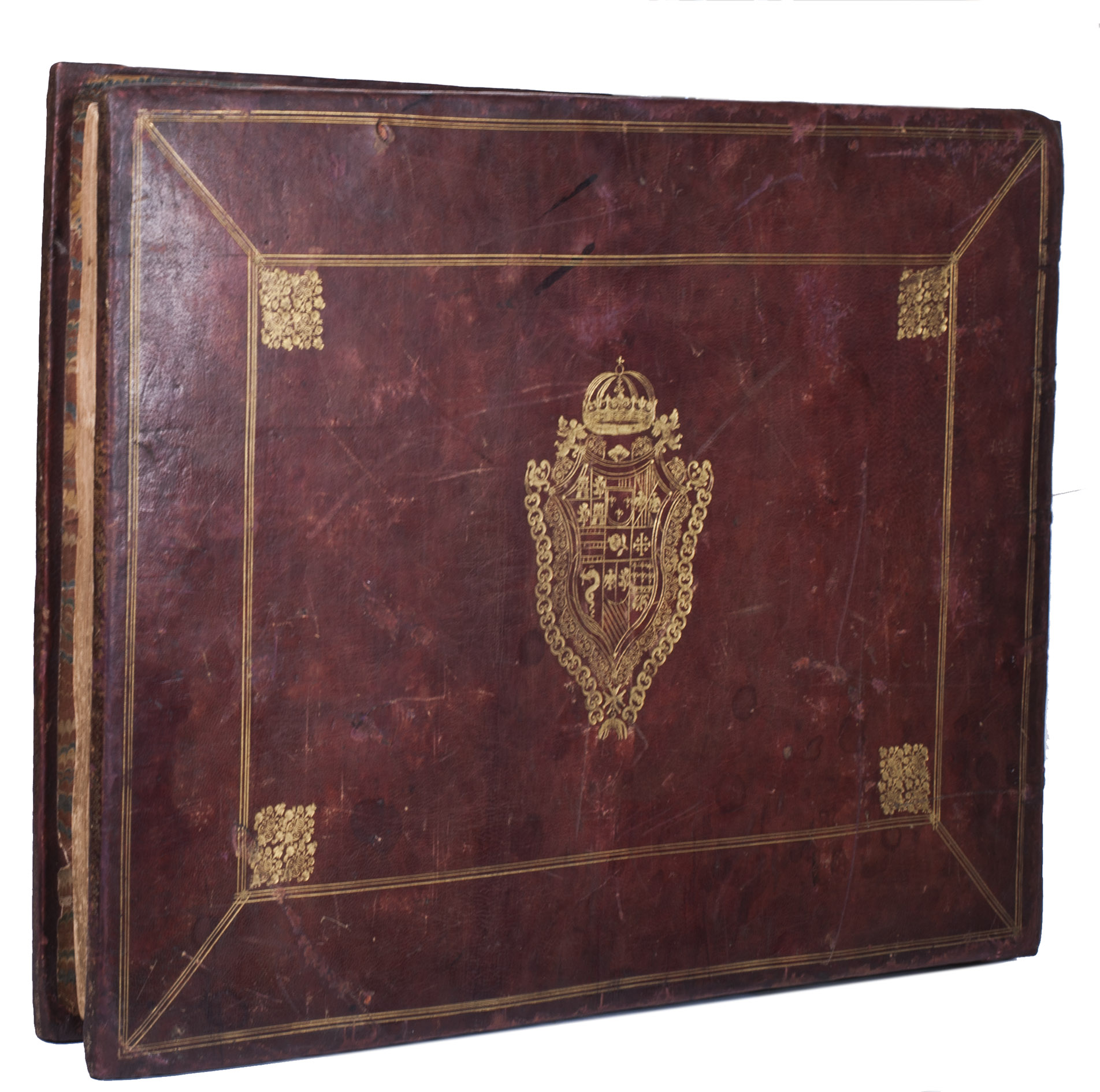 [Italy, late 16th- to 18th-century]. Oblong folio (ca. 54 x 39 cm). With 72 drawings on paper, in pen, ink, and ink wash. Probably early 18th-century gold-tooled red morocco with the elaborate coat of arms of King Philip V of Spain as a centre piece on both boards, within a double frame with floral corner pieces in the inside corners of the inner frame; gold-tooled board edges, marbled endpapers. [74] ll.