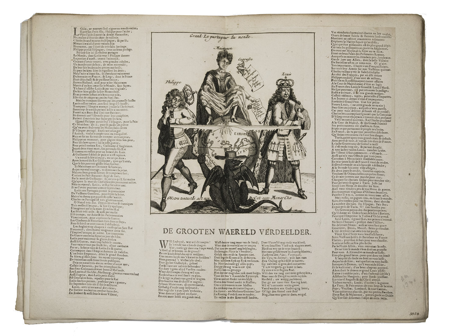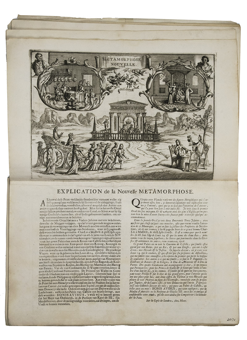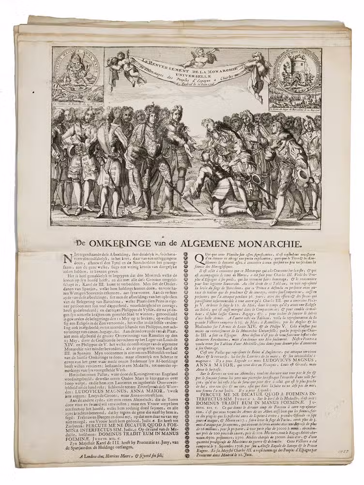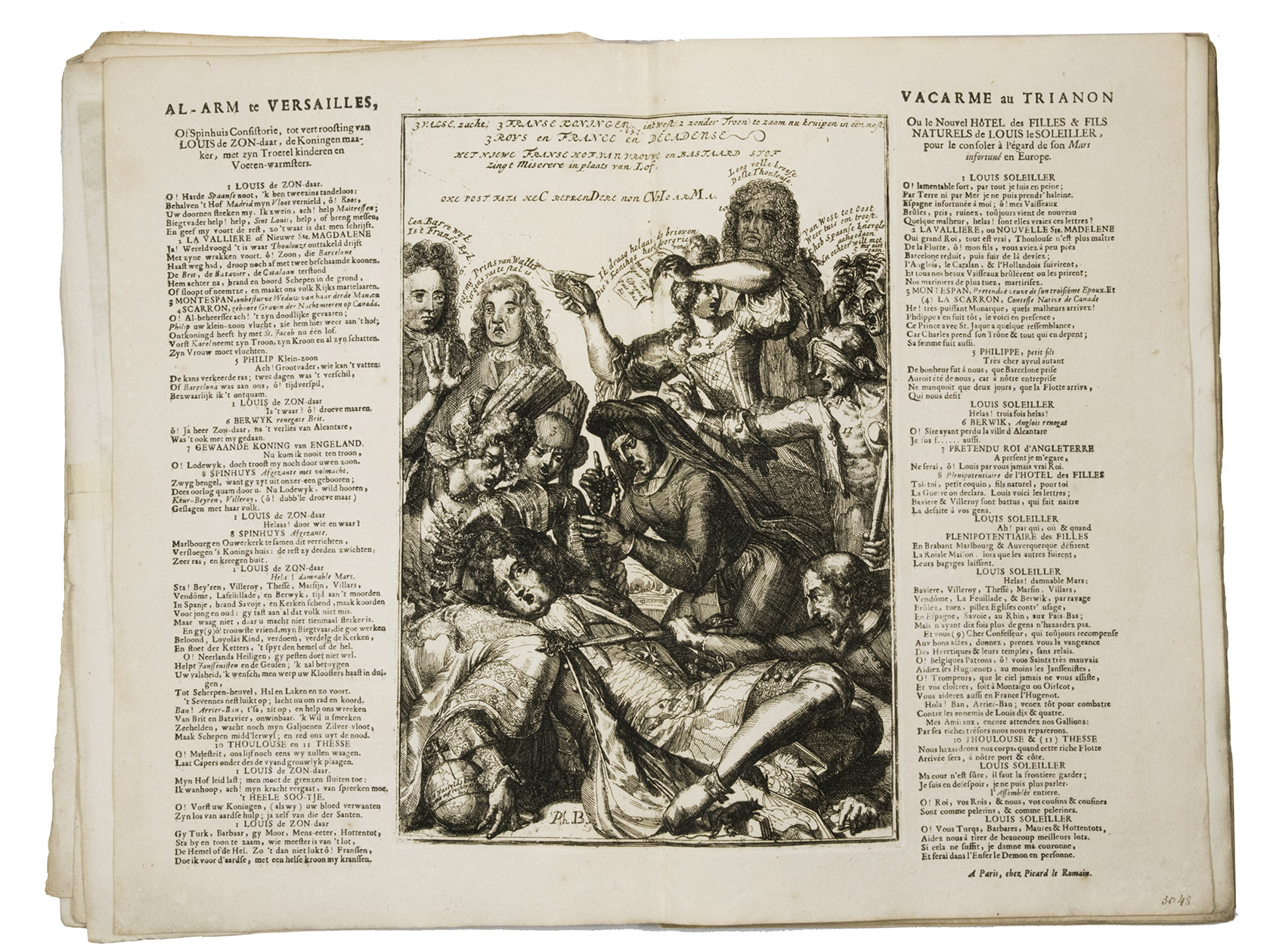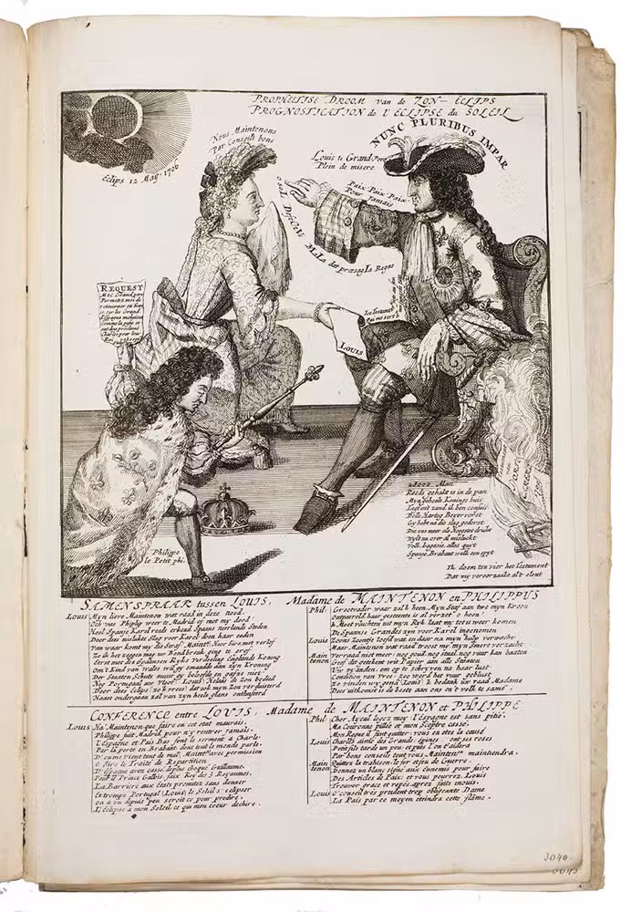 Extremely rare complete emblematic print series (plus alternative versions of several prints) mercilessly satirizing and ridiculing King Louis XIV of France, his grandson King Philip V of Spain, the Marquise de Maintenon (whom Louis XIV had secretly married after she had been his mistress for years), many others in Louis XIV's court and his allies in the War of the Spanish Succession (1700/01-1714). Most prints, like the title-page, have texts in both Dutch and French. The title and many of the prints gleefully note the total eclipse of the sun that occurred on 12 May 1706, supposedly the day Philip V abandoned his siege of Barcelona (which had been taken by the British six months earlier), presenting it as the total eclipse of the Sun King.