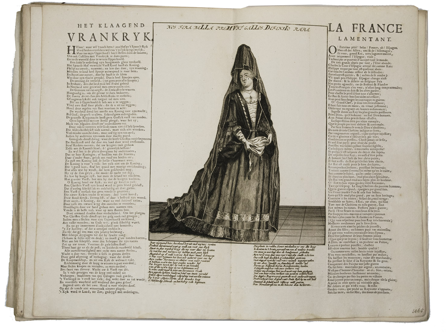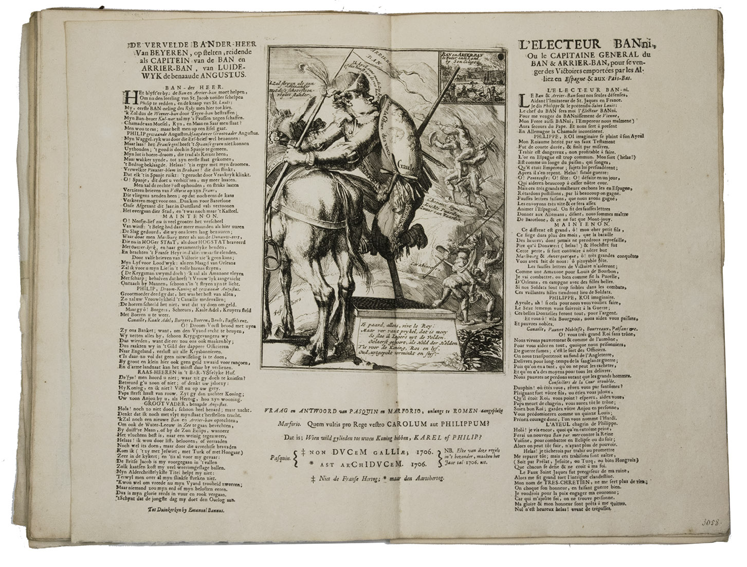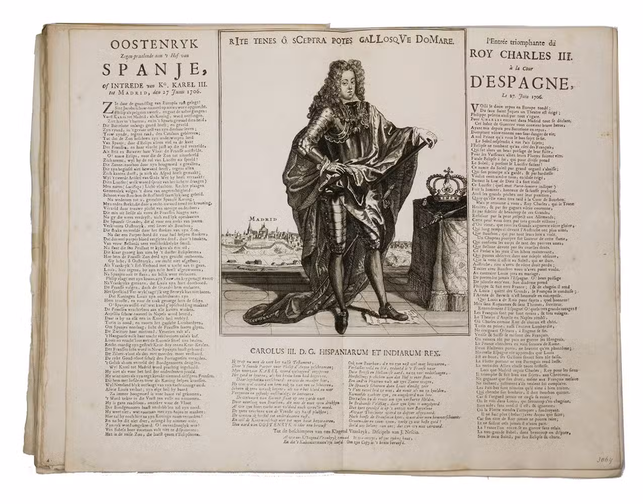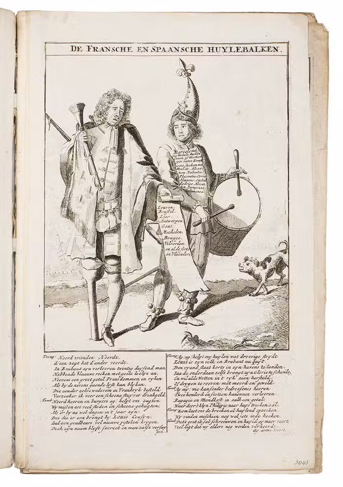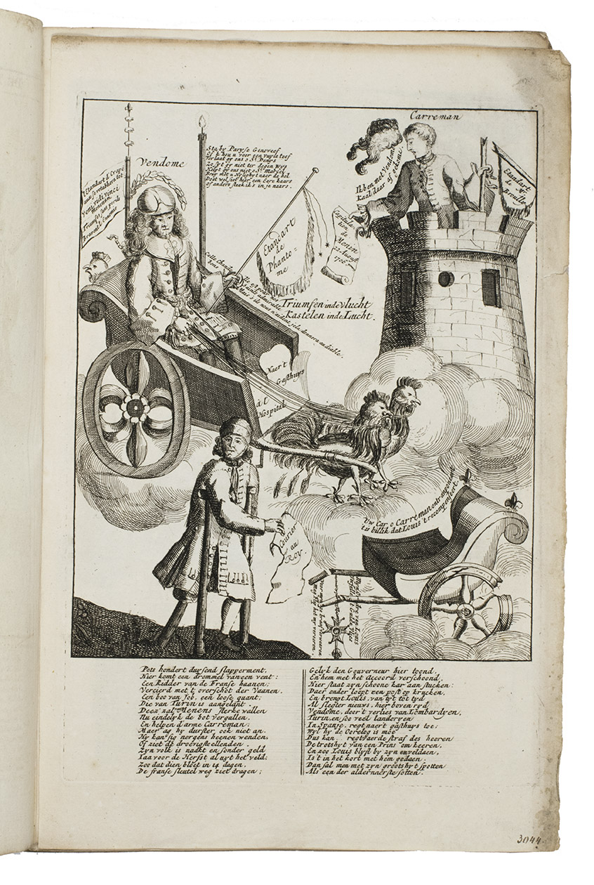 Extremely rare complete emblematic print series (plus alternative versions of several prints) mercilessly satirizing and ridiculing King Louis XIV of France, his grandson King Philip V of Spain, the Marquise de Maintenon (whom Louis XIV had secretly married after she had been his mistress for years), many others in Louis XIV's court and his allies in the War of the Spanish Succession (1700/01-1714). Most prints, like the title-page, have texts in both Dutch and French. The title and many of the prints gleefully note the total eclipse of the sun that occurred on 12 May 1706, supposedly the day Philip V abandoned his siege of Barcelona (which had been taken by the British six months earlier), presenting it as the total eclipse of the Sun King.